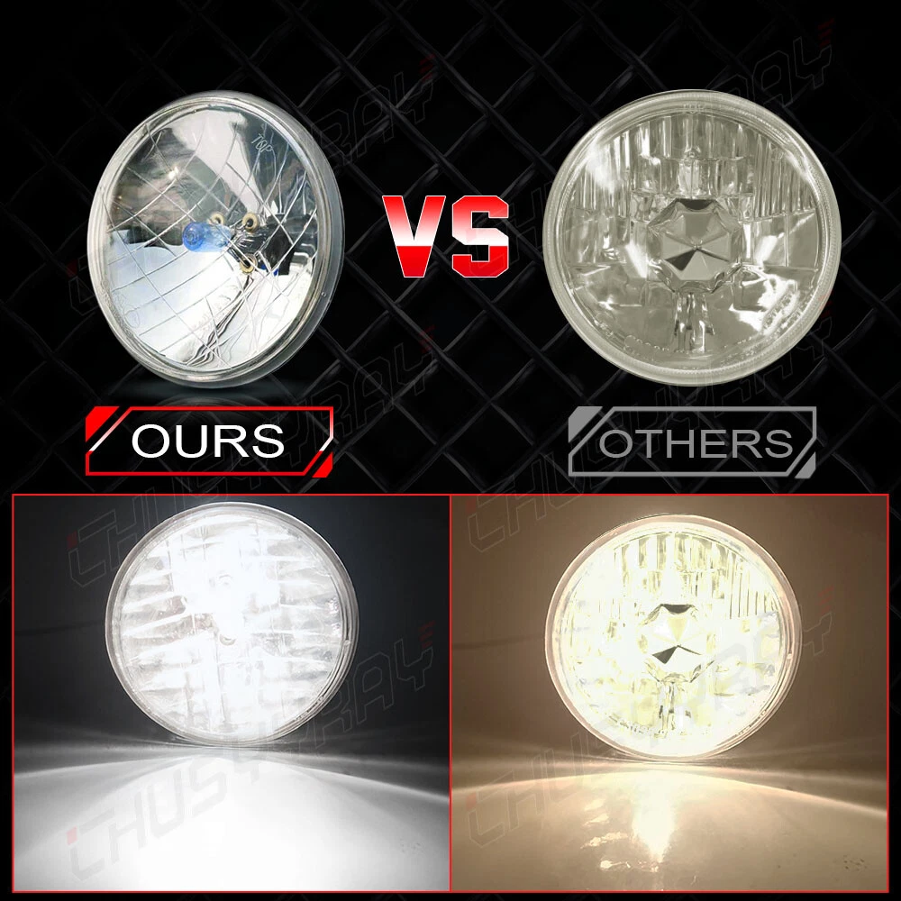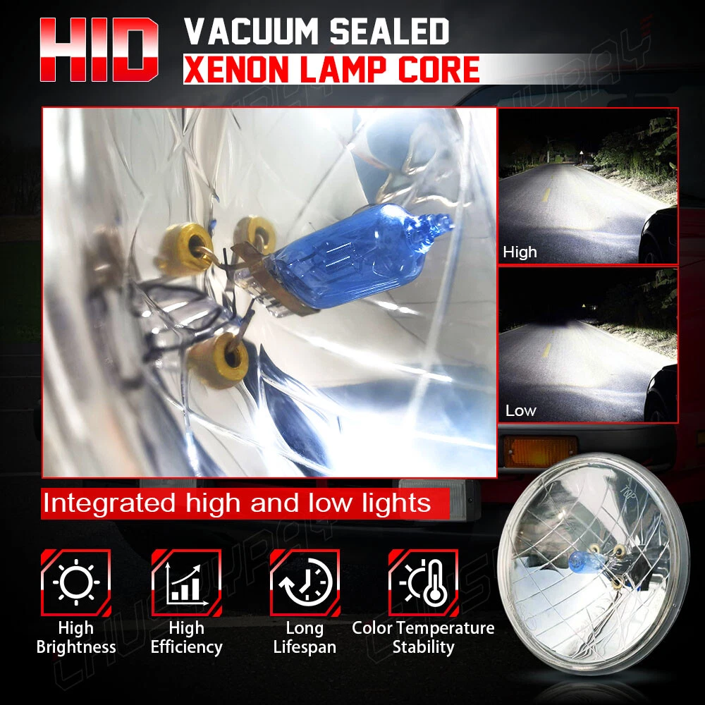 THESE ARE HALOGEN SEMI-SEALED BEAM STOCK STYLE GLASS FACED HEADLIGHTS WITH METAL BACKSIDES! REPLACEABLE SUPER WHITE 100/130 W HALOGEN H4 BULBS INCLUDED! Stock Style H4 Replacement Upgrade Headlights Pair - High Beam Headlight Pair 100/130W Dual Beam Super White Halogen Bulbs Glass Lens / Metal Backside DOT SAE Approved This listing is for 4 pcs new 5-3/4" stock style glass faced halogen H4 conversion headlight bulbs. These halogen semi-sealed beam headlights look almost the same as the original headlights your vehicle came with when it was new, except these light up 200% brighter then the stock style incandescent bulbs and take a replaceable 100/130W super white H4 bulbs. These have the original shaped prongs on the back so they will plug right into your original wiring harness plugs. These have the correct locating tabs on the backside to clock properly into the high beam headlight buckets. These are correct for any car or truck that has 4 round glass headlights. Each bulb is 5 3/4 inches in diameter. DOT SAE approved. Notes: 1. 100% Brand New in the box with manufacturer packaging, never been installed before. 2. Factory bolt-on OE fitment, no vehicle modifications are required; or replacement for the stock unit. 3. No installation guide or instruction included, professional installation recommended. 4. We Provide 60 day manufacturer warranty after you received this Item. Product Features: 1. Great upgrade for your vehicles exterior looks. 2. Direct replacement of the original lights, no modification needed,A great upgrade for your vehicle. 3. Precision optics offers a highly controlled concentration of light to enhance visibility. 4. Enhance visibility during night time, heavy rain, snow, or dense fog. 5. High quality OE grade materials to withstand the most rigorous weather conditions. 6. The Halogen bulbs are included. H4 bulb is compatible with the headlight. Package Includes: 4x Headlight (Pair Passenger and Driver Side) with Halogen Bulbs On Dec 16, 2024 at 17:48:31 PST, seller added the following information: