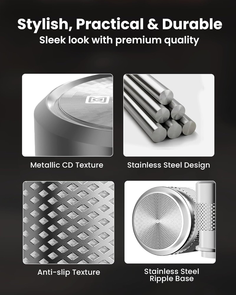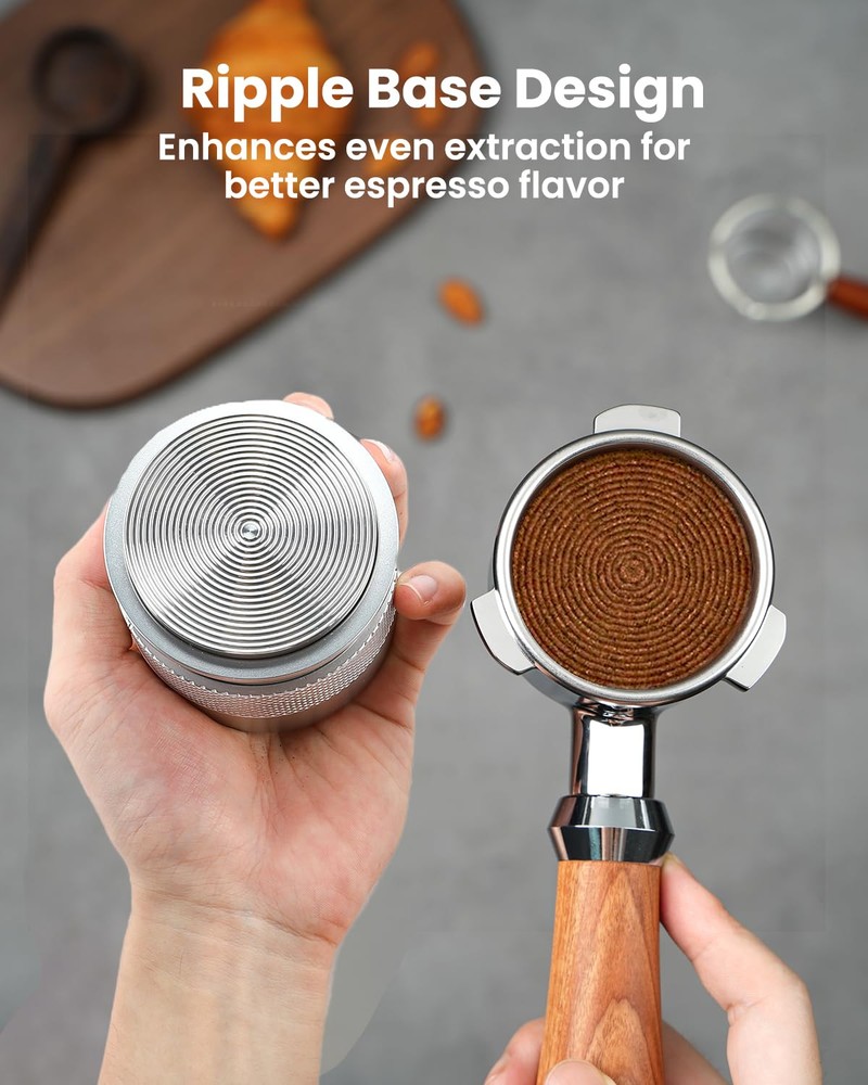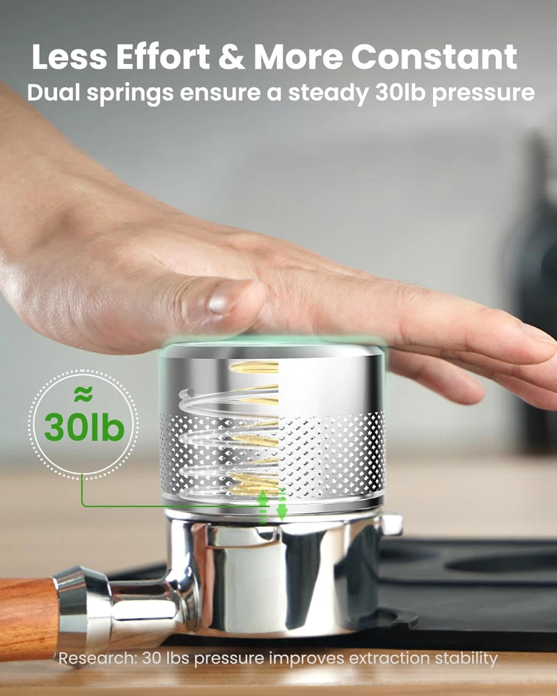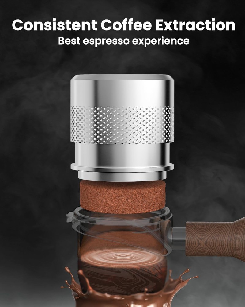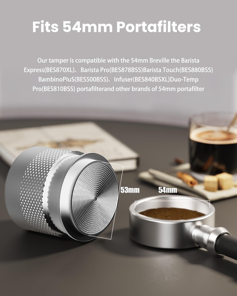 Precision Fit: 53mm stainless steel tamper, tailored to Breville's 54mm portafilter baskets, compatible with Barista Express, Pro, Touch, Bambino Plus, Infuser, and Duo-Temp Pro 30lb Spring Loaded: Built-in dual springs provide 30lb of pressure for more effortless use, non-slip texture, frosted texture, great experience for baristas. More Comfortable & Even Pressure: Revolutionize tamping with our ergonomic, handle-free tamper. Its cylindrical shape offers auto-leveling for an even press, reducing RSI risks. Enjoy a more comfortable coffee making process. Consistent Extraction: Ensure uniform grounds distribution and pressure, empowering you to effortlessly craft the perfect shot at home. High-quality for Baristas: Master Your Brew with the 53mm Coffee Tamper! Its stainless steel design and threaded base optimize extraction, giving you even, flavorful shots every time. Elevate your home barista game and explore a world of coffee perfection. Pro Tips: Fill your portafilter basket with coffee grinds for optimal tamping pressure, yielding a tighter pack and richer flavor. Groom the basket's top with a finger or flat edge before leveling and tamping. Brew with premium filtered water for the best results.