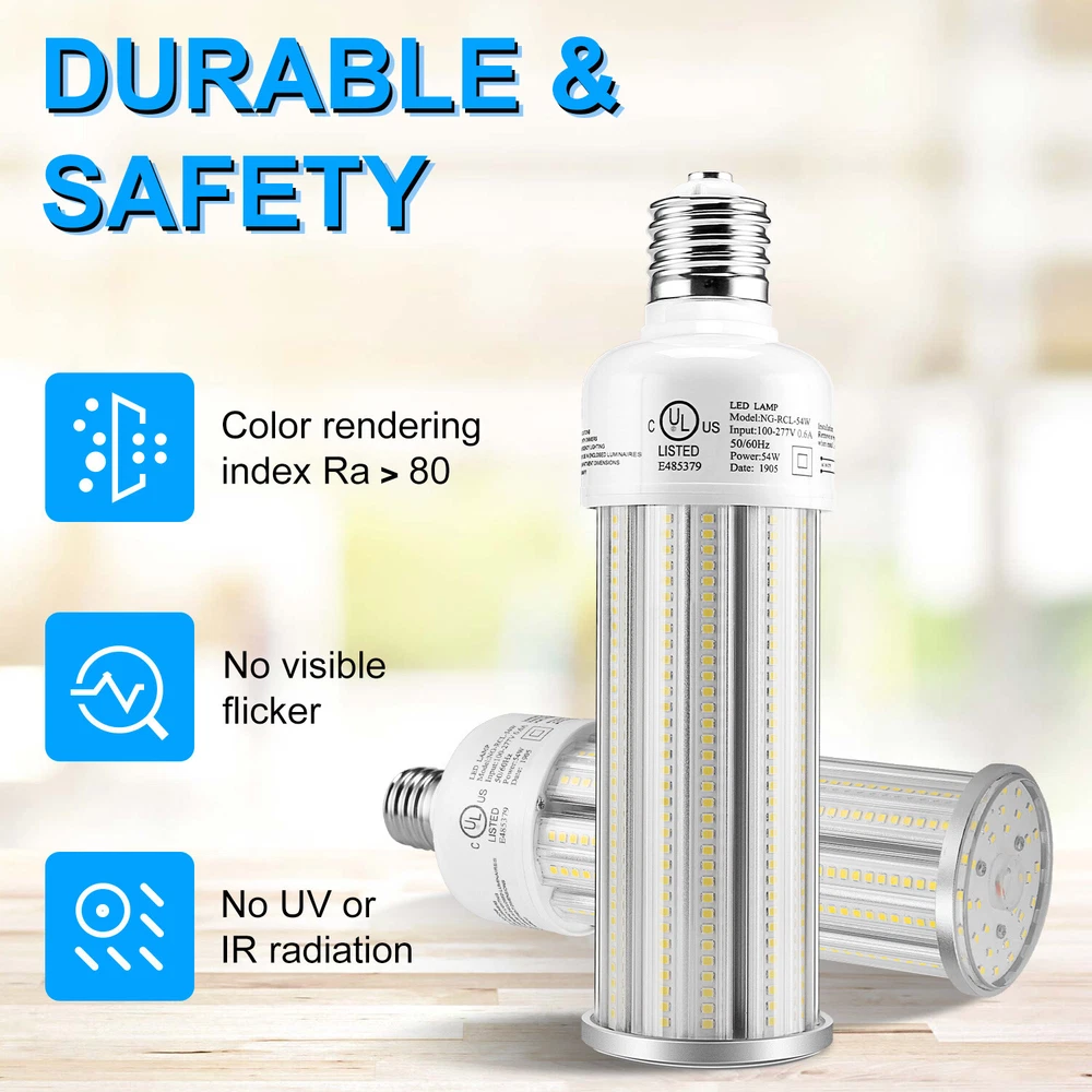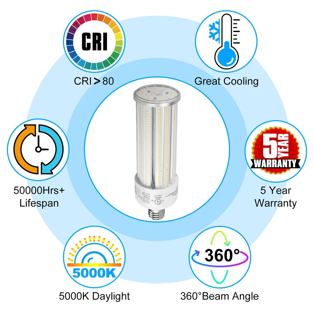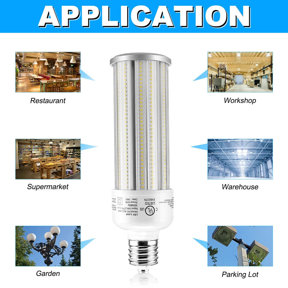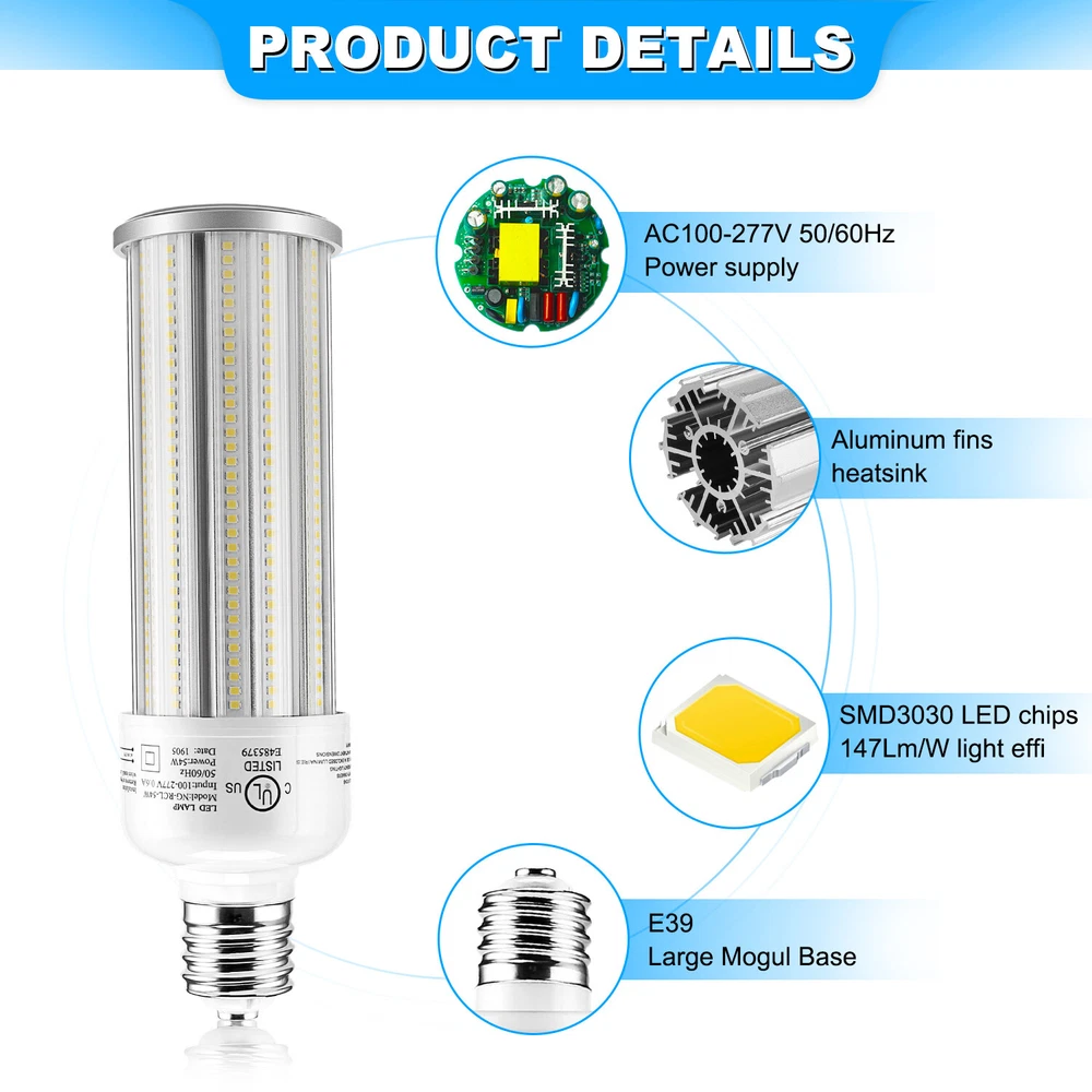 Product Description 54W LED Corn Light Bulb 5000K Daylight Warehouse Workshop High Bay Lamp E39 Base Specification Rated Power: 54W Base Code : E39 Light Bulb Base Type : Medium/Mogul Power Factor: >90% Input Voltage: AC100-277V 50/60Hz LED Type:SMD2835 LED chips with 130-150Lm/W Luminous Flux(lm): 7,830Lm Color Temperature: 5,000K Color Rendering Index (RA) : >80 PFC: >90% Materials: Aluminum+ASA Certification: cUL&DLC Not dimmable High Lumens Output With a lumen output of 7,830 Lumens and Lumen Efficacy of 145 Lumens/Watt, Our LED retrofit corn light bulb will bring in more brightness than any traditional MH light. 10 Years lifespan With a lifespan of 50,000 hours which means it can work for more than 10 years if it works 13 hours a day. this premium LED bulb will have your back for years. Save up to 80% on Your Energy Bill A replacement to 100-200 Watt Metal Halide bulb, the LED retrofit corn bulb helps save up to 80% on your energy bill. Low Maintenance cUL listed ensure the bulb quality. Our support cover any defects or quality control issues and will keep you on the safe side. It will reduce maintenance costs too. cUL Listed Our LED retrofit corn bulbs are all commercial and industrial grade. Compare with the other cheaper LED bulb, ours have successful won cUL listed. High Quality LED Driver LEDs have long lifetimes if powered by a quality driver. Constructed of fully sealed driver, 6000K high voltage surge tested ensure the LEDS safety. Die-casting Heat Sink Die-casting heat sink increases thermal transmission. Our LED corn bulbs don't have fans but still can use in enclosed fixtures. No fan, No Noise. E26/E39 Base Easy "upgrade" to an existing light fixture with E26/E39 Base. About Us Payment Shipping Terms Returns Contact Us 1. 10 Years LED Light Manufacturer 2. Certified Safety LED Light Products 3. US Warehouse Fast & Convenient Delivery 30,000 sq.ft production area &100 employees professional team. UL,cUL,cETL,ETL,DLC approved products standard produce by certified request. 6 separately production line strictly control quality & speed production Professional Aging test machine&SMT Machine&IES test system&Reflow oven 1. We only accept payment by PayPal . Your ebay address must match your paypal address. PO BOX can not delivered. 2. Please make payment within 7 days. If you don't need it, please inform us to cancel it, for eBay will open UNPAID dispute automatically in eighth day. 3. Paypal allows you to complete your purchase quickly and securely. It offers a variety of payment options including all the major card carriers. ★★★ ★ ★ USA Warehouse! 2-5days Fast shipping! 1. We will ONLY ship item to eBay physical Paypal address. Your eBay address must match Paypal address. 2. We ship daily Monday - Friday . All orders will be shipped within one working day after payment. 3. Tracking number will be upload on ebay within 24 hours after shipment. 4. Shipping Time: 2-5 working days for US buyers. ★ ★ ★ All of our products are shipped from our 3 different warehouses in the US.(KY/OH/TX) 1. Please kindly CONTACT US via eBay message if there is any problem, instead of Open Case or Return Requests, We will always try our best to solve the problem for you. 2. We provide a 30 days satisfaction or return guarantee for exchange or refund. 3. The package must be in its original packaging and include all of the original accessories or items that came with it when returning an item. The item and package should be in original and perfect condition. 1. Sellers pay return shipping costs. Sellers pay for return, replacement or exchange shipping if there's a problem with the item. For example, if the item a. Doesn't match listing description b. Damaged or defective when received c. Missing spare parts d. Counterfeit or imitation goods 2. Buyers need to pay return shipping costs. If the buyer changes mind about a purchase and wants to return an item, there may need to pay return shipping costs. For example a. Chose the wrong size or feel that the product is not suitable for buyers himself b. No need this product after received c. Find a more suitable price elsewhere than choose a return. 1.Office Time: 9:30 - 18:30, Monday - Saturday (UTC+8) 2.Please contact us with eBay Messa ge . 3.We will respond you within 24 hours on business day. Your feedback is very important to us, please leave us a Positive Feedback with all 5-star for the Detailed Selling Rating when you received the item. If there is some problem about the product, please take communication with us before leaving neutral/negative feedback or opening ebay/paypal case, we will do our best to resolve your problem. We try our best to reply to your emails as soon as possible, however, due to high volume of daily incoming emails and time zone difference; we may not be able to reply your emails immediately. Please allow 24 business hours for us to response. About Us 1. 10 Years LED Light Manufacturer 2. Certified Safety LED Light Products 3. US Warehouse Fast & Convenient Delivery 30,000 sq.ft production area &100 employees professional team. UL,cUL,cETL,ETL,DLC approved products standard produce by certified request. 6 separately production line strictly control quality & speed production Professional Aging test machine&SMT Machine&IES test system&Reflow oven Payment 1. We only accept payment by PayPal . Your ebay address must match your paypal address. PO BOX can not delivered. 2. Please make payment within 7 days. If you don't need it, please inform us to cancel it, for eBay will open UNPAID dispute automatically in eighth day. 3. Paypal allows you to complete your purchase quickly and securely. It offers a variety of payment options including all the major card carriers. Shipping ★★★ ★ ★ USA Warehouse! 2-5days Fast shipping! 1. We will ONLY ship item to eBay physical Paypal address. Your eBay address must match Paypal address. 2. We ship daily Monday - Friday . All orders will be shipped within one working day aft