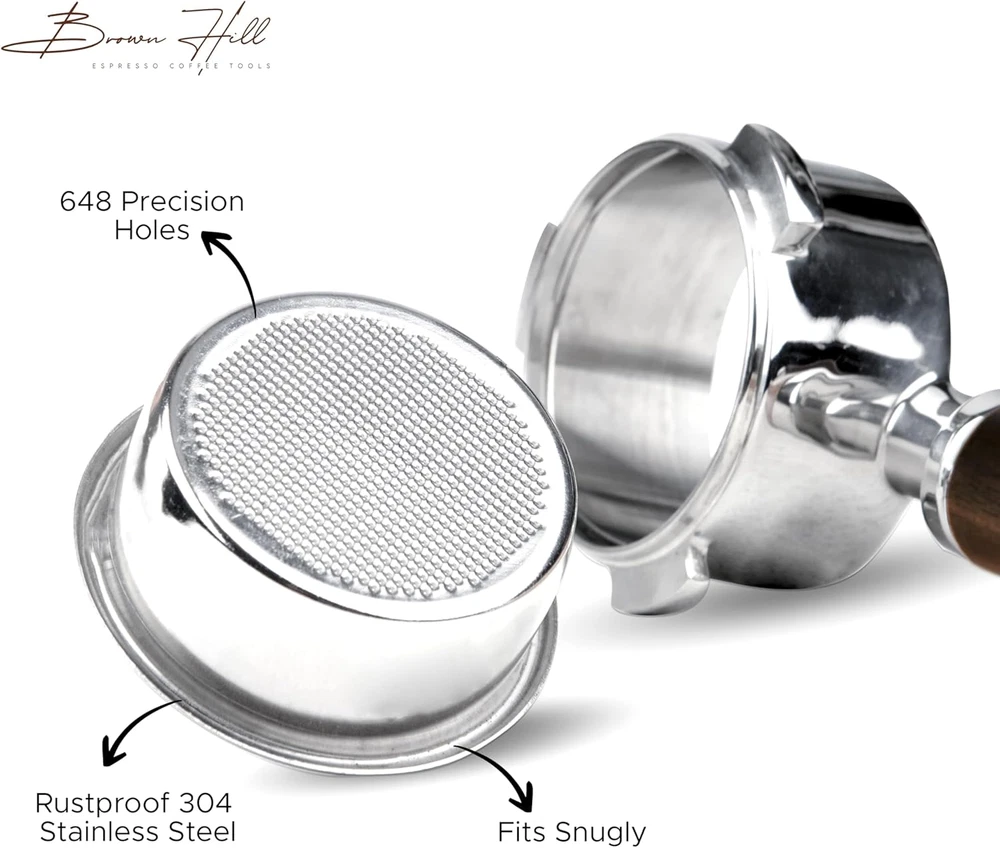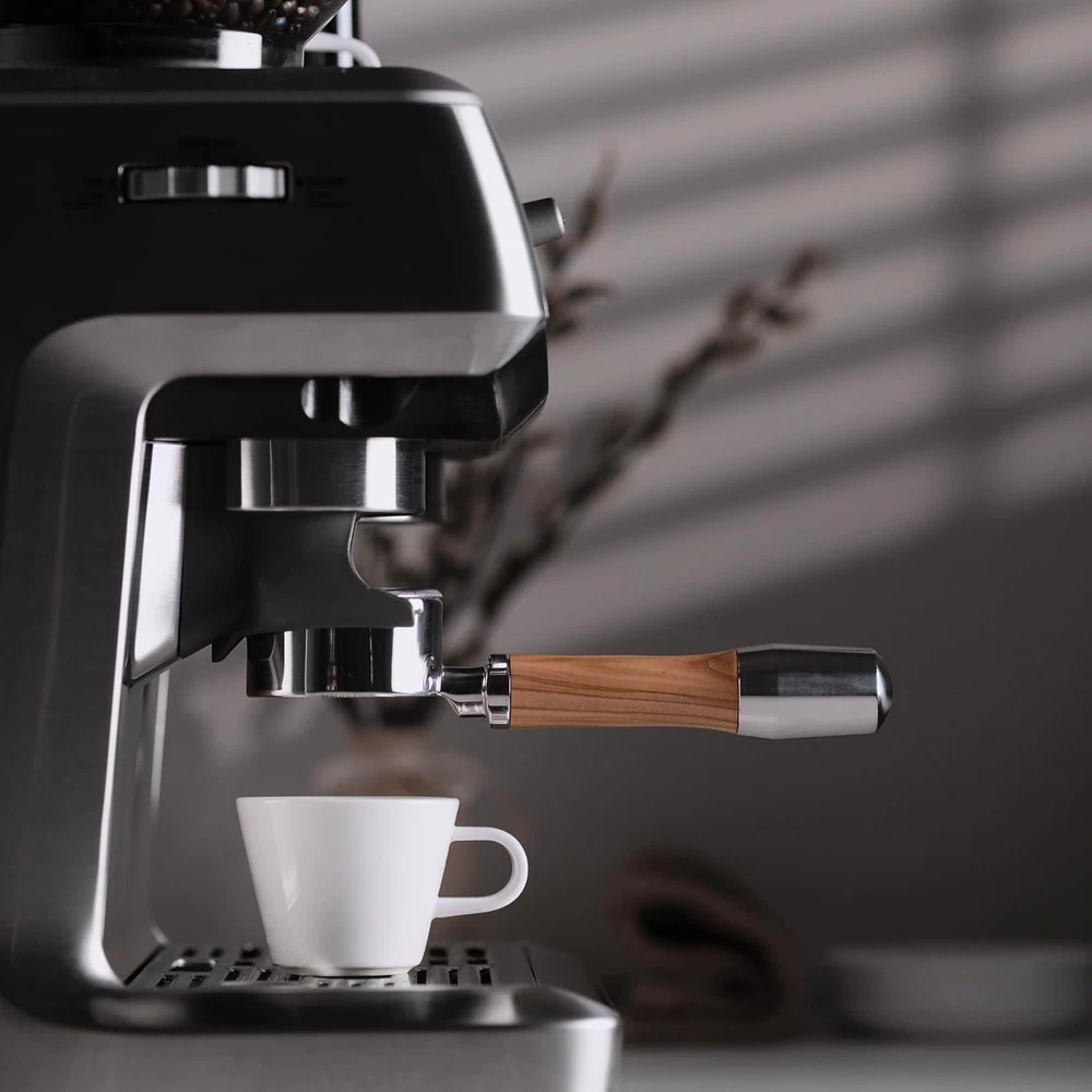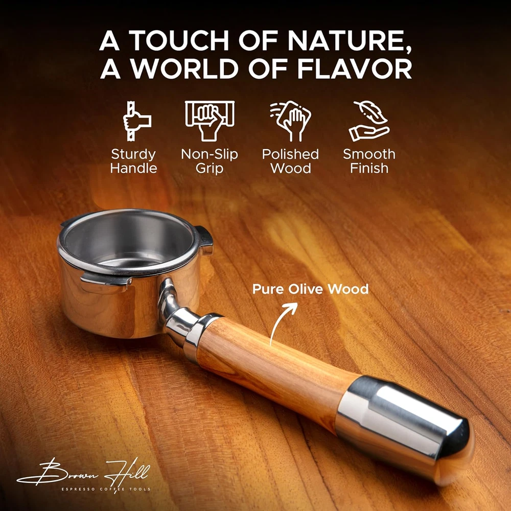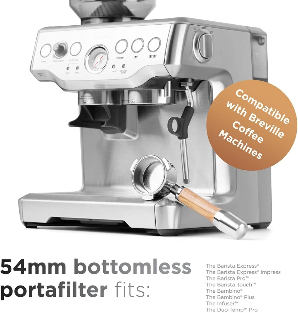 PERFECT FIT - This premium portafilter 54mm is the perfect fit for any 54mm Breville Espresso Machine – specifically designed with a 54mm head to provide maximum compatibility across Barista Express, Pro, Touch, Bambino, Bambino Plus, Infuser, and Duo-Temp Pro models. PRECISION FILTER BASKET - This 54mm bottomless portafilter has been expertly constructed to provide precision extraction that unlocks the exquisite flavor of the crema and espresso. Featuring 648 precision machining holes, this filter basket delivers rich and smooth espresso with every cup. PREMIUM MATERIALS - Crafted entirely of 304 food-grade stainless steel that won't rust, this 54 mm portafilter helps to protect the original taste and aroma of coffee beans, ensuring your cup is as delicious as ever. WOODEN HANDLE - This versatile 54 mm bottomless portafilter is designed for convenience, featuring a 100% natural olive wood handle for a beautiful and timeless finish. This bottomless portafilter is both functional and beautiful, with a design that promotes accuracy and precision during brewing. SLEEK DESIGN - With its sleek and elegant design, the 54mm portafilter is designed to elevate the espresso experience of any home barista. Product Description