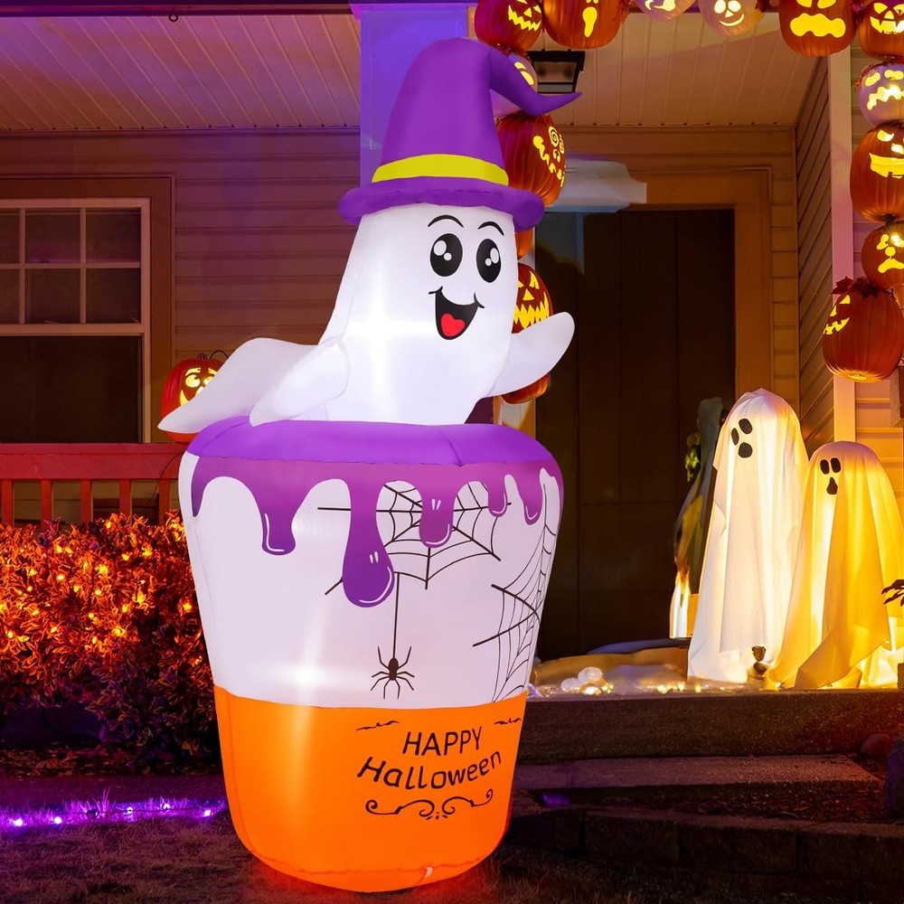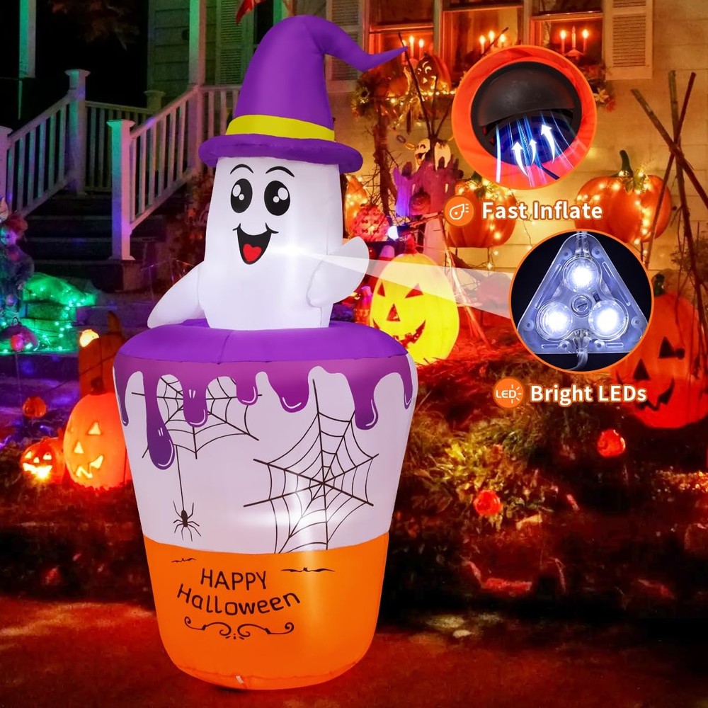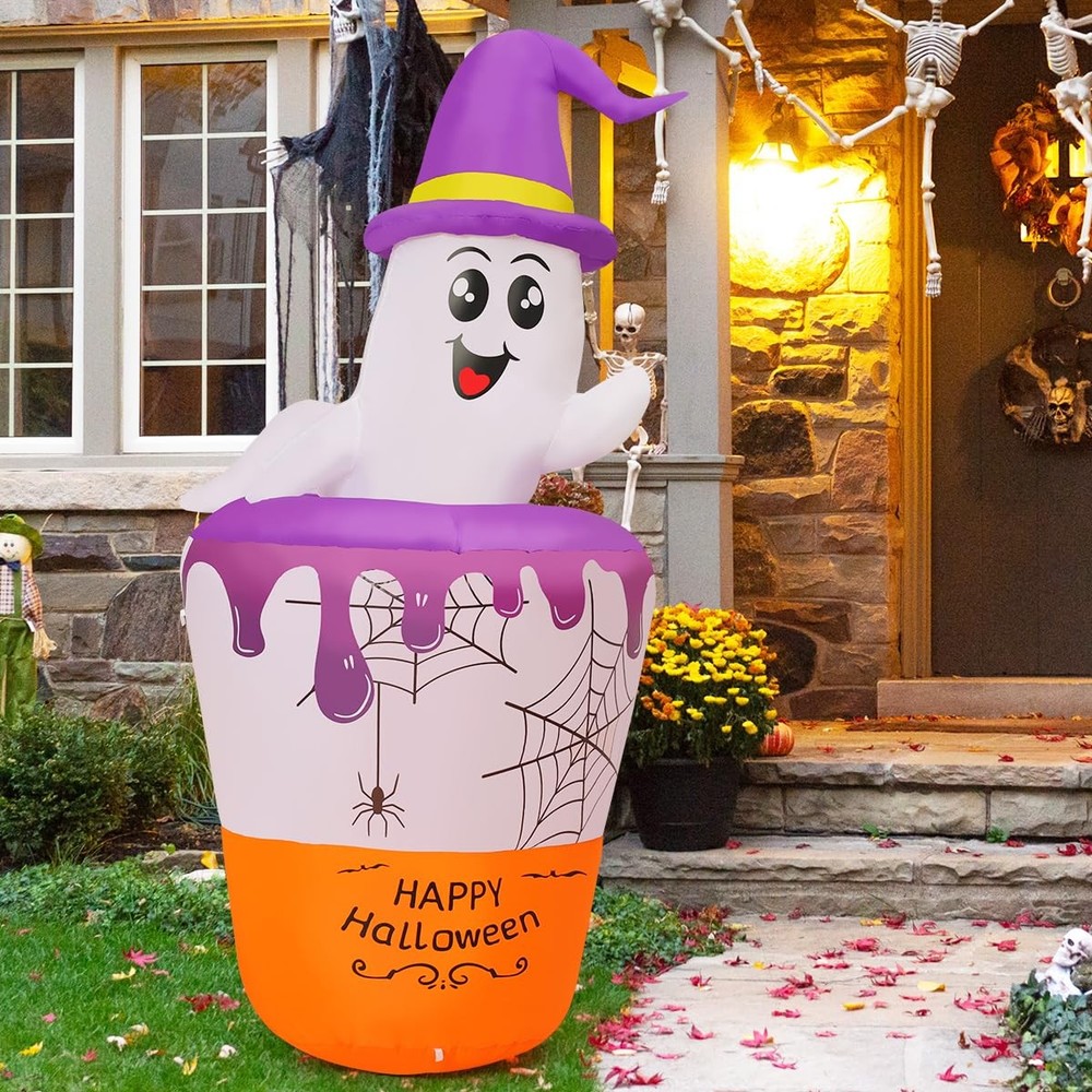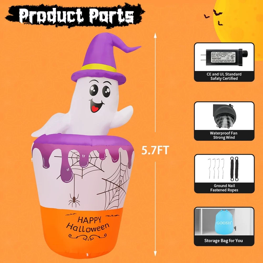 Why choose Inflatables? PREMIUM QUALITY -- CE and UL standard certified adapter. Equipped with a strong build-in-blower, just need to plug it in and it can be blown up in a short time. PERFECT INFLATABLE COSTUME-- Adorable shape, which is a perfect inflatable decoration for home and outdoor. Enjoy time with your family and friends has been committed to producing better inflatable products for decades. We strive for your shopping experience Ghost Inflatable Decoration: Cute ghosts look very funny bathing in the witch's magic potion; Our ghost has built-in LED lights, it not only decorates your patio, but also brings laughter and surprise to every guest Excellent Craftsmanship: The Halloween blow up decorations are made of high-strength waterproof polyester which is against rips and tears, the excellent stitching improves the duration of the Halloween decorations; This ensures the holiday yard decorations can operate normally in rain and wind Easy Inflation and Deflation: The ghost with broom inflatable Halloween with an Waterproof Powerful Blower; Just zip it up and plug it in, and it will fully inflate in one minute; Unplug it and open the bottom zipper, the blow-up can automatically deflate Stable and Safty: Besides the blower and storage bag, our blow-up comes with rope and ground stakes to keep the inflatable firmly on the ground; The CE and UL adapter with a 10 FT power cord means you can safely place it anywhere in your home, yard, or garden Customer Service: is a professional inflatable decoration company in the united states; If you have any questions, we are here for you