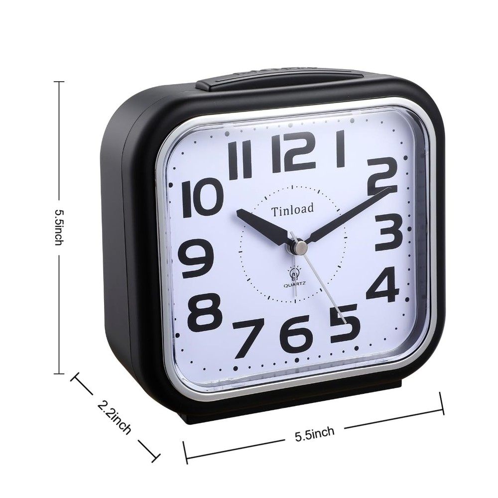 Large analog Alarm Clock Big and intuitive number display on a white dial enable you see the time across the room. Ascending Beep Alarm Ascending four beep alarm volume increases in four stages and lasts for 50 minutes until the alarm is turned off or snooze bar is depressed. Built In Nightlight Simply press the front button to activate for night viewing. Easy to Read Display, Easy to Setup Black numerals on a white dial enable you to see the time Easy. Easy to set up, One knob to set time and another to set alarm time . Made By High Quality Hard Plastic Made by high quality hard plastic ,durable and long last use. Package 1* alarm clock 1* User manual Large Size-- Size: 5.5" x 5.5" x 2.2". Alarm clock stands up at an angle, high quality plastic, square face with white dial, black Arabic numerals, good decoration for tabletop, desk & shelf, bedrooms. Also large size screen and clear bold digits to display time, perfect alarm clock for elderly. Completely Silent-- Super quiet concise design alarm clock without annoying tick tock sound, ideal for those who need complete silence to fall asleep. Snooze and Manual Light-- Snooze and light button locates on easy-to-find top place. Hold button down for 5 minutes snooze or to light up the clock face on demand to see the dial momentarily in the darkness. PRESS TO LIGHT- NO auto-light. Gentle Wake Increasing Volume-- Classic beep alarm sounds, designed to ascending four stages for gentle wake at first, then ascend in volume with more and more hurried sounds, which last for nearly 1 hour or stop/suspend when alarm is turned off or snooze bar is depressed. Battery Powered-- Runs on 1 "AA" Battery (not included ).