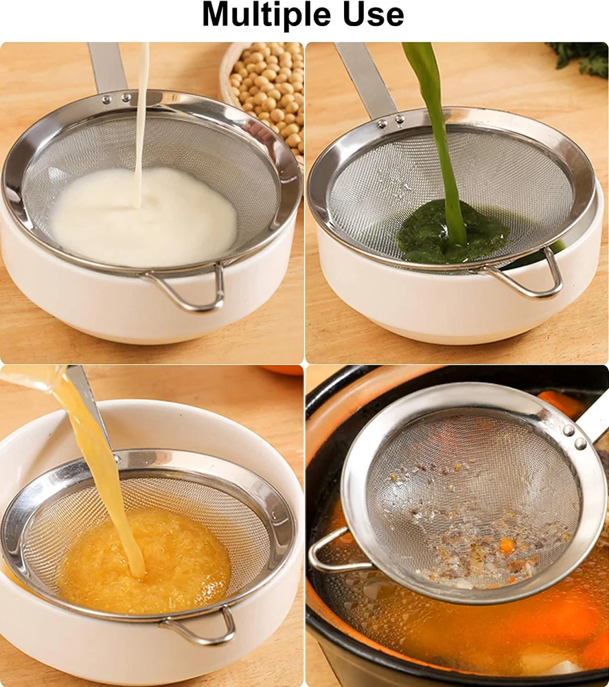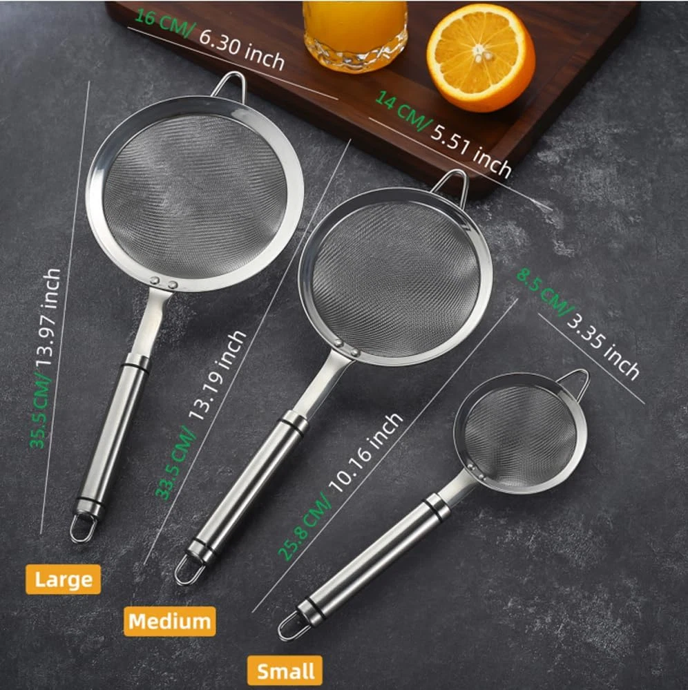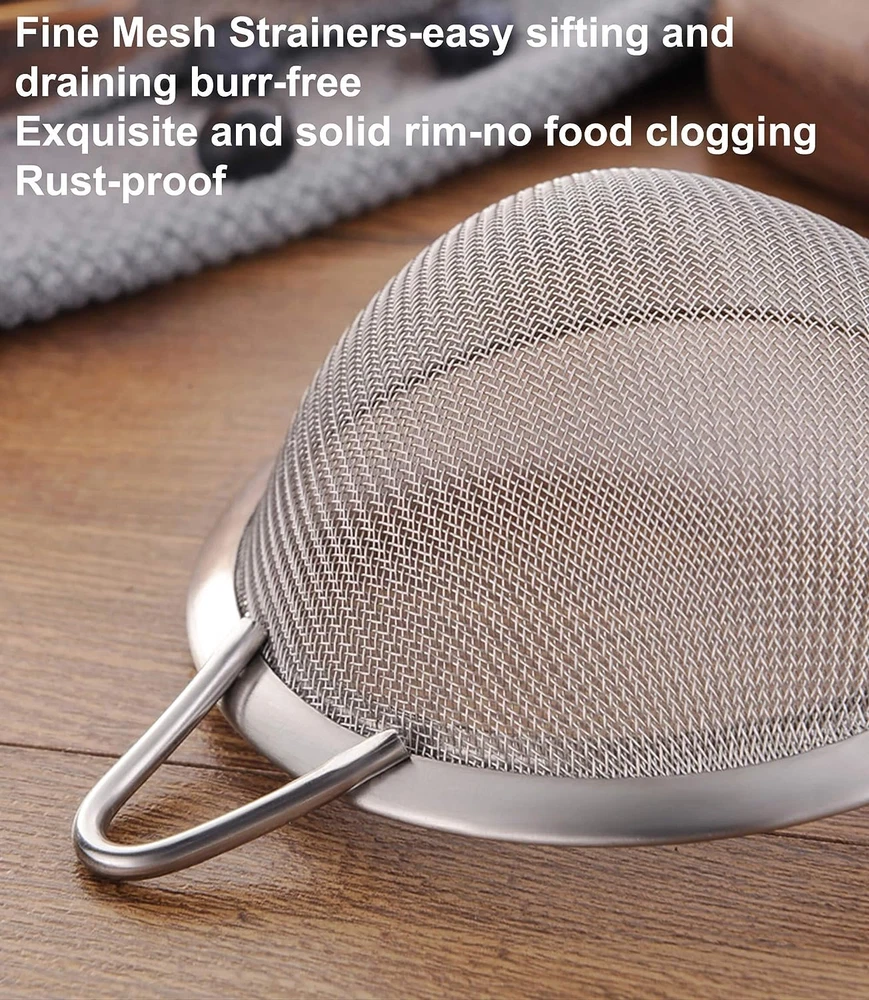 Food-Grade 18/8 Stainless Steel: INCLUDED: 5.5″skimmer spoon. Made of premium 304 stainless steel, which is known for its excellent rust resistance and durability. Built to Last: Feature broad rimmed framework design and rivet connection technology makes the fine mesh strainer more robust and not easy to loosen. 30-Mesh Fine Mesh with No Burrs: Allows for easy filtering and sieving various ingredients, such as tea, coffee, rice, milk, cocktails, sugars, pasta, flour, fruits, vegetable, Oil,juice,making your food smoother and more refined. Easy to Clean: The fine mesh design allows for easy cleaning. Hand wash or Dishwasher safe. Easy to Store: Top quality kitchen utensils. Lightweight enough to store in a kitchen cupboard or hang up for easy access. Instructions: 1.Before using the Fine Mesh Strainer, please clean it first. 2.Pour the ingredients that need to be filtered into the Fine Mesh Strainer. 3.Gently shake the Fine Mesh Strainer to let the ingredients pass through the fine mesh. 4.Take out the filtered ingredients and clean the strainer with soap and water. The Fine Mesh Strainer is a must-have kitchen tool suitable for filtering and sieving various ingredients. Made of food-grade 18/8 stainless steel, this product is known for its excellent rust resistance and durability. The 30-mesh fine mesh design allows for easy filtering of tea, coffee, rice, milk, cocktails, and other ingredients, making your food smoother and more refined. The product is easy to clean and suitable for various kitchen tasks, such as cooking, baking, and cocktail making. With the Fine Mesh Strainer, your cooking experience will be more enjoyable!