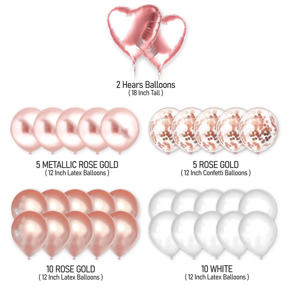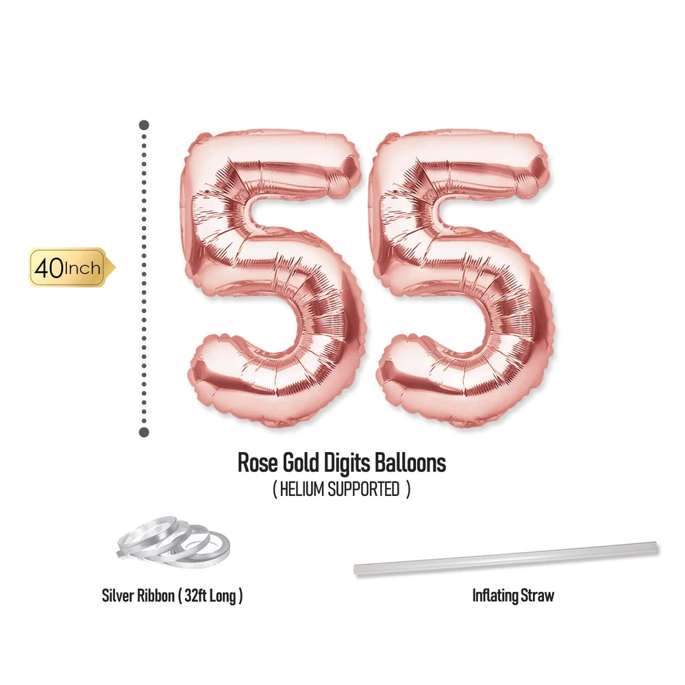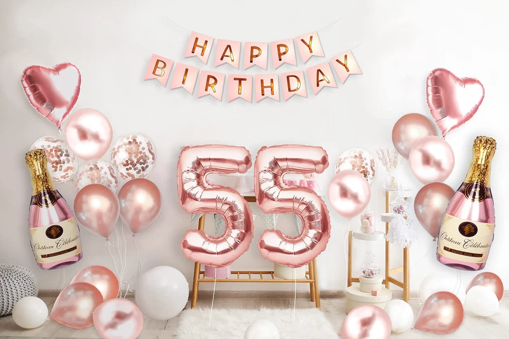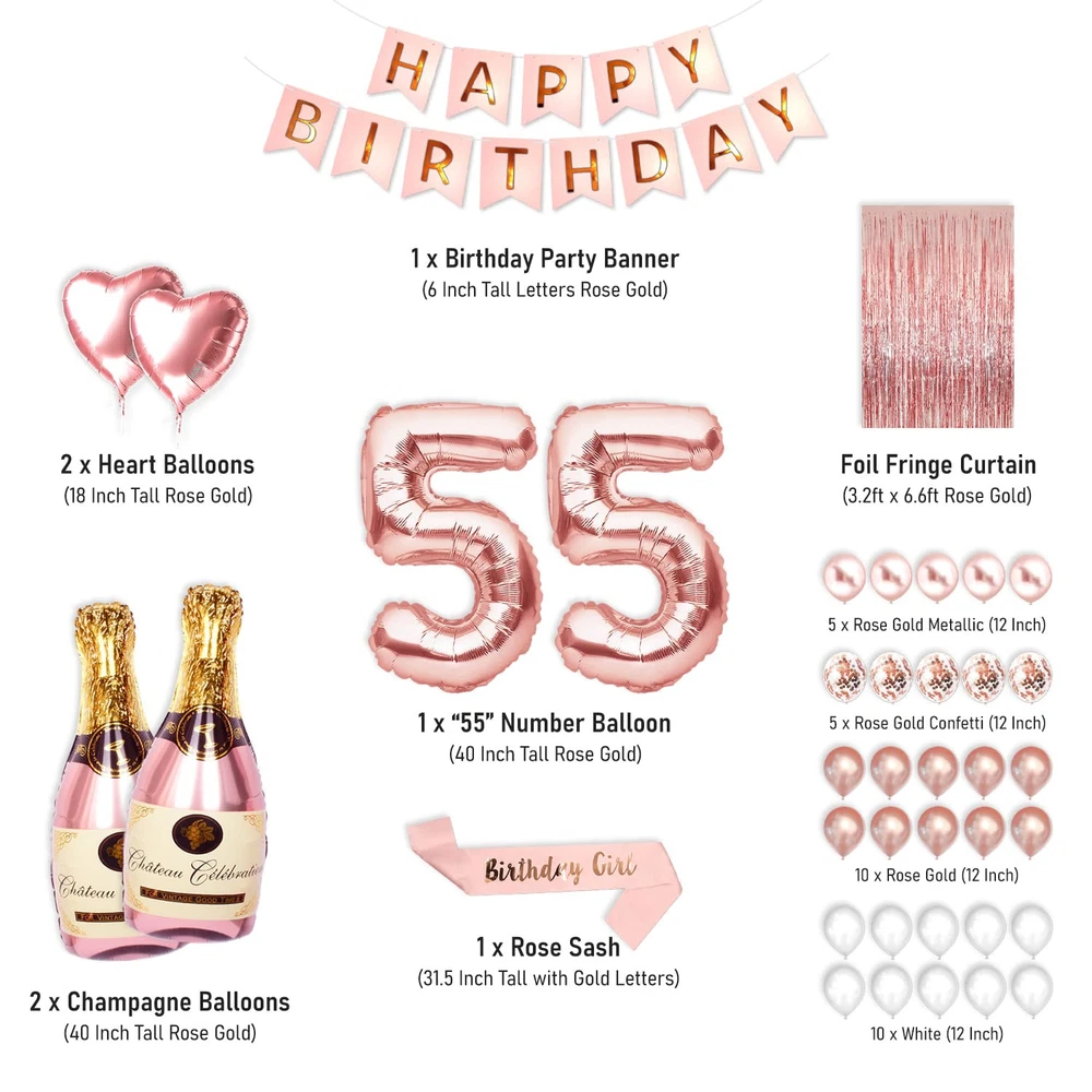 55 Birthday Decorations For Women KIT Includes: 1 X 40inch Number "55" Rose Gold Foil balloons set, 1 X Rose Gold Birthday Decorations Banner(6inch tall letters), 2 X 40inch Rose Gold Champagne Bottle foil balloons 1 X Rose Gold Foil Fringe Curtain(6.5fit x 3.2fit), 2 X Rose Gold Heart Foil Balloons(18inch), 10 X Rose Gold Confetti Balloons(12inch), 10 X Rose Gold Metallic Balloons(12inch), 10 X White Latex Balloons(12inch) Huge 40 inch Height Rose Gold Glitter Number "55" Foil Balloons (Helium Supported) that will stand out and make your Birthday Party rock. A must have Birthday Party Banner Sign. This Birthday Party Decorations set includes Rose Gold Birthday Banner with 6inch tall letters and a long ribbon that allows you to adjust the banner for any place. A must have 55th Birthday Party Banner. We strive to provide our customers with only the finest products and most attentive service. So don't delay. Order today! 55 Birthday Decorations For Women KIT Includes: 1 X 40inch Number "55" Rose Gold Foil balloons set, 1 X Rose Gold Birthday Decorations Banner(6inch tall letters), 2 X 40inch Rose Gold Champagne Bottle foil balloons 1 X Rose Gold Foil Fringe Curtain(6.5fit x 3.2fit), 2 X Rose Gold Heart Foil Balloons(18inch), 10 X Rose Gold Confetti Balloons(12inch), 10 X Rose Gold Metallic Balloons(12inch), 10 X White Latex Balloons(12inch) Huge 40 inch Height Rose Gold Glitter Number "55" Foil Balloons (Helium Supported) that will stand out and make your Birthday Party rock. A must have Birthday Party Banner Sign. This Birthday Party Decorations set includes Rose Gold Birthday Banner with 6inch tall letters and a long ribbon that allows you to adjust the banner for any place. A must have 55th Birthday Party Banner. We strive to provide our customers with only the finest products and most attentive service. So don't delay. Order today!
