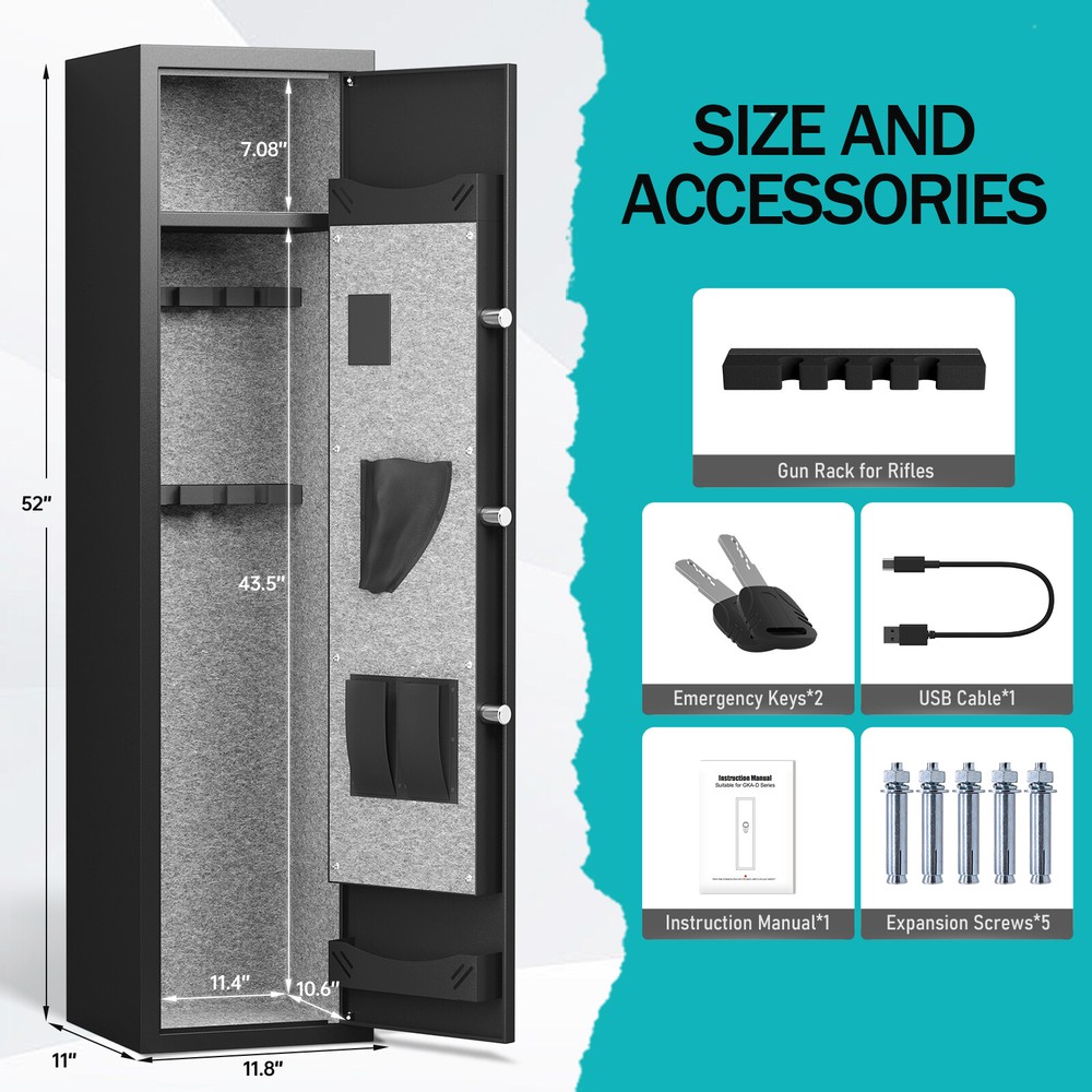5-6 Gun Safes & cabinets, Digital Rifle Gun Safes for Home Rifles and Pistols 【Wider and Deeper Gun Safe】External Dimensions: H51.96''xD11.02''xW11.81''. Wider and deeper than products of the same height,can hold almost 5 rifles up to 51 inches long.The interior features soft foam gun rack and carpeted floor to protect your gun. LED light provide lighting in the dark,allowing you to find your guns in the dark easily. 【Security Gun Safe for Rifles and Shotguns】Rifle safe is constructed from low carbon alloy steel, offering excellent anti-drilling, anti-smashing, and temperature resistance performance. The scratch and stain-resistant powder coat protects the safe from rust and damage. For added security, it can be fixed to the ground, in closets, or any other location. 【Quick Access Gun Safe】The long gun safe for home rifle and shotguns allows you to program your own code for rapid firearm access during emergencies. This gun safe can store 2 sets of digital codes, providing flexibility for multiple users or backup access methods. Additionally, the code memory function ensures that your programmed codes will not be lost even if the batteries are drained, giving you peace of mind and reliable access at all times. 【Dual Alarm System & Mute Function】The gun safe activates its alarm system after 3 consecutive incorrect code. Additionally, a vibration alarm will be triggered if the safe is moved violently. You can cancel the alarm by entering your code or fingerprint to open the door. If you prefer the gun safe to operate silently, you can enable the Mute Function. 【3 Ways to Unlock】The shotgun safe offers 3 convenient methods for unlocking to ensure you can always access your firearms when needed - 1. Code + Handle (Daily Use) 2. Emergency Key + Handle (First opening, forget the code or the batteries drain) 3. USB Type-c Cable + Code + Handle (Batteries drain). 【Complete Accessories & Excellent Customer Service】Includes - 1 x Rifle gun safe, 2 x Emergency keys, 5 x Expansion screws, 1 x USB Type-c Cable, 1 x Instruction manual. If there are any problems with the gun cabinet, please tell us directly, our experienced customer service team will respond within 24 hours and solve the problem.