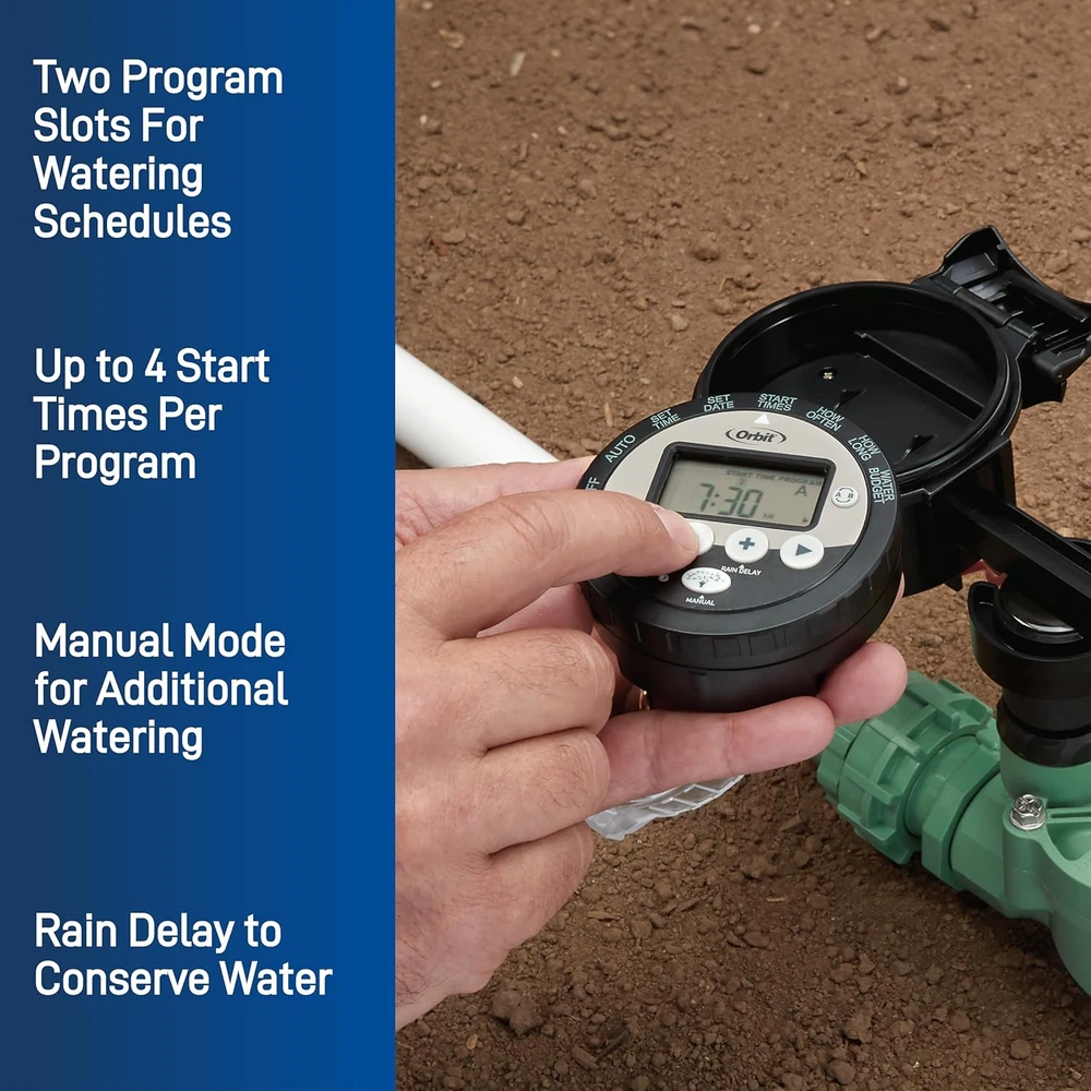 For battery-powered operation of up to 4 automatic sprinkler or drip valves Engineered with high degree of water and dust resistance for outdoor locations Comes standard with one solenoid, adapters for a variety of 24 VAC valves, and mounting bracket; compatible with 24 VAC valves from Orbit, Hydro-Rain, and other major brands A and B program slots allow you to set up to two unique watering schedules; rain delay feature allows you to skip watering of zones during rain or freeze Each program has up to four different start times for cycle and soak windows; manual mode allows you to run one zone, multiple zones, or all zones Introducing the Innovative Battery-Powered Sprinkler Controller with 1" FPT Jar-Top Automatic Sprinkler Valve. Upgrade your garden and yard with this cutting-edge water irrigation timer and automated sprinkler system. No need for sprinkler wires, this timer is designed for hassle-free installation directly to the mainline or as part of a multi-valve manifold. Control up to four valve solenoids simultaneously with our technologically advanced timer. Set up two unique watering schedules for different zones in your lawn. Each program allows four start times, promoting water infiltration and healthy plant growth through cycle and soak windows. The battery-powered timer will automatically "stack" overlapping runtimes, optimizing water usage.Conveniently run one zone, select zones, or all zones with the manual run feature. Ideal for zone testing or supplemental watering. Skip watering zones when Mother Nature takes care of it with the rain delay feature. Installing this comprehensive outdoor sprinkler timer is a breeze. Simply install the valve, insert 2 AA alkaline batteries for a full season of reliable operation, and set the schedule with the removable control dial. Place the mounting clip and timer on the latching solenoid for secure placement. For fast, glue-free installation, we recommend our recommended fittings: 1-inch MPT PVC-Lock for PVC pipes or Blu-Lock for poly pipes.Upgrade your outdoor irrigation system with this dependable, efficient, and technologically advanced battery-powered sprinkler timer. Say goodbye to tedious manual watering and hello to a lush, healthy lawn. Experience the convenience of our innovative water timers for garden and yard. Order now and enjoy the benefits of a smart, automated sprinkler system.