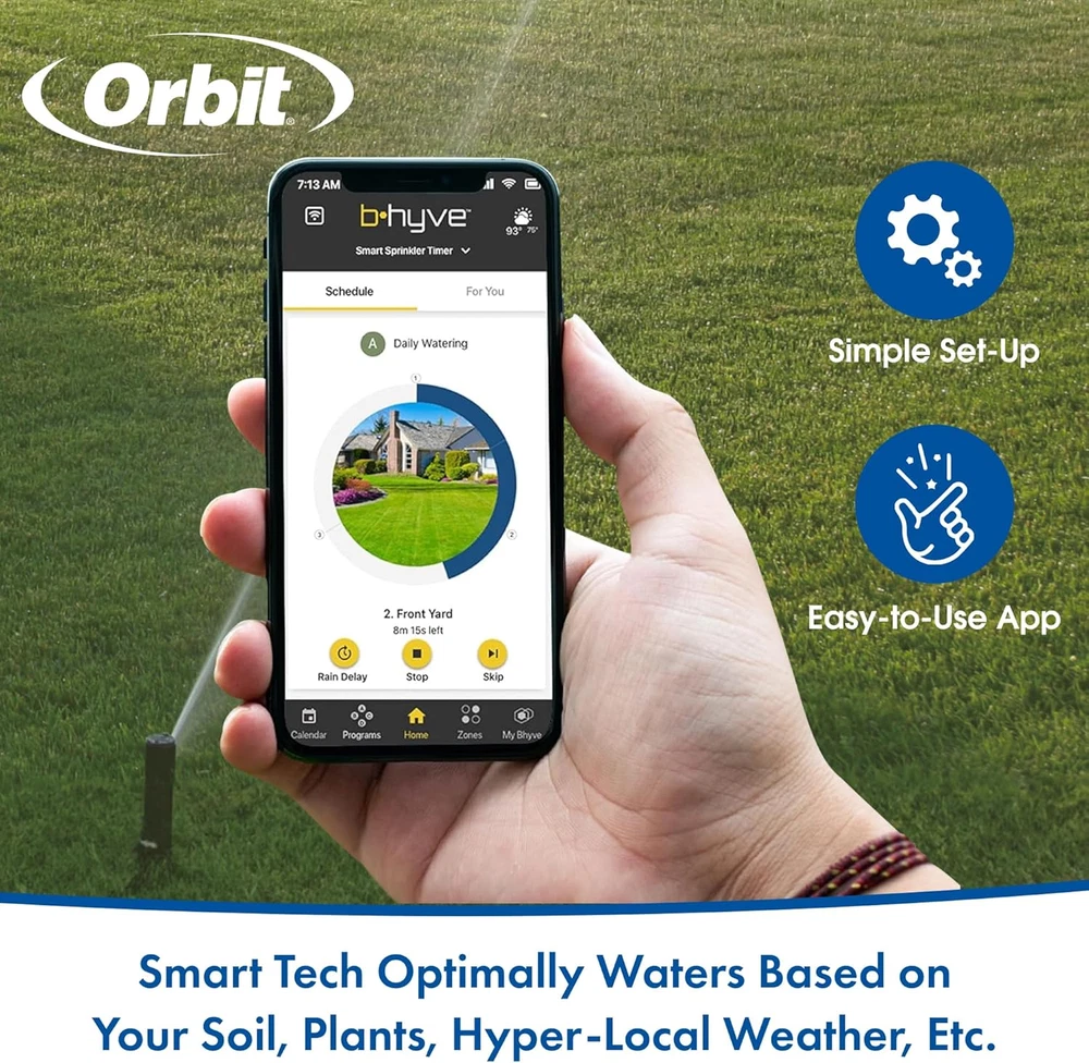 SMART UNDERGROUND WATERING TIMER - Effortlessly manage your watering schedule with our advanced technology. Control and monitor your underground sprinklers from anywhere with WiFi connectivity. WIFI WATERING TIMER - Experience the convenience of remote control and programming with our WiFi-enabled smart timer. Say goodbye to manual adjustments. SMART WATERING TIMER - Optimize water usage and promote healthy plants with our intuitive smart timer. Automated schedules and weather-based adjustments ensure efficient watering. WIFI WATERING TIMER - Take control of your watering system from the palm of your hand. Our WiFi-enabled timer offers easy access and customization through a user-friendly app. ULTIMATE WATER MANAGEMENT - Our smart timer delivers precise water distribution, saving you time, money, and resources. Enjoy a lush, thriving garden while reducing water waste. Elevate your outdoor watering experience with the Orbit B-hyve Smart Watering Timer. As North America's premier residential watering company, Orbit brings you a technologically-advanced solution designed to revolutionize the way you water your plants, lawns, and gardens. With a global presence in over 180 countries, we have been leading the industry in innovative solutions, setting the standard for residential irrigation best practices.This smart timer offers WiFi connectivity, allowing you to effortlessly control and monitor your watering schedule from anywhere. Seamlessly adjust settings through our user-friendly app and set customizable watering durations and schedules, taking into account local weather conditions. By optimizing water usage and promoting healthy growth, you achieve beautiful landscapes while conserving this precious resource.Built for durability and reliability, the Orbit B-hyve Smart Watering Timer ensures uninterrupted performance, even under harsh outdoor conditions. Accommodating residential homeowners, professional contractors, and growers, this versatile solution caters to a range of watering needs. Experience the convenience, efficiency, and sustainability of smart watering—order your Orbit B-hyve Smart Watering Timer today and take control of your outdoor watering.