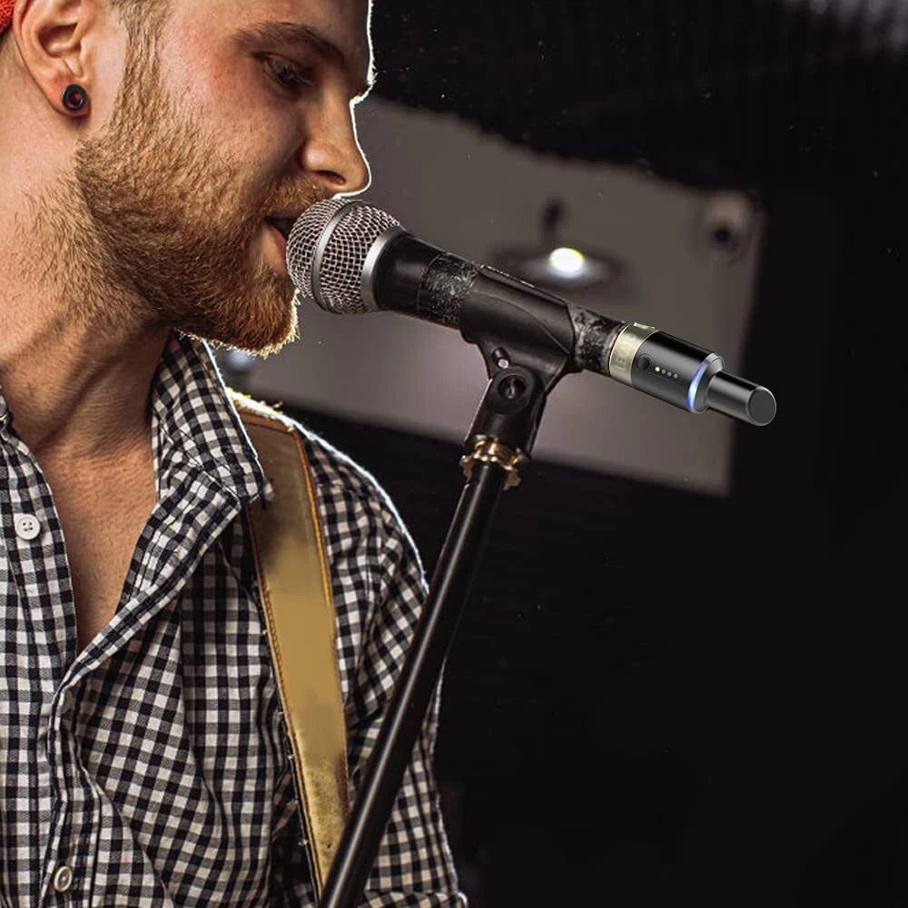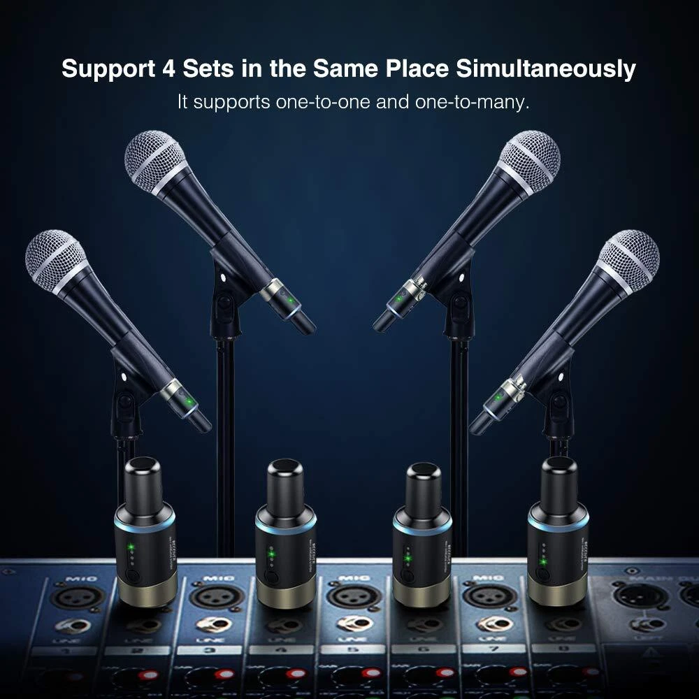 XLR wireless Microphone System designed for professional dynamic microphones, Utilizing the wordwide lcene-free frequency band, has high-quality audio and strong anti-interference. Wireless microphone system MW-01 is 5.8GHz, which is free from interference of the most devices around you. Specification: Frequency : Wireless 5.8Ghz Frequency response : 20Hz - 20KHz Sampling rate : 24-bit / 48kHz Transmission Range: 30M / 100ft Signal Distortion: < 0.02% Delay: < 5ms Signal to Noise Ratio: > 105dB Port type : XLR male port Package List: 1 * Wireless microphone system Receiver 1 * Wireless microphone system Transmitter 1 * Rechargeable Power Cable 1 * Manual 5.8GHz No Interference Wireless System : Transmitter and receiver system utilize the 5.8GHz ISM frequency band, free from interference. Designed for any dynamic/harmonic mic, no need the cable. Up to 100ft of wireless range. Not work with condenser mic High Quality Sound Transmission : 24bit Audio Resolution with Sampling Frequency of 48K provides stable and reliable wireless transmission. Less than 6ms latency, no lag or no signal loss. Ensures good performance for your every time Built-in Rechargeable Battery and Power Indicator : Transmitter and receiver can charge simultaneously with the dual port USB cable. More than 5 hours playing time. You can know the battery level when turn on the unit and the related channel's indicators 1-Key and Multi-Channel :Long press the signal key to match transmitter and receiver at the same time. 4 switchable channels, a maximum of 4 sets receivers can be matched with the same transmitter simultaneously Dynamic- XLR transmitter and XLR receiver : Works with any dynamic/Harmonic microphone or battery-powered condenser wireless microphones system, Audio mixer, PA system, Provides stable and reliable wireless transmission