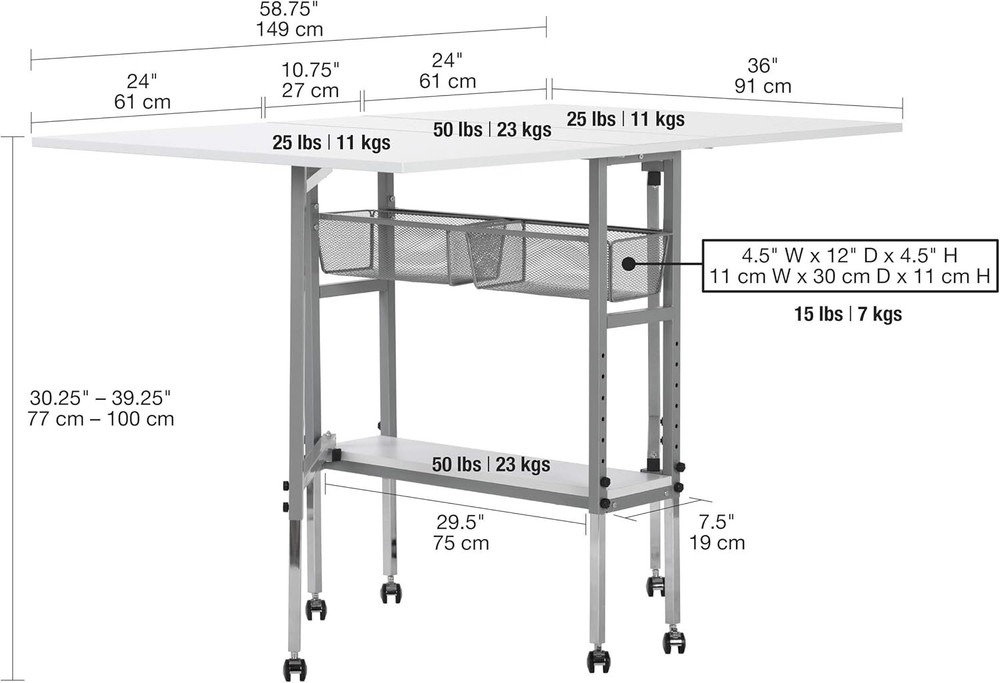 Hobby and Cutting Table - " W x " D White Arts and Crafts Table with 2 Mesh Storage Drawers, Silver/White HOBBY & CUTTING TABLE: Stylish design features a " wide and " deep tabletop when fully extended; Perfect for spreading out and diving into a variety of creative projects, including sewing, writing, crafting, and cutting fabric OFFERS STORAGE SPACE: Includes two slide-out, metal mesh storage drawers and a lower shelf, so you can store fabric, art supplies, and more without the clutter; Allows you to organize supplies and keep them close while working ADJUSTABLE TABLETOP HEIGHT: Tabletop height can be adjusted from inches to inches; Provides back relief on longer art projects and creates a versatile workspace no matter the project; Knob adjusts height in " increments SUSTAINABLE DESIGN: The powder-coated frame and thick tabletop make this sewing table with drawers durable and ready for s of use; Includes six floor casters for mobility and four lock for stability DIMENSIONS: OVERALL: " W x " D x " - " H (easily folds to " W); CENTER TOP: " W x " D; FOLDING PANELS: 24" W x " D; DRAWERS: " W x 14" D x " H; BOTTOM SHELF: " W x " D The Hobby and Cutting Table makes finding a place to create easier than ever. Designed with a " wide and " deep tabletop when fully extended, this cutting and hobby desk creates the perfect space for spreading out art supplies as you create, sew, cut fabric, adjust patterns, and work on different hobbies. Organize your sewing supplies and keep them handy with the two mesh fabric storage drawers and convenient lower shelf. This crafts table adjusts heights to help provide back relief and comfort while working on longer artistic projects. Make your space your own with the Hobby and Cutting Table. Overall Dimensions: " W x " D x " - " H (easily folds to " W) Center Top Dimensions: " W x " D Folding Panels Dimensions: " W x " D Two Slide-Out Wire Mesh Drawers Dimensions: " W x 14" D x " H Bottom Shelf for Storage Dimensions: " W x " D