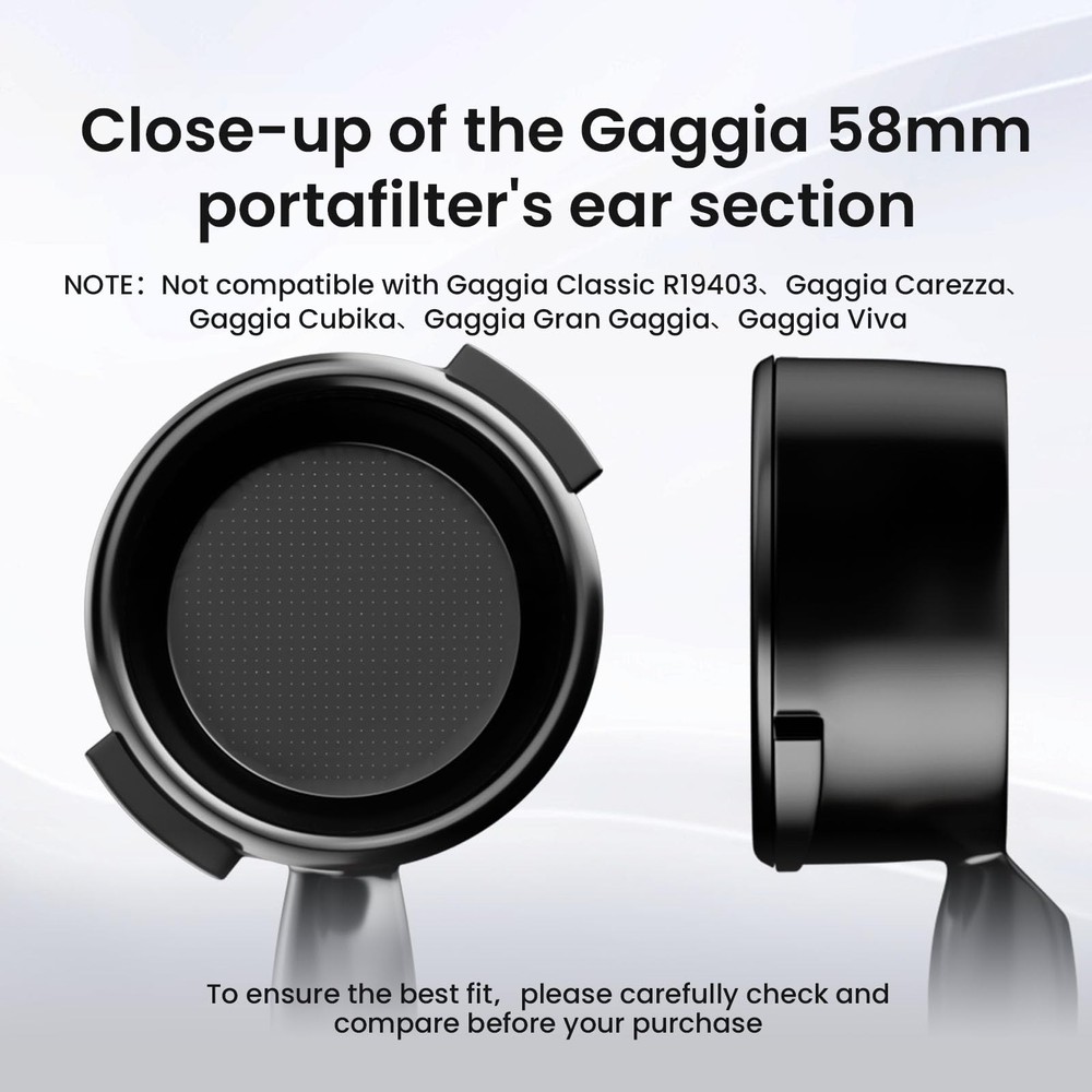 58mm Bottomless Portafilter Fits Gaggia Espresso Coffee Machines, 2 Ears Flat Naked Espresso Portafilter with Precision Filter Basket, Wood Handle, BP7119G 58mm Bottomless Portafilter: Designed to fit 58mm Gaggia espresso machine models, with 58mm Gaggia , Gaggia , Gaggia Evo , and Gaggia Cubika Plus. (Note: Only suitable for Gaggia) Premium Materials: Crafted meticulously from natural wood and SUS304 steel, surface electroplated, the entire portafilter ensures durability, corrosion resistance, and antioxidation properties. No espresso lover can resist such a high-quality gift for their gift. This Gaggia portafilter weighs approximately 400g/0.88lbs, feels heavy and sturdy. Filter Basket: Comes with a 58mm universal stainless steel precision filter basket, equipped with 632 0.3mm diameter holes at the bottom. Ensures even extraction while reducing fine runoff for a cleaner coffee taste. (Recommended quantity is 18g) Bottomless Design: The absence of a bottom allows for observing the coffee flow, speed, color, crema, and flow patterns, enabling the detection of defects and errors before extraction. (Easily detachable for cleaning but avoid dishwasher use for optimal care.) Ergonomic Handle: The 58mm portafilter's grip features a tapered design with a surface treated by electroplating, providing a comfortable grip. Whether you are a professional barista needing to craft coffee frequently or a passionate coffee enthusiast, you will instantly fall in love with it after use. 【Gentle Reminder】Channeling and spurting, while messy, are common experiences. They signal opportunities for enhancement in your preparation methods like adjusting grind size, tamping, and distribution, rather than being flaws of the portafilter itself. If you have any concerns or dissatisfaction, please .
