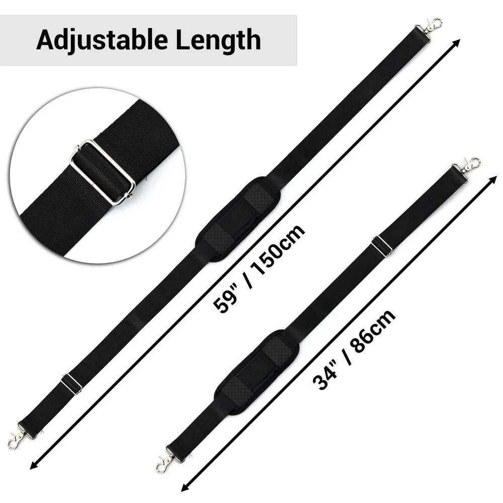 Description Shoulder Strap Replacement Specifications Material: high-quality nylon Size: 59 inches (150 cm) in length, it can be adjusted from 34" to 59" (86cm to 150cm) in length The package includes: 1 Pcs x Shoulder Strap The adjustable strap is made of high-quality nylon material, so you can rest assured that it will be comfortable and durable. Plus, it is easy to use, just attach and detach the clips easily as needed. So why wait? Give your shoulders a break with this amazing shoulder strap today! What Makes Our Shoulder Straps The Best? SHOULDER STRAP FOR LAPTOP BAGS - The package includes a shoulder strap that can hold heavy loads safely. You can easily attach the shoulder strap with the easy put-on and put-off secure clips to your bag which can make carrying your bag lighter and more comfortable. LONG & ADJUSTABLE SHOULDER STRAP - The shoulder strap is 59 inches (150 cm) long and adjustable. The universal size can be adjusted from 34" to 59" (86cm to 150cm) in length according to your needs for the perfect fit. It is long enough for crossbody use. STURDY & LONG LASTING - The laptop shoulder strap is made of high-quality nylon, soft, sturdy, lightweight, wear-resistant, long-lasting, and suit for long-term carrying. With its premium build, you can use the strap for years. The non-slip surface prevents the strap from sliding off the shoulder. SATISFACTION GUARANTEED We want you to be happy with your laptop bag shoulder straps, and we're committed to making sure you're happy with your purchase. If for any reason you're not satisfied, just let us know and we'll gladly offer a refund. Order your shoulder strap replacement for laptop bags now! SHOULDER STRAP FOR LAPTOP BAGS - The package includes a shoulder strap that can hold heavy loads safely. You can easily attach the shoulder strap with the easy put-on and put-off secure clips to your bag which can make carrying your bag lighter and more comfortable. LONG & ADJUSTABLE SHOULDER STRAP - The shoulder strap is 59 inches (150 cm) long and adjustable. The universal size can be adjusted from 34" to 59" (86cm to 150cm) in length according to your needs for the perfect fit. It is long enough for crossbody use. STURDY & LONG LASTING - The laptop shoulder strap is made of high-quality nylon, soft, sturdy, lightweight, wear-resistant, long-lasting, and suit for long-term carrying. With its premium build, you can use the strap for years. The non-slip surface prevents the strap from sliding off the shoulder. FASHIONABLE STRAP FOR BAGS - The stylish shoulder strap is elegant and fashionable. It is the perfect replacement for a broken strap of any cross bag, laptop bag, messenger bag, duffel bag, guitar bag, camera bag, luggage bag, sports bag, diaper bag, iPad case, notebook case, etc. SECURE CLIPS & SHOULDER PAD - Thick cushion padded shoulder strap with metal clips makes your bag more comfortable when carrying it on your shoulder. The secure clips are made of high-quality metal and have 360 rotation which will keep your bags firm and secure.