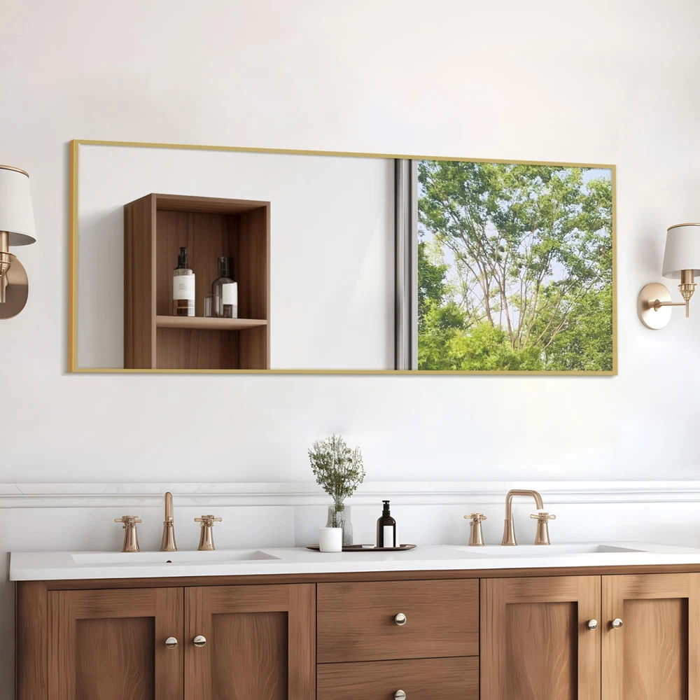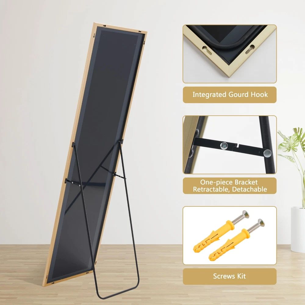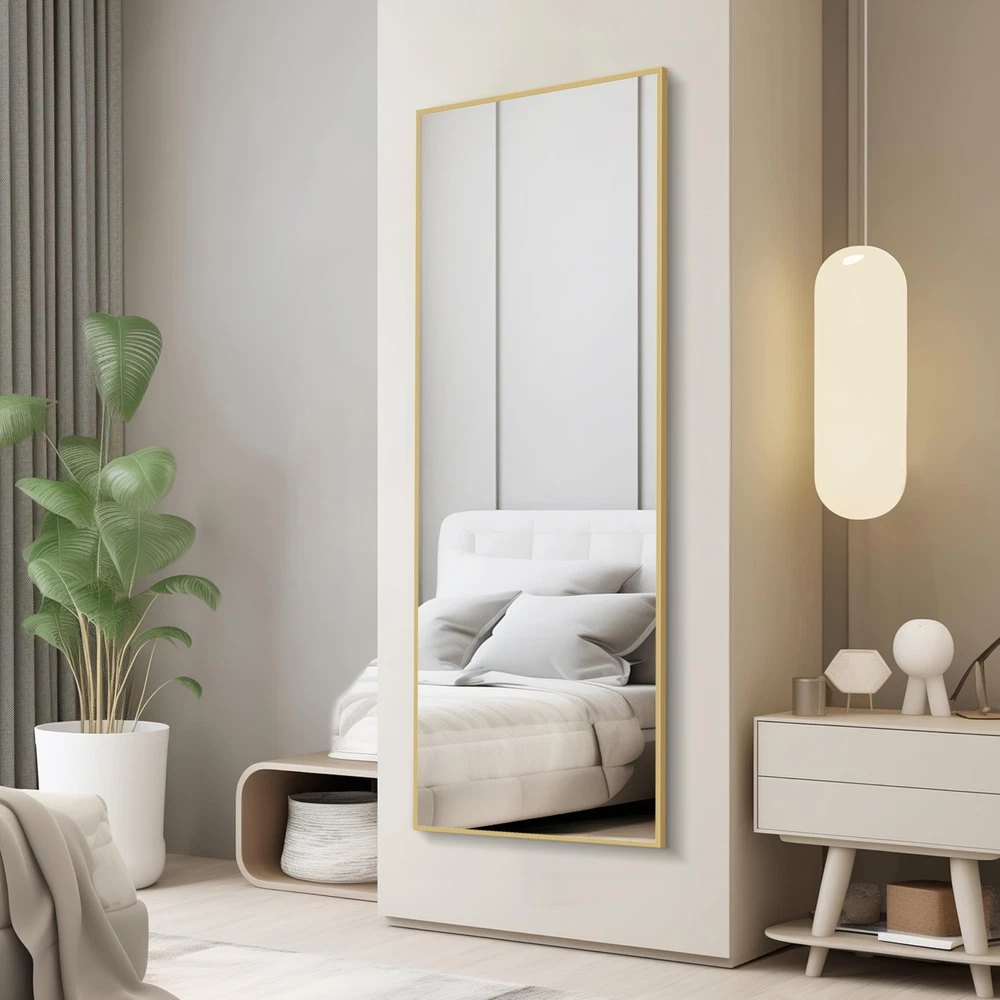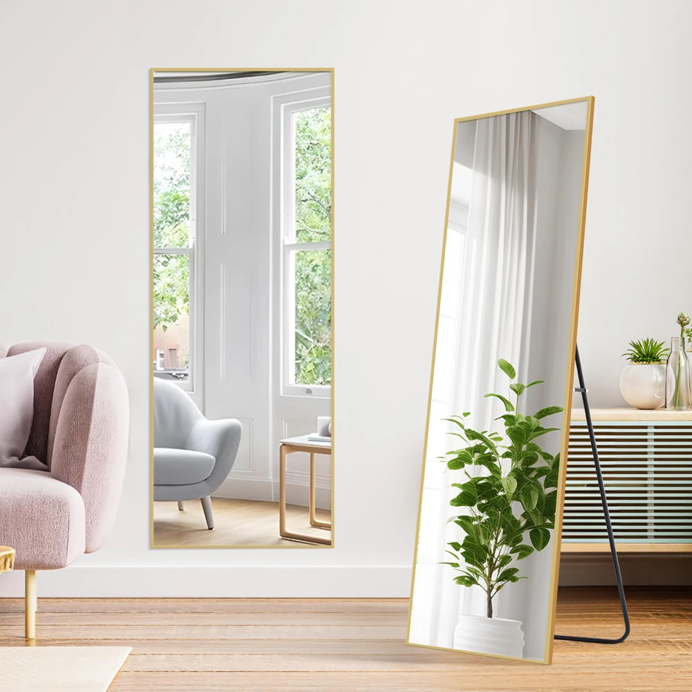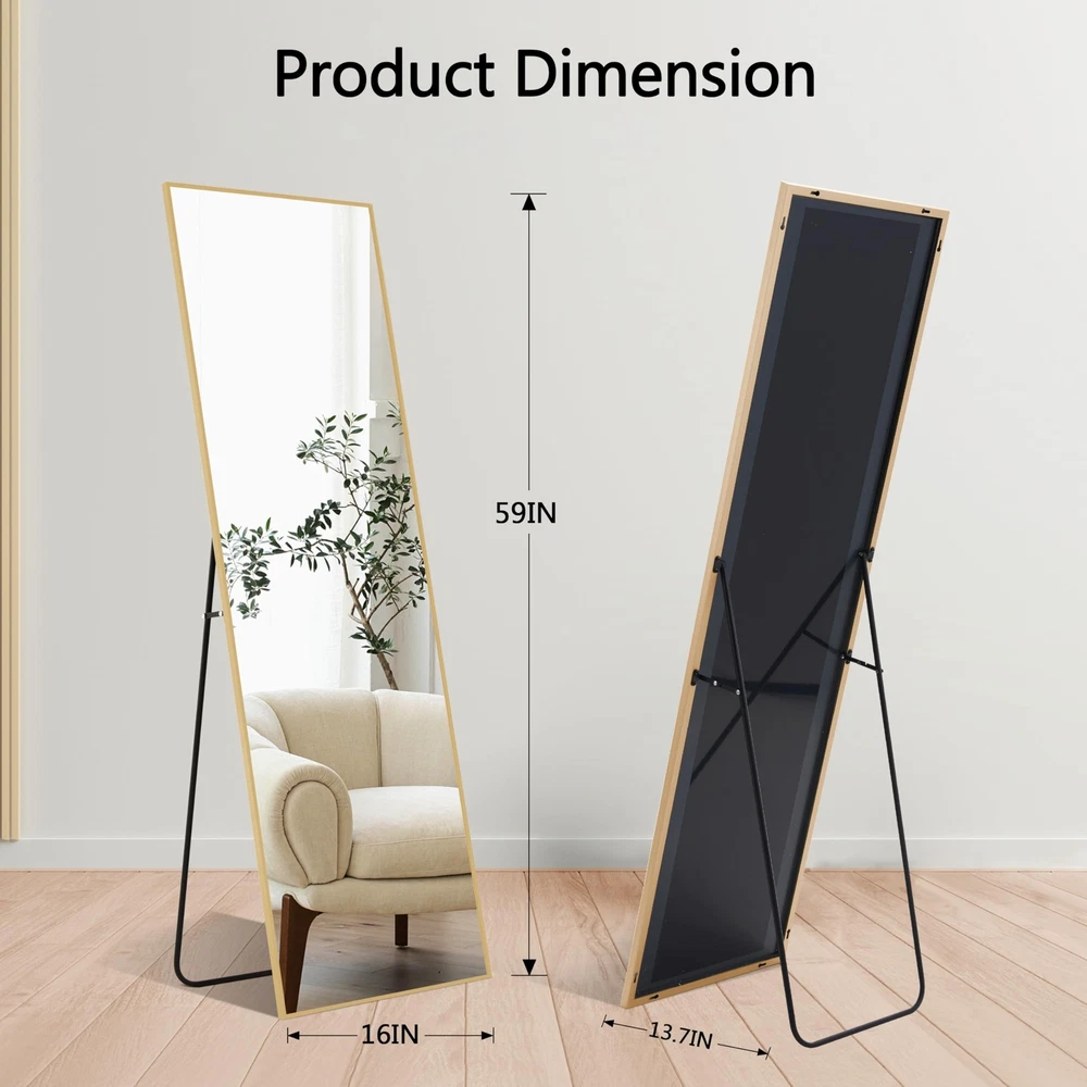 About this item Glass Full-Length Mirror:59" x 16" full-size mirror, enough for you to see your entire figure in a single glance and bring you light, beauty, and confidence Safety Glass: Our full length mirror is made of HD-definition glass, explosion-proof materials, The glass is reinforced with an explosion-proof layer, offering enhanced safety by preventing shattering upon impact Elegant Design: The top of the floor mirror is designed with a unique smooth arched-top frame, which especially attracts people's attention and highlights the beauty of the mirror. The thin aluminum alloy frame makes the mirror looks more classic and it is suitable for dressing in any room Multiple Placement Options: This full-body mirror offers three placement options: floor-standing, wall-mounted, or leaning against a wall. The included bracket allows for easy positioning, making it ideal for bedroom, living room, closet, home gym, hallway, and retail spaces Easy to Install: Some pre-drilled holes on the frame, removable bracket, and we also provide dry wall rivets and screws, which ensuring that you can hang the mirror on the wall