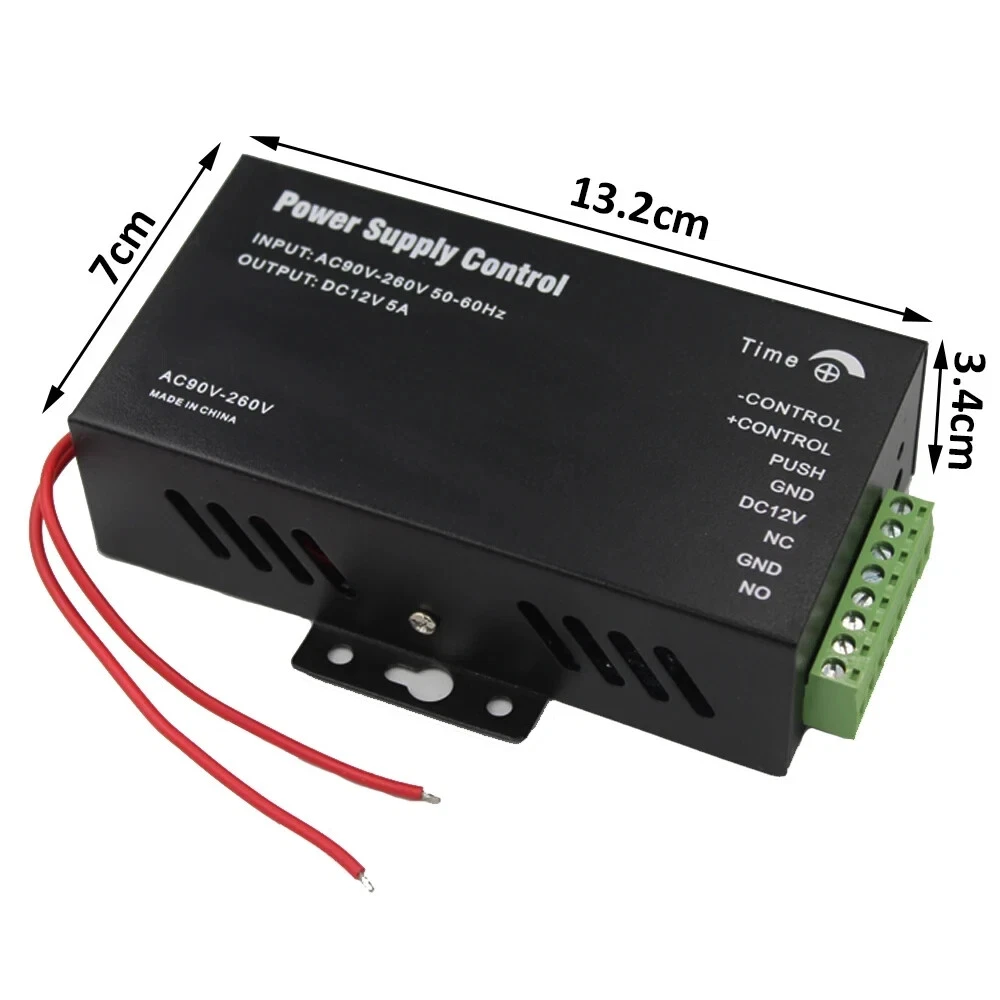 How to Choose 12V3A or 12V5A? If you are using one lock from the power supplier, then 12V3A is enough. If you are using two locks from the power supplier, then 12V5A is more stable even 12V3A is ok to use. Description: This is a 100V--240V (12V3A and 12V5A) Access Control Power supply, it is made up of high quality electronic components and advanced international technology, it has anti-interference ability, provide very stable and reliable output in a various applications such as lock control/ controller control/ exit button/ RFID-IC Reader .etc. Functions: It controls electric lock directly. Can reduce the load of access controller, save wiring to reduc the hidden trouble Set NC / NO outputs, can control various types of electric locks Based delay control circuit, lock time can be in 0-10 seconds Automatic protection function, unexpected situations such as when the power supply short-circuit occurs, the power may be temporarily disconnected or the fuse auto insurance line off Operative device: E/M Lock, Access Controller, Exit Push Button Specification: AC input: Standard AC110V-260V(12V3A and 12V5A) DC output: Stabilivolt DC12V/ 3A and DC12V/5