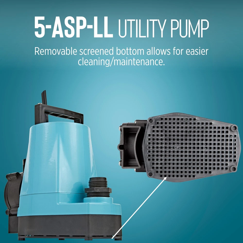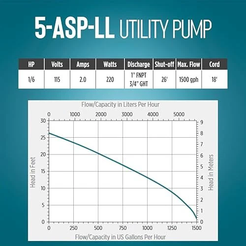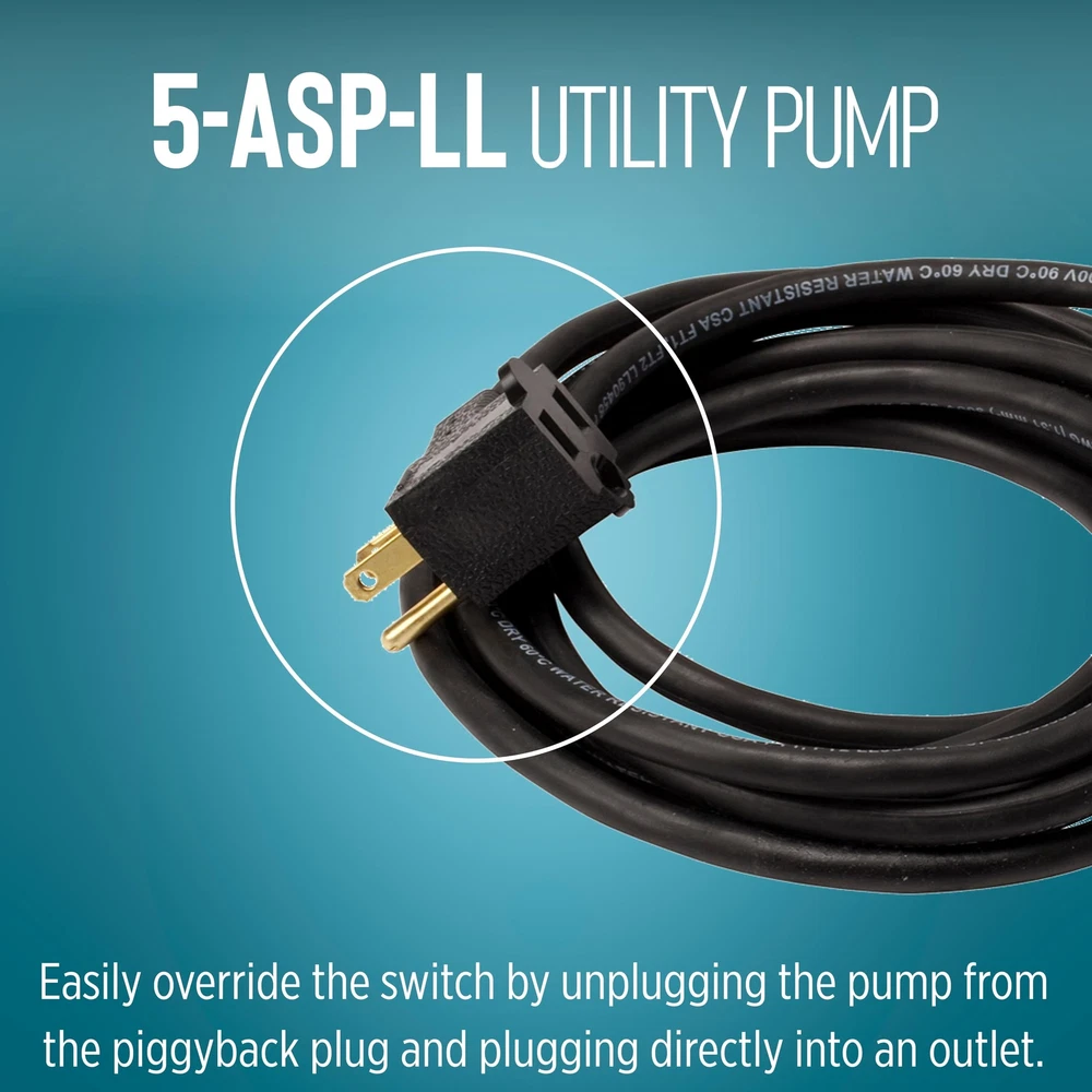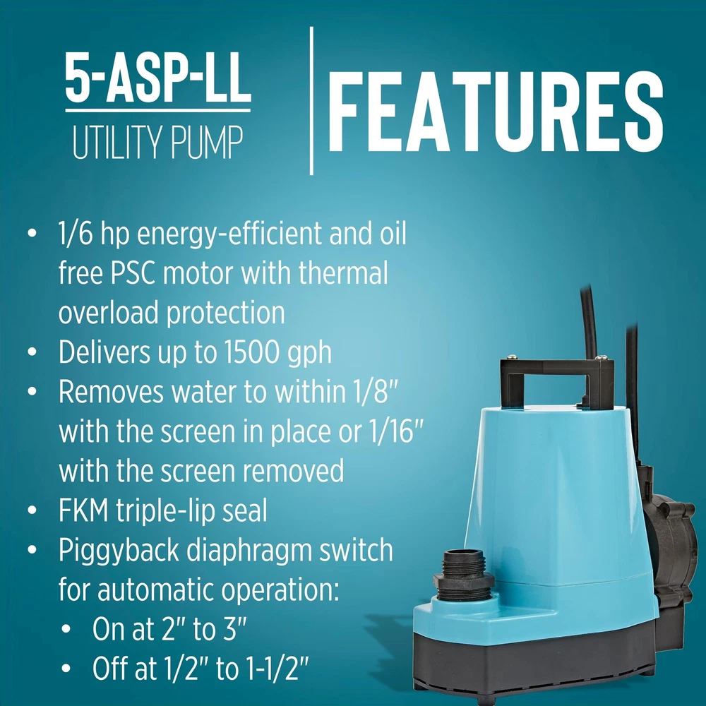 The 1/6 HP 5-ASP-LL 1500 GPH continuous duty submersible utility pump comes with a piggy-back diaphragm switch than can be easily by-passed for manual operation. This low level switch activates the pump when the water level reaches 2 to 3 inches and shuts the pump off when the water falls between 0.5 and 1.5 inches. To by-pass the switch, unplug the pump from the back of the switch and plug directly into the outlet. This pump is ideal for emergency water removal, water transfer, water recirculation or hydroponic use in homes, commercial or industrial applications. It comes with a removal screen and removes water down to 1/8-inch with screen in place or 1/16-inch with the screen removed. This pump comes equipped with an 18-foot cord. A 3/4-inch garden hose adapter is included. This unit is not designed to filter out sewage, mud, soil, or similar matter. If you are looking for a pump that can filter out sewage, mud, soil, etc., consider an effluent, sewage, or trash pump. AUTOMATIC UTILITY PUMP: For submersible use only; comes with a piggyback diaphragm switch with 18-ft. cord; 1-inch FNPT discharge and 3/4-inch garden hose adapter SUBMERSIBLE PUMP: Typical applications for the 5-ASP-LL pump include commercial, industrial, and home uses where liquid must be transferred or recirculated; this pump is for submersible use only BUILT TO LAST: epoxy coated die-cast aluminum with a 1/6 HP permanently lubricated, oil-free, energy-efficient PSC motor with overload protection, triple-lip seal, upper and lower ball bearings Portable and compact weighing 8 lbs. with built-in carry handle; piggyback switch allows easy conversion to a manual pump SPECIFICATIONS: 1/6 HP, 1500 GPH, 115-Volt, 25-foot cord, 2.0 running Amps, 220 Watts, 26-foot shut-off, 11.43 PSI, automatic operation - on at 2 to 3 inches; off at 0.5 - 1.5 inches
