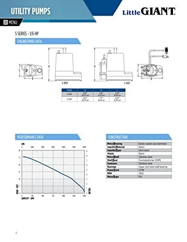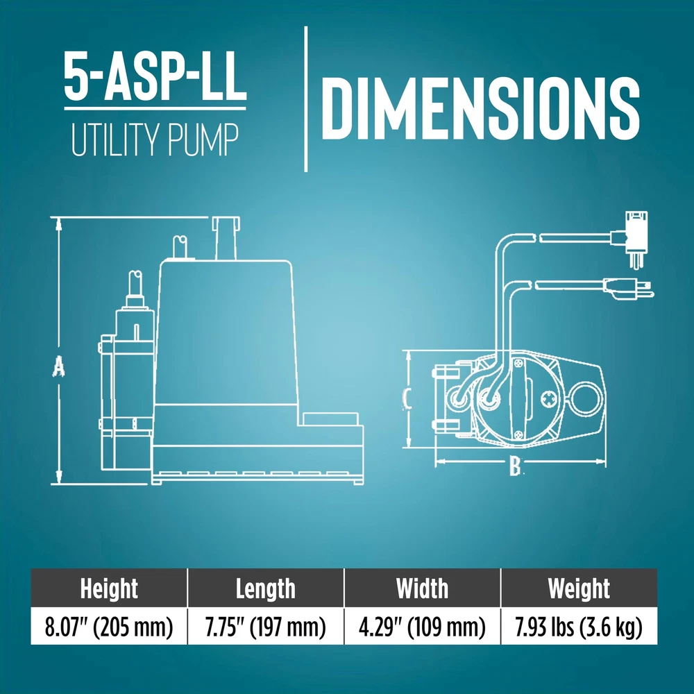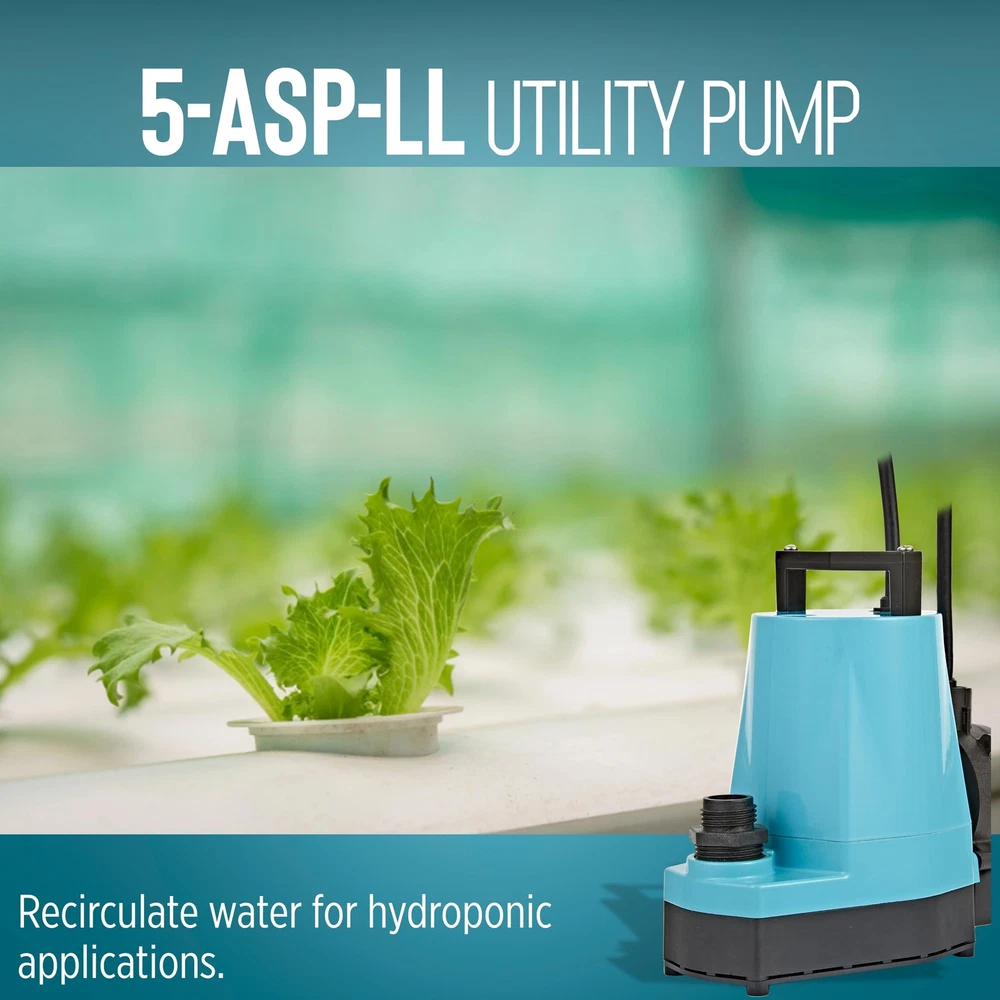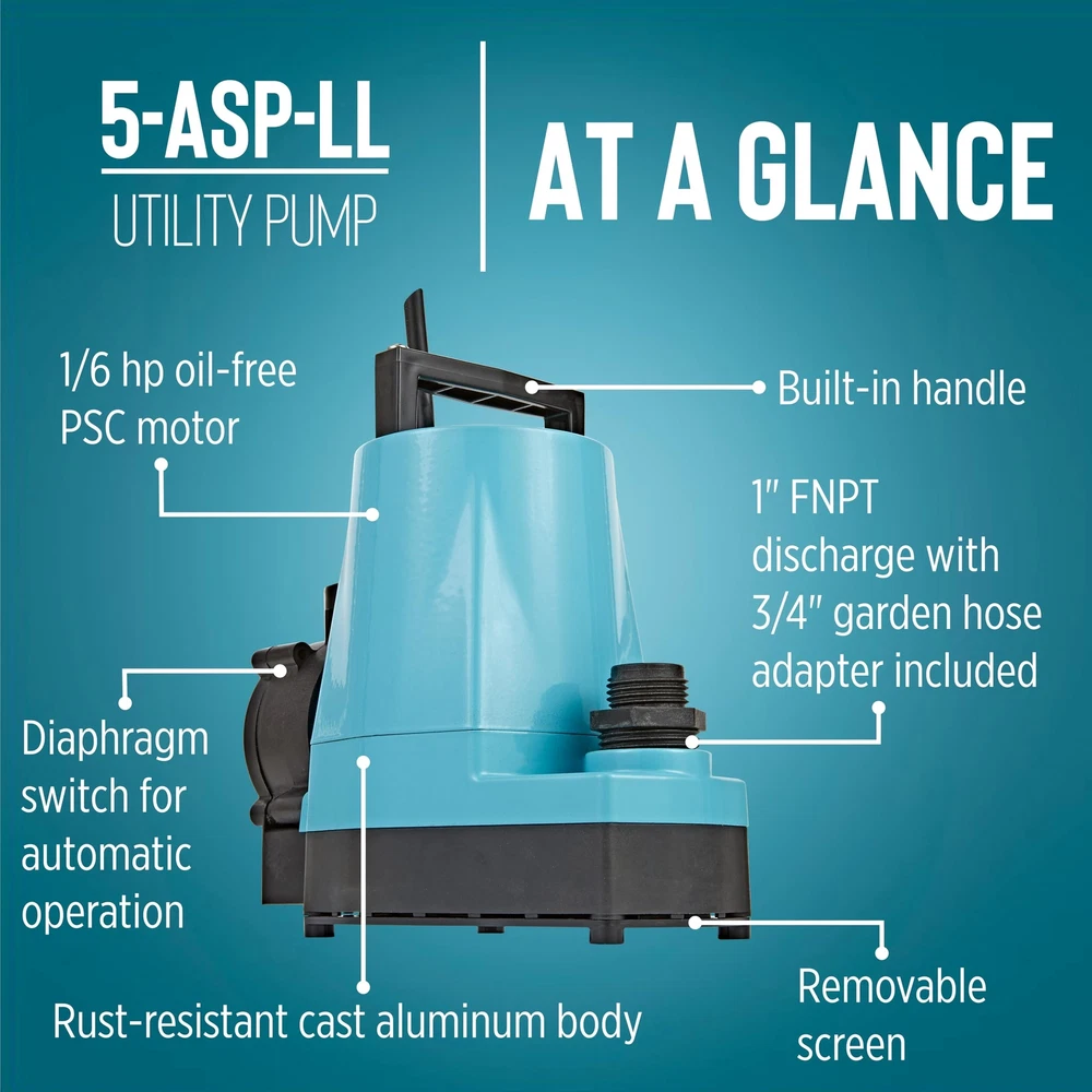 The 1/6 HP 5-ASP-LL 1500 GPH continuous duty submersible utility pump comes with a piggy-back diaphragm switch than can be easily by-passed for manual operation. This low level switch activates the pump when the water level reaches 2 to 3 inches and shuts the pump off when the water falls between 0.5 and 1.5 inches. To by-pass the switch, unplug the pump from the back of the switch and plug directly into the outlet. This pump is ideal for emergency water removal, water transfer, water recirculation or hydroponic use in homes, commercial or industrial applications. It comes with a removal screen and removes water down to 1/8-inch with screen in place or 1/16-inch with the screen removed. This pump comes equipped with an 18-foot cord. A 3/4-inch garden hose adapter is included. This unit is not designed to filter out sewage, mud, soil, or similar matter. If you are looking for a pump that can filter out sewage, mud, soil, etc., consider an effluent, sewage, or trash pump. AUTOMATIC UTILITY PUMP: For submersible use only; comes with a piggyback diaphragm switch with 18-ft. cord; 1-inch FNPT discharge and 3/4-inch garden hose adapter SUBMERSIBLE PUMP: Typical applications for the 5-ASP-LL pump include commercial, industrial, and home uses where liquid must be transferred or recirculated; this pump is for submersible use only BUILT TO LAST: epoxy coated die-cast aluminum with a 1/6 HP permanently lubricated, oil-free, energy-efficient PSC motor with overload protection, triple-lip seal, upper and lower ball bearings Portable and compact weighing 8 lbs. with built-in carry handle; piggyback switch allows easy conversion to a manual pump SPECIFICATIONS: 1/6 HP, 1500 GPH, 115-Volt, 25-foot cord, 2.0 running Amps, 220 Watts, 26-foot shut-off, 11.43 PSI, automatic operation - on at 2 to 3 inches; off at 0.5 - 1.5 inches