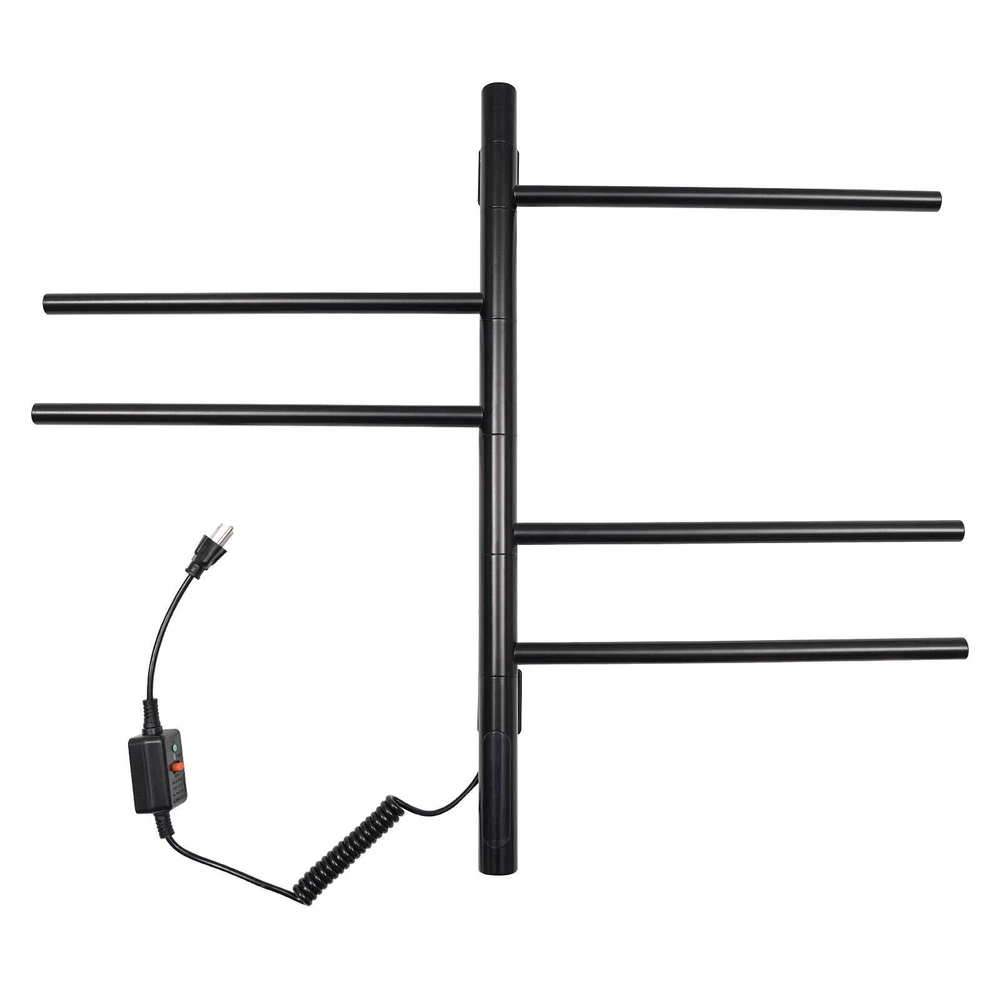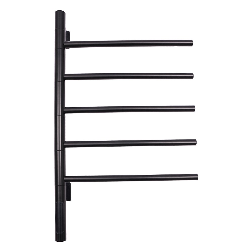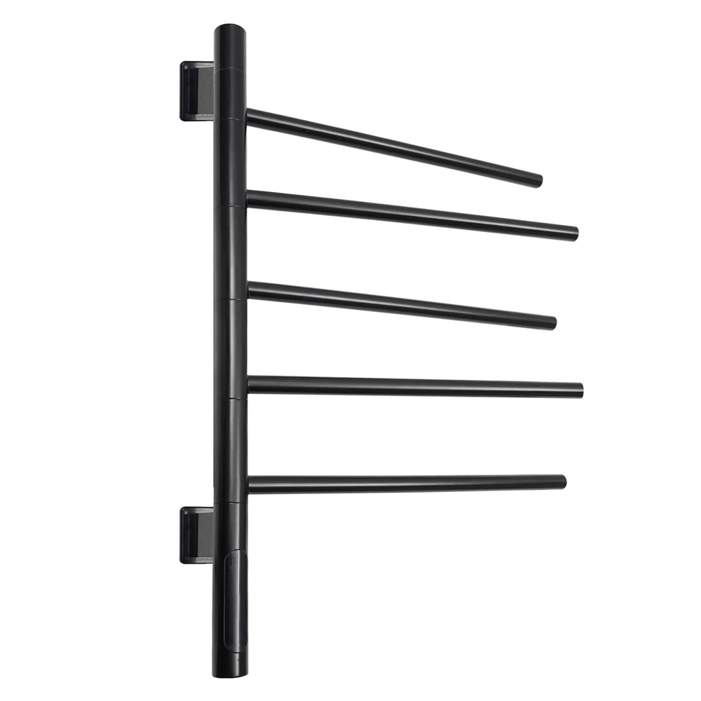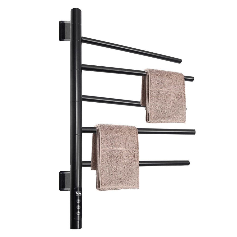 180° Rotating Towel Rack Electric Towel Warmer Heated Towel Racks for Bathroom Description A towel rack is an indispensable piece of bathroom equipment that not only provides you with convenience, but also adds a touch of color to your bathroom decor. Our electric towel warmer is made of high-quality materials, solid and durable. It is powerful, easy to install, and beautiful in appearance, which will surely become your ideal choice. Key Features Made to Last: The product is made of 304 stainless steel and SPCC mild steel with an electrostatic spraying process, which is strong and pressure-resistant, abrasion-resistant, high-temperature-resistant, and not easy to corrode, ensuring a long service life. Excellent Function: 360° full-body carbon fiber dry heating allows for even heating. 86-158°F adjustable temperature allows for quick drying, deodorizing and dehumidifying, and disinfecting. High Safety: IPX5-rated waterproof ensures that the product does not easily rust and prolongs its service life. The product is equipped with an anti-leakage protection switch, which can cut off the power in case of leakage to ensure the safety of use. Rotatable Structure: Each rod of the product can be rotated 180°, which can provide different angles of use. Meanwhile, it can be pulled away from the ventilation distance, so that the towels can be dried quickly and not easy to get wet and moldy. It also allows you to hang dry towels and wet towels separately. Strong Load-bearing Capacity: The strong screw fastening mounting makes it structurally stable and can support up to 22.05lbs, allowing you to hang heavy objects that you can use with confidence. Optional Installation: Two installation options(open and concealed) are available, so you can choose the right one according to your preference and needs. Energy Savings: The product consumes less electricity per hour, and you can set the time within 1-9 hours, saving energy time, and expenses. Effortless Cleaning: It has a smooth surface and an open structure, so you only need to wipe the dust or residue with a towel. Good Customer Service: We aim to provide quality products and services. If you have problems, please feel free to contact us. We will reply and solve the problem for you as soon as possible Details Long Power Cable: The 4.92 ft spring type power cable reduces usage restrictions and further protects your safety. HD Touch Panel: It provides great convenience for your operation, and also a real-time display of temperature and timing, which is convenient for you to observe the running status of the product. Application This product is suitable for installation in the bathroom or hotel and other places for drying towels or sterilizing mites. Specification Material: 304 Stainless Steel, SPCC Mild Steel Color: Black Process: Electrostatic Spraying Style: Modern Assembly Required: Yes Mounting Type: Wall Mount Plug Type: US Standard Voltage: 110V Power: About 85-90W Waterproof Rating: IPX5 Rotation Angle: 180° Power Cable Length: 1.5m/4.92ft Temperature Adjustment Range: 30-70℃±5°C Adjustment/86-158°F (±41°F Adjustment) Timing: 1-9h Number of Bars: 5 Bar Spacing: 8.1cm/3.19in Each Bar Length: 38.3cm/15.08in Max. Load Capacity: 10kg/22.05lbs Gross Weight: 3.2kg/7.05lbs Net Weight: 2.3kg/5.07lbs Product Size: 67.5*41.5*9cm/26.57*16.34*3.54in Package Size: 73*48*7cm/28.74*18.9*2.76in Package Included 1* Electric Towel Warmer 2* English Manuals Other Accessories for Assembly Notes Please read the operating manual completely before use. And pay particular attention to the safety instructions included. Please allow the slight color difference caused by the shooting light and 1-3cm error due to manual measurement, and make sure you do not mind before ordering. Feature 1 Easy installation,Convenient Use,Easy Operation Process Electrostatic Spraying Mounting Type Wall Mount Plug Type US Standard Voltage 110V Power About 85-90W Waterproof Rating IPX5 Rotation Angle 180° Power Cable Length 1.5m/4.92ft Temperature Adjustment Range 30-70℃±5°C Adjustment/86-158°F (±41°F Adjustment) Timing 1-9h Number of Bars 5 Bar Spacing 8.1cm/3.19in Each Bar Length 38.3cm/15.08in Max. Load Capacity: 10kg/22.05lbs Gross Weight 3.2kg/7.05lbs Net Weight 2.3kg/5.07lbs Product Size 67.5*41.5*9cm/26.57*16.34*3.54in Package Size 73*48*7cm/28.74*18.9*2.76in Type Towel Rack Material 304 stainless steel and SPCC mild steel Brand Unbranded Color Black Style Modern Assembly Required Yes