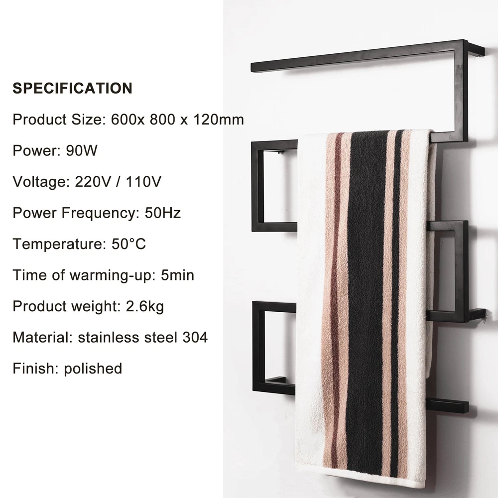 This heated towel rack is a game-changer! The sleek black design looks stylish in any bathroom, and the stainless steel construction feels super sturdy. I love how quickly it warms up—my towels are always toasty when I step out of the shower. The wall mount saves space, and the waterproof feature gives me peace of mind. Perfect for keeping towels dry and cozy, whether at home or in a hotel. No more damp, musty towels—just warm, fresh comfort every time!
