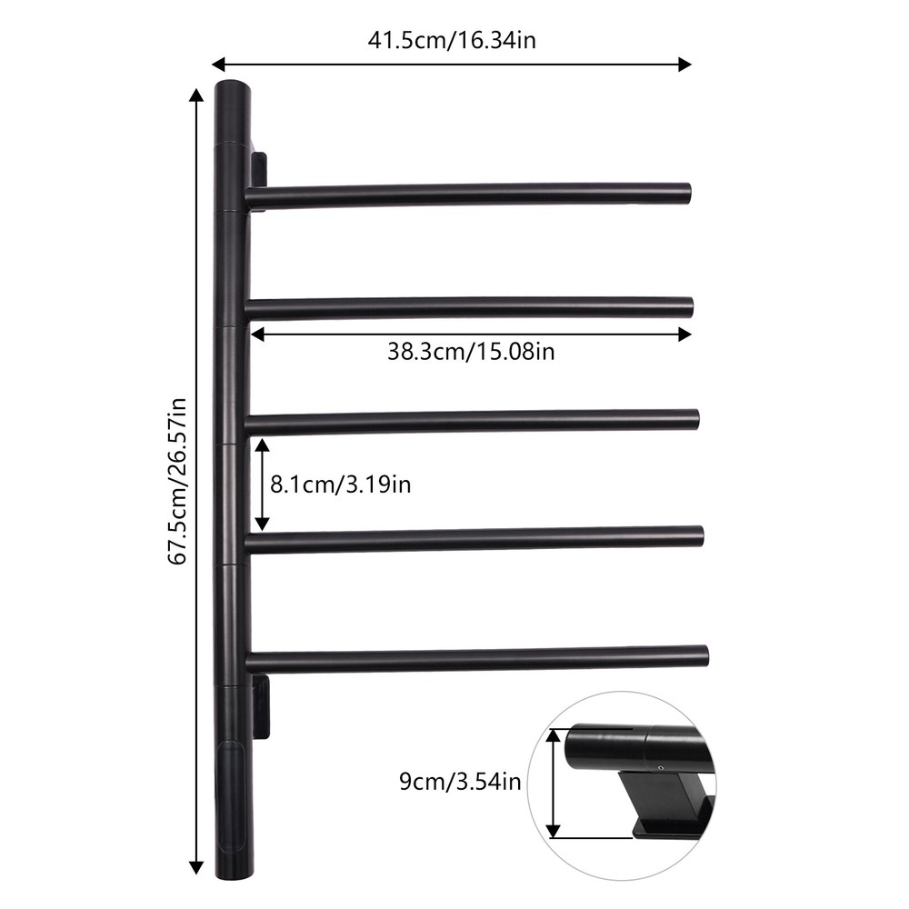 5 Bars Electric Towel Warmer Rotating Towel Rack Heated Towel Racks for Bathroom 180° Rotating Towel Rack Electric Towel Warmer Heated Towel Racks for Bathroom Description A towel rack is an indispensable piece of bathroom equipment that not only provides you with convenience, but also adds a touch of color to your bathroom decor. Our electric towel warmer is made of high-quality materials, solid and durable. It is powerful, easy to install, and beautiful in appearance, which will surely become your ideal choice. Key Features Made to Last: The product is made of 304 stainless steel and SPCC mild steel with an electrostatic spraying process, which is strong and pressure-resistant, abrasion-resistant, high-temperature-resistant, and not easy to corrode, ensuring a long service life. Excellent Function: 360° full-body carbon fiber dry heating allows for even heating. 86-158°F adjustable temperature allows for quick drying, deodorizing and dehumidifying, and disinfecting. High Safety: IPX5-rated waterproof ensures that the product does not easily rust and prolongs its service life. The product is equipped with an anti-leakage protection switch, which can cut off the power in case of leakage to ensure the safety of use. Rotatable Structure: Each rod of the product can be rotated 180°, which can provide different angles of use. Meanwhile, it can be pulled away from the ventilation distance, so that the towels can be dried quickly and not easy to get wet and moldy. It also allows you to hang dry towels and wet towels separately. Strong Load-bearing Capacity: The strong screw fastening mounting makes it structurally stable and can support up to 22.05lbs, allowing you to hang heavy objects that you can use with confidence. Optional Installation: Two installation options(open and concealed) are available, so you can choose the right one according to your preference and needs. Energy Savings: The product consumes less electricity per hour, and you can set the time within 1-9 hours, saving energy time, and expenses. Effortless Cleaning: It has a smooth surface and an open structure, so you only need to wipe the dust or residue with a towel. Good Customer Service: We aim to provide quality products and services. If you have problems, please feel free to contact us. We will reply and solve the problem for you as soon as possible Details Long Power Cable: The 4.92 ft spring type power cable reduces usage restrictions and further protects your safety. HD Touch Panel: It provides great convenience for your operation, and also a real-time display of temperature and timing, which is convenient for you to observe the running status of the product. Application This product is suitable for installation in the bathroom or hotel and other places for drying towels or sterilizing mites. Specification Material: 304 Stainless Steel, SPCC Mild Steel Color: Black Process: Electrostatic Spraying Style: Modern Assembly Required: Yes Mounting Type: Wall Mount Plug Type: US Standard Voltage: 110V Power: About 85-90W Waterproof Rating: IPX5 Rotation Angle: 180° Power Cable Length: 1.5m/4.92ft Temperature Adjustment Range: 30-70℃±5°C Adjustment/86-158°F (±41°F Adjustment) Timing: 1-9h Number of Bars: 5 Bar Spacing: 8.1cm/3.19in Each Bar Length: 38.3cm/15.08in Max. Load Capacity: 10kg/22.05lbs Gross Weight: 3.2kg/7.05lbs Net Weight: 2.3kg/5.07lbs Product Size: 67.5*41.5*9cm/26.57*16.34*3.54in Package Size: 73*48*7cm/28.74*18.9*2.76in Package Included 1* Electric Towel Warmer 2* English Manuals Other Accessories for Assembly Notes Please read the operating manual completely before use. And pay particular attention to the safety instructions included. Please allow the slight color difference caused by the shooting light and 1-3cm error due to manual measurement, and make sure you do not mind before ordering. Payment Delivery details Terms of sales About us Contact us Payment We accept ebay payment 。 Fees such as import duties, taxes are not included in the item price or shipping costs. These charges are the buyer's responsibility. Delivery details Shipping: 2-9 working days to: USA Terms of sales We maintain high standards of excellence and strive for hundred percent customer satisfaction. Feedback is very important to us. We hope that you contact us immediately before you give neutral or negative feedback, so that we can address your concerns. It is impossible to address issues if we do not know about them! About us Your satis faction is our ultimate goal. We work hard to earn your trust and future business. Our certified technicians have tested each item before shipping. The unit comes with 1 year limited warranty on all manufacturing defects. a) If you receive a defective item, you may return it or ask for a discount. Please contact us within 14 days after you receive the package. b) What you returned must be intact and in its original packaging as re? u. Customer is responsible for shipping costs of the returned item. c) We will cover the cost of shipping back t with the shipping rate indicated in the registration page. We will send you a new unit or refund the full payment you paid. Thank you. Contact us Business Hour Business Hour: Monday To Friday: 8:30 AM to 5:00 PM (Beijing China time) Due to time zones, our reply to your questions may not be immediately. But within above working time, we will reply your email within 24 hours. If it's non-workdays, please kindly be patient and wait till Monday. Please contact us with ebay message. Please feel free to contact us if you have any questions. Monday To Friday: 8:30 AM to 5:00 PM (Beijing China time) Due to time zones, our reply to your questions may not be immediately. But within above working time, we will reply your email within 24 hours. If it's non-workdays, please kindly be patient and wait till Monday. Please contact us with ebay message. Please feel free to contact us if you have any questions. Brand Unbranded Type Towel Rack Color Black Material 304 