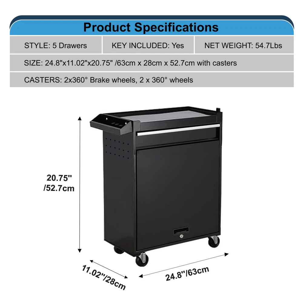 5-Drawer Rolling Tool Storage Cart with Detachable Top for Garage Workshop Black