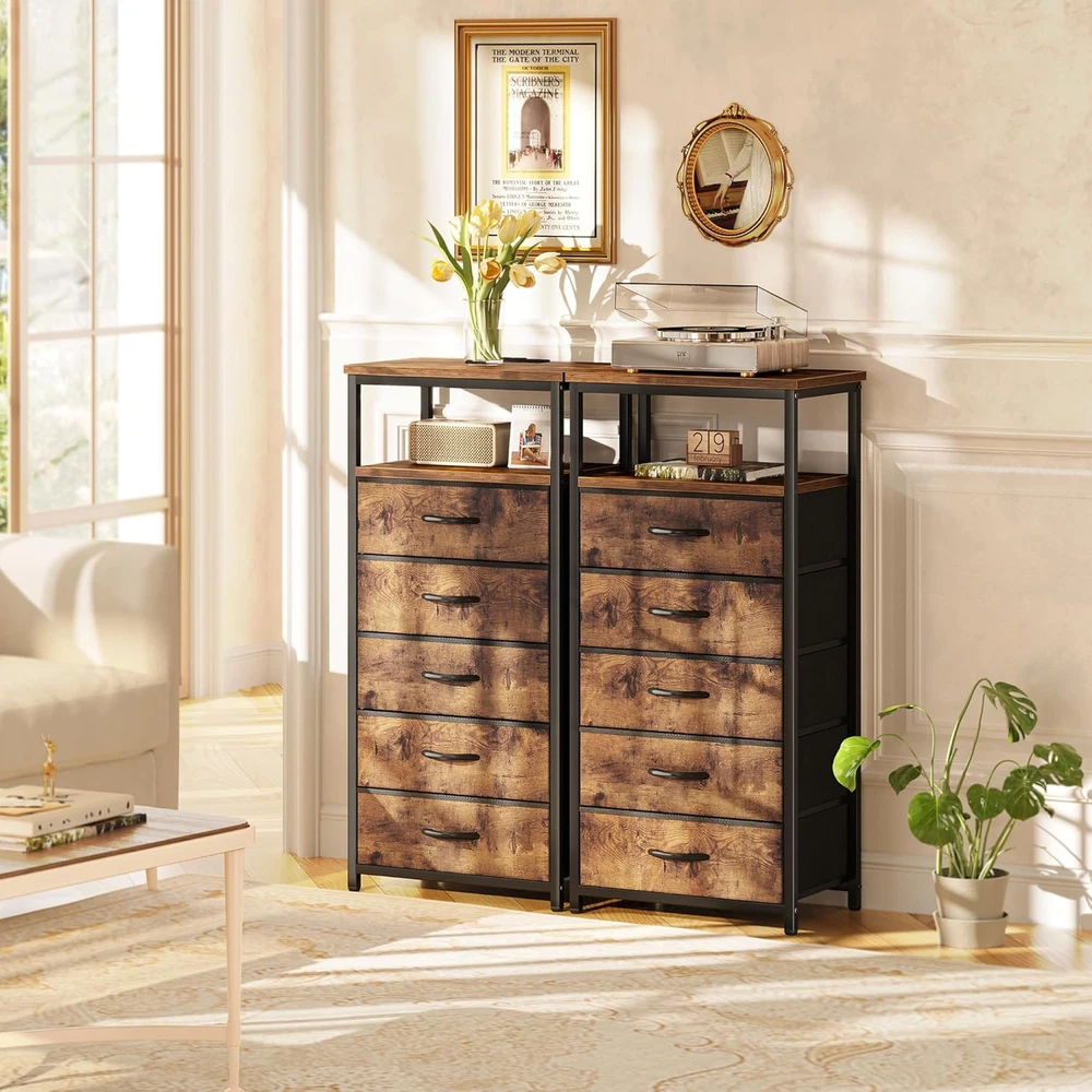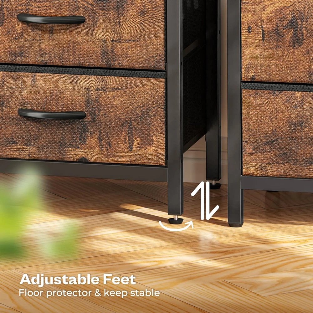 【5 Storage Drawers】Huuger The bedroom dresser features 5 fabric drawers (13.8 X 11.3 X 5.6 Inch) for storing your books, light clothing, toys well. You can also put your books, decorations and lamps on the desktop. Collapsible, breathable and sturdy, these fabric drawers ensure your belongings are well-preserved. Please note: the drawer capacity is designed for smaller items and may not store large clothing pieces such as down jackets. 【Dresser with Charging Station】Equipped with 2 USB ports and 2 AC outlets on the tabletop, this fabric dresser allows you to effortlessly charge your speaker box, lamps or other lighted devices in your bedroom or living room 【Versatile Placement】This tall dressers for bedroom utilizes vertical storage. Whether place it in your walk-in closet for growing clothes, set 2 in the entryway as a console cabinet, or in the living room, or bedroom for storage, this night stand with drawers keeps your space clutter-free with style. This tall dresser is also a great addition to a child's room for organizing toys and essentials 【Sturdy and Safe】Crafted with particle board and a robust metal frame, this nightstand organizer ensures durability and longevity. Secure it to the wall with anti-tip device to prevent items from falling off the tabletop. Adjustable feet ensure stability on the floor and protect against scratches 【Quick and Easy Setup】With numbered components, included tools, and clear instructions, this closet storage organizer can be ready in no time, no need to waste your time on tedious assembly. This sleek nightstand with smooth lines and drawer will easily add state in your home space. Age range deacription: Adults only Product Description Maximize Vertical Storage Space 2 AC Outlets & 2 USB Ports More Details Added to the Dresser 1 Fabric Drawer 2 Open Shelf 3 Adjustable Feet 4 Various Styles Dresser for Bedroom Rustic Brown Nightstand with Fabric Drawer Customer Reviews 4.5 out of 5 stars 2,407 4.5 out of 5 stars 4,707 4.5 out of 5 stars 2,752 4.5 out of 5 stars 2,752 4.5 out of 5 stars 2,407 4.7 out of 5 stars 840 Price $45.99 $ 45 . 99 — — — $45.98 $ 45 . 98 $79.99 $ 79 . 99 Colour Rustic Brown Rustic Brown Rustic Brown Rustic Brown Rustic Brown Rustic Brown Size 11.8"D x 15.7"W x 39.1"H 11.8"D x 15.7"W x 23.4"H 11.8"D x 15.7"W x 23.6"H 11.8"D x 15.7"W x 27.6"H 11.8"D x 15.7"W x 33.5"H 11.7"D x 43.3"W x 30.7"H Charging Station ✔ ✔ ✔ ✔ ✔ ✔ Drawer ✔ ✔ ✔ ✔ ✔ ✔ Open Shelf ✔ ✔ ✔ ✔ ✔ ✔