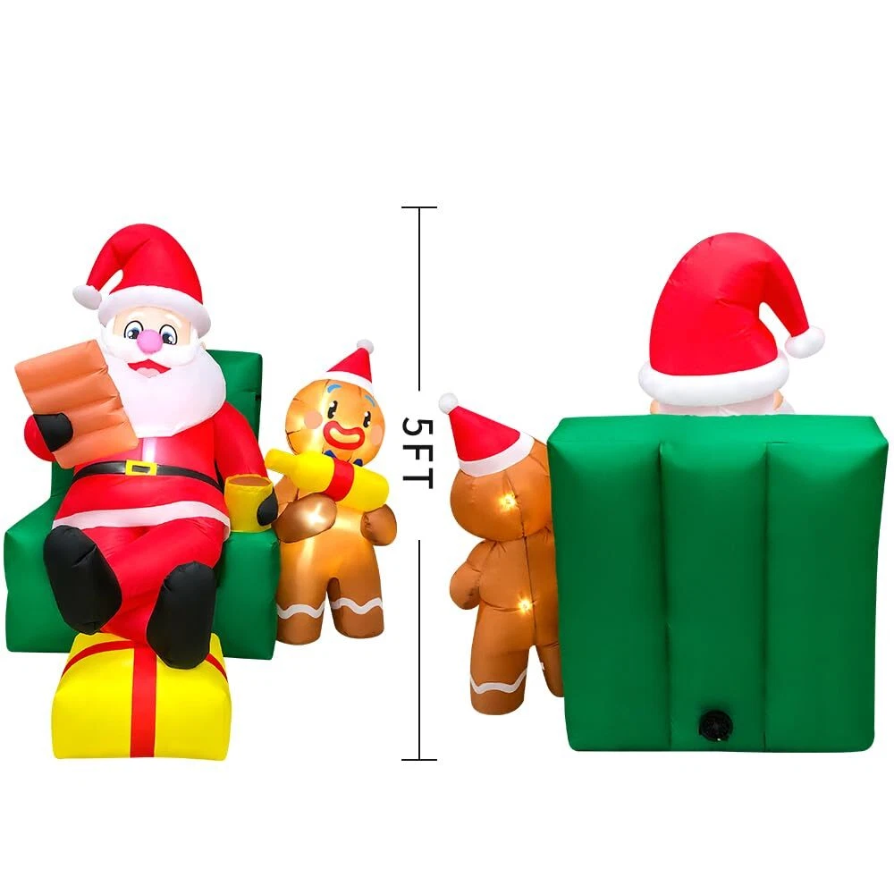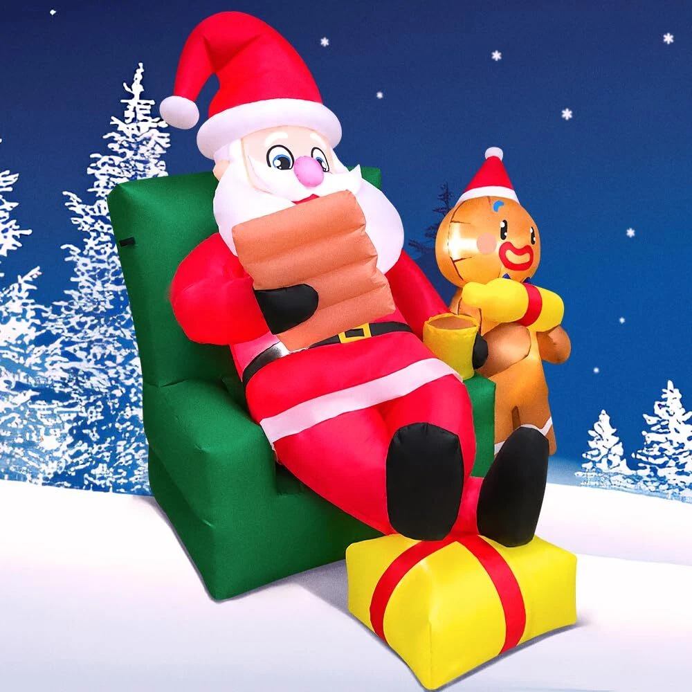 【Package Included】You will get Christmas inflatables outdoor decorations which have a 5FT santa claus, inflatable santa drinking coco from the gingerbread man decor,and 4pcs metel stakes,4pcs plastic stakes,2pcs water bags,2pcs black ropes,a UL approved plug put to a beautiful box.You Can send to friends as a christmas gift.Place the Christmas inflatable in your yard can bring a happy atmosphere to your neighbors,friends,and family for holiday cheer and welcomes them with wishes. 【Unique design】's inflatable Christmas yard decorations is very cute, the santa clause outdoor decoration is reading a book ; When plug it into a standard electrical outlet, it will inflate in minutes; The super bright colored LED light will illuminate your yard and easily attract the guests, friends, and kids' attention so that can be the most attractive & decorating yards in your neighbors. 【Premium Material】The Christmas outdoor inflatables are made of high-strength thickened polyester fabric which is resistant to rips and tears; It has an IP44 waterproof rating, and both UL and CE certifications; The excellent stitching improves the durability of the inflatable decoration; It has a powerful-duty blower which can continuous airflow inflate and it won't be a long time, you will see an adorable santa claus and gingerbread man in your yard, it is efficient and inflated quickly. 【The Outdoor Christmas Decorations】Santa claus and gingerbread man outdoor Christmas decorations are perfect for indoors, outdoors yard garden decorations,front doors,yards, lawns, Christmas event decorations,Christmas night events,Christmas party activities,party favor Christmas props, party gifts,holiday decorations and more;The best choice for Christmas decoration. 【 Merry Christmas 】Welcome to our store, where you can enjoy the best shopping experience and service. We have many styles for you to choose from, and wish you a happy shopping. We have Christmas tree, Santa Claus, gingerbread man, snowman and other styles for you to choose from which will brighten up your yard, as well as your holiday!