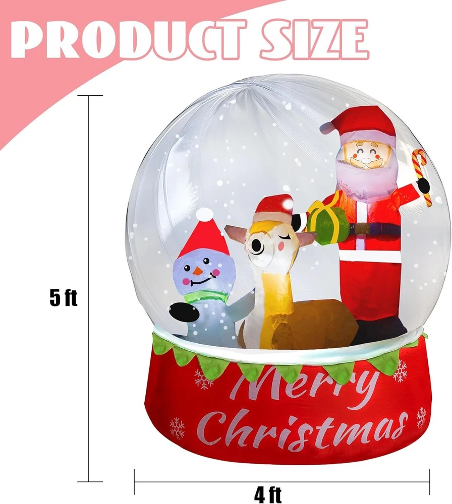 5FT Christmas Inflatable Snow Globe Santa Snowman Reindeer Outdoor Decorations Description Item model number Snowman Inflatable Item dimensions L x W x H 3 x 4 x 5 inches Color White Material Polyester Light Color Warm White Style Snow Globe Item Weight 4.69 pounds Theme Christmas Occasion Christmas Special Feature Lighted Product Dimensions 3 x 4 x 5 inches Charming Inflatable Snow Globe: This 5 FT Christmas Inflatable Snow Globe features a festive scene with Santa, a snowman, and a reindeer inside, creating a delightful festive centerpiece for your holiday decorations. Light-Up and Snowing: The inflatable snow globe is equipped with built-in LED lights that illuminate the scene beautifully, creating a captivating glow at night. It also features a "snowing" effect, adding to the enchanting atmosphere. Durable Material: Constructed with high-quality, weather-resistant materials, this inflatable snow globe is designed to withstand various weather conditions. It's perfect for outdoor display and can be a festive addition to your Christmas decor season after season. Quick and Easy Setup: Setting up your inflatable snow globe is a breeze! With a simple plug-and-play design, the built-in fan inflates it in just minutes. The included 4 stakes and 2 tethers provide secure anchoring, ensuring it remains upright and stable throughout the holiday season. Versatile Holiday Decoration: Perfect for indoor and outdoor use, this inflatable snow globe is ideal for Christmas parties, garden lawns, and yard decorations. It adds a touch of holiday cheer to any setting, making it a delightful decoration for your home during the festive season. Product Description The video showcases the product in use. The video guides you through product setup. The video compares multiple products. The video shows the product being unpacked. Snowing It features a "snowing" effect, adding to the enchanting atmosphere. Built-in Lights Illuminates the night with a captivating glow. Versatile Decoration Perfect for Christmas parties, garden lawns, and yard decorations. 1 Snowing 2 Built-in Lights 3 Versatile Decoration Christmas Decorations Shipping Fast shipping is very important for us. Our expedited US shipping service is FREE. Your order will be shipped within 2 business days upon full payment received. Your order will be delivered within 2-3 business days after the handling time. Warranty & Returns 30-Day FREE Return Policy offered for unsatisfactory items. Options include: Refund or Exchange for another item. Contact us Customer satisfaction is our top priority. If you encounter any issues with our product, please don't hesitate to reach out to us. We are committed to ensuring your satisfaction and will go above and beyond to assist you. Your happiness is our goal! Copyright © 2024 BBQFLAME. | All Rights Reserved