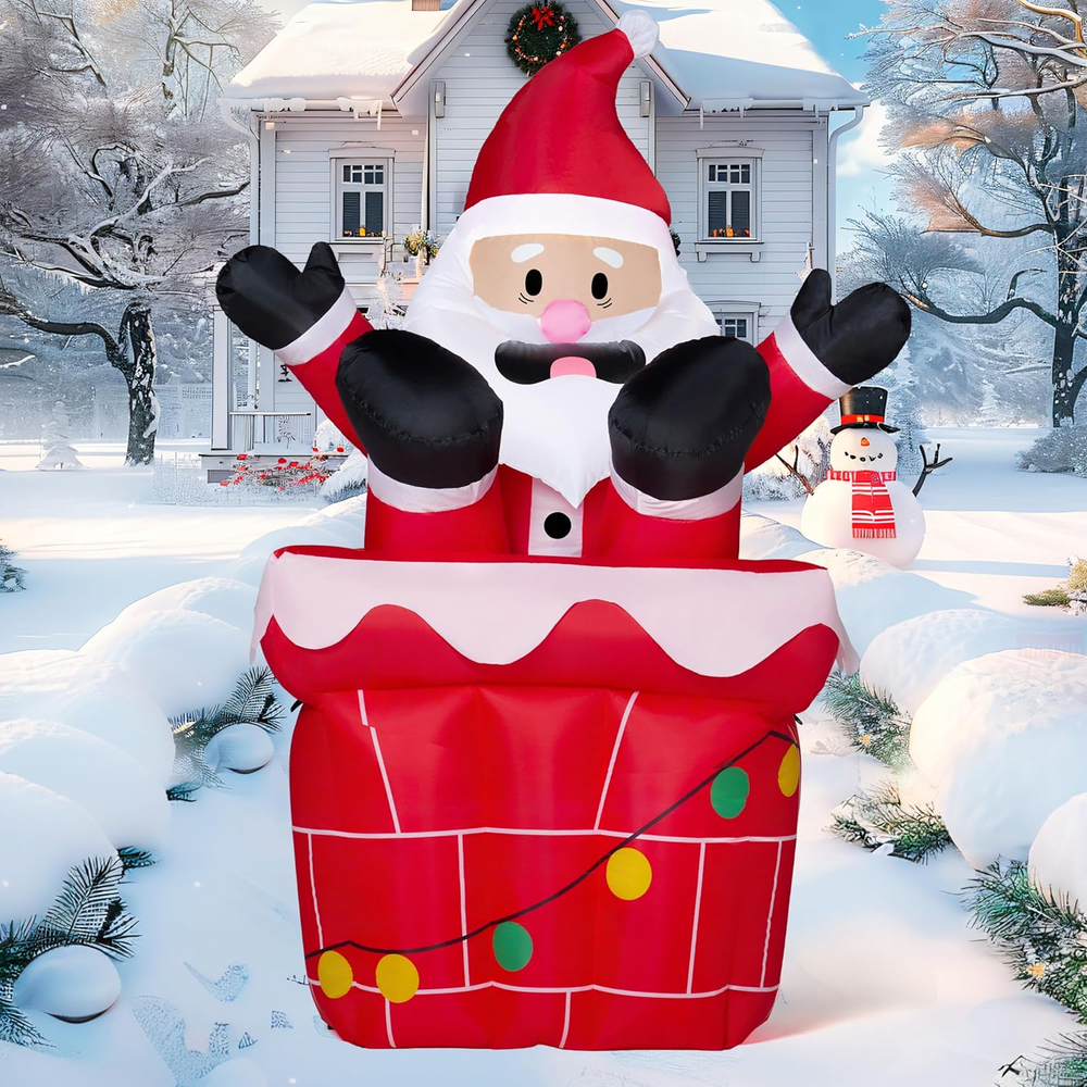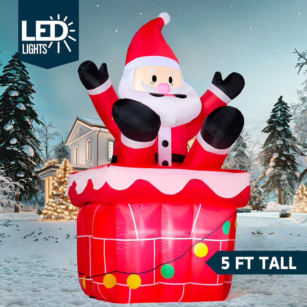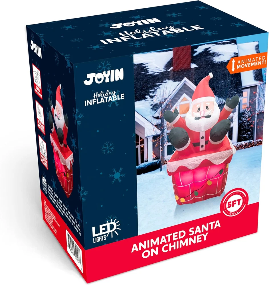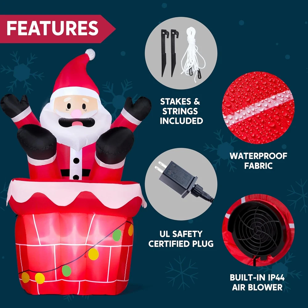 Adorably Funny 5ft Inflatable Santa – This jolly inflatable Santa is 5 feet tall and features him stuck mid-way in a brick chimney—an instant hit with kids and adults alike! It’s a fun and festive twist on a classic Christmas scene. Animated Fun with LED Glow – The animated movement of Santa struggling in the chimney, combined with built-in LED lights, creates an eye-catching and entertaining nighttime display that brings your yard to life. UL Certified for Safety – Includes a UL certified adapter, strong built-in blower, stakes, and tethers—ensuring safe and stable use throughout the season. Perfect for Any Outdoor Display – Whether on your lawn, porch, or by the driveway, this Christmas inflatable outdoor decoration is a must-have. Add it to your collection of Christmas blow up yard decorations to create a holiday scene everyone will love. Quick Setup & Long-Lasting Smiles – Inflates in minutes and is made with durable, weather-resistant material to handle winter conditions. Families love it for the fun animation, easy setup, and festive charm that delights guests all season long! Product description