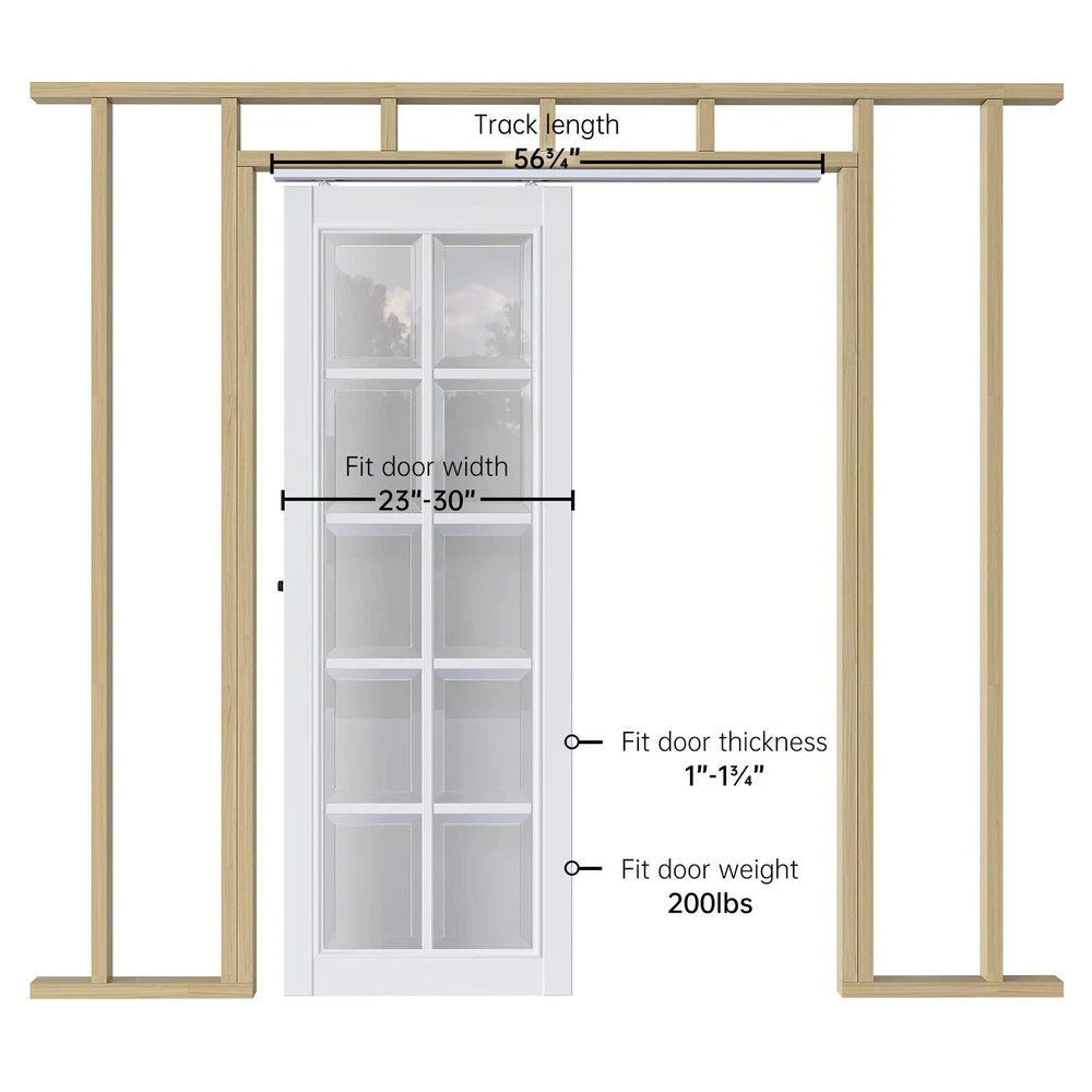 Commercial Grade Pocket Door Hardware: High precision aluminum box track for pocket door, concealed sliding ensures beauty and durable. Pocket door track can be cut into any length to meet your own require Soft Close Sliding Door Track: Ball bearing three wheel roller slide smoothly and quietly, tested beyond 100,000 rolls. The quick-release locking tab makes it easy to install or remove the door without the need to run the door panel off the rail Package Includes:(1)56-3/4" rail,(2)rollers,(1)door stops,(2)floor guide. DOOR NOT INCLUDED. Fit door width 23"~30";Fit door thickness 1" ~ 1-3/4"(25mm~45mm); Door weight capacity: 200lbs Easy Install: Easy installation tracks for sliding closet doors. We provide step-by-step graphic & text installation parsing manual, you can also get soft online copy and professional installation guide from our online service. All items have been multiple inspected before on market 24 Hours Stand By: specialize in sliding door and hardware many years, if there anything missed or broken, please let us know, we are whole day online to solve your problem Notice: Our track length is 56inch instead of 60inch, and the spare 2 inches at each end is reserved for service
