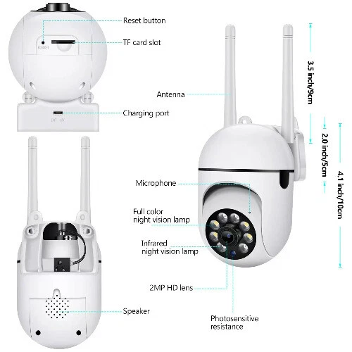 Specification: 1.Resolution:3/5MP,white/black 2.Sensor Resolution:1/2.9″SC2006. 3.Lens:4MM. 4.View angle:90°. 5.Pan-tilt:Rotates Horizontal:350° Vertical:90°. 6.LED quantity:4pcs white LED + 4pcs Infrared LED. 7.Network connection:WIFI, AP Hotspot 8.Network:WIFI wireless transmission (support IEEE802.11b/g/n wireless protocol). 9.Night vision:IR-CUT switch Automatic,about 5-8meters (It varies from environment). 10.White Led can be remote control via APP:①Turn ON ②Turn OFF ③ Auto(In automatic mode, the infrared light will be turned ON after the IR-cut switch to night vision automatically , it can intelligently detected human body, and Turn ON/OFF the White light intelligently ). 11.Audio:Built-in microphone and speaker, support two-way audio and real-time transmission,ADPCM audio compression standard, self-adapt to code stream. 12.Alarm:Motion detection and Alarm video push . 13.TF Card(Max 128G);Cloud storage /Cloud disk (optional). 14.Working temperature:-10℃ ~ + 50℃ Working Humidity: ≤95%RH. PTZ Rotation Remote Control 5MP camera :355° horizontal viewing angle, 90 °Vertical viewing angle. You can monitor your home in all directions. No angle can be out of the surveillance. Digital zoom (4x) function allows you to zoom in to see more details and zoom out to see the entire field of view. Intelligent night vision function Support night full-color mode, infrared mode and double-light alarm Clear two-way audio The camera has a built-in microphone and speaker. This outdoor security camera allows you to have a stable conversation through the application. You can listen and talk with your family and guests when you are not at home, or scare away intruders. Smart Motion Detection When a moving person or object is detected, it will automatically send a message to your mobile phone software Dual light mode 1. Switch to normal night vision mode, and the camera's four infrared lights work. The night monitoring image is black and white, and the day is color 2. Switch to intelligent full-color mode, and the camera defaults to infrared night vision. When someone moves around to trigger the camera motion detection function, the white light is turned on, the infrared light is turned off, and the full-color night vision instrument is turned on immediately, which will scare the thief. Multi-platform control Download "YIIOT" on your mobile phone or computer, and after successfully connecting to the camera, you can realize multi-platform, multi-user remote control and viewing, without regional restrictions, even if you are traveling Easy to install You can install it anywhere you want, street, bedroom, yard, roof. . . It is worth mentioning that one software can connect multiple cameras, and you can control them at the same time. Store Cloud storage is supported, but you need to pay for it. We recommend buying a memory card, which supports up to 128G. It can last for one month, and you only need to clean up the videos regularly. Payment Delivery details Returns Contact Us Feedback Payment 1.We accept PayPal only. 2.Payment must be received within 7 business days of auction closing. 3.We ship to your eBay or Paypal address. Please make sure your eBay and Paypal address is correct before you pay. Delivery details We try our best to ship out same day for payment cleared before 5.00 PM (Pacific Time) , Order placed on weekend or holiday will be shipped on Monday or next working day. Below is the approximate delivery time to different countries (just estimated, not guaranteed): 7-25 working days to buyer in USA. Returns 1.We offer 30 days return policy. Please contact us within 30 days from the date you receive your order if you have any issues with the product and want to return. 2.All items must be returned in the original packaging and you must provide us with the tracking shipping number, specific reason for the return, and your eBay ID. 3.We will refund you FULL WINNING BID AMOUNT, upon receipt of the item in its original condition and packaging with all components and accessories included, AFTER BOTH Buyer and Seller cancel the eBay transaction. Or, you can choose to get a replacement. Contact Us All communication is done through EBAY MESSAGES ONLY. If any question, please feel free to contact us via "Ask seller a question" or "Contact Seller",We try our best to reply to your emails as soon as possible, due to high volume of daily incoming emails and time zone difference, we may not be able to reply your emails immediately. Please allow 1-2 business days for us to response. Feedback Feedbacks: When you receive the item and satisfied with the product, please leave us positive feedback. If for any reason you are not satisfied with your purchase from us, please contact so we can get to work and resolve this issue for you. Please don't leave neutral or negative feedback without giving us an opportunity to try and make it right. Our goal is to ensure a happy shopping experience with us. Your Positive feedback is very much appreciated!