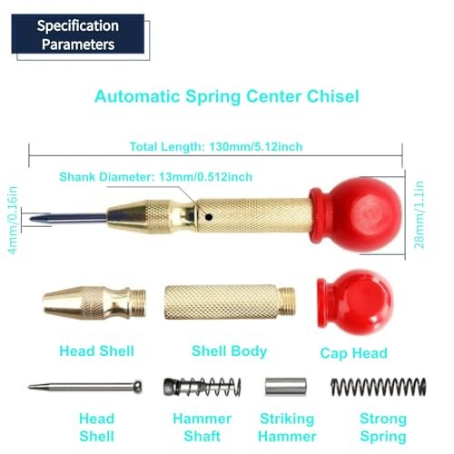 5-Inch Automatic Spring Loaded Center Punch for Metal | Adjustable Red,Silver Product Details Product Dimensions : 2.8 x 1.2 x 5 inches; 2.08 ounces Item model number : wtcp5in Manufacturer : WARMTREE Material: Alloy Steel Color: Red,Silver Brand: warmtree Product Dimensions: 2.8"L x 1.2"W x 5"H Operation Mode: Automatic Precision Marking for Any Material: Engineered for metal, wood, plastic, glass, and leather, this 5-inch automatic center punch features an adjustable spring-loaded stroke and cap to tackle projects of all sizes—perfect for marking drill holes, nails, or indentations with accuracy. Durable S2 Steel Tip & Spring-Driven Power: The hardened S2 steel awl tip ensures clean, precise marks on even the toughest surfaces, while the spring-loaded mechanism delivers consistent impact force without manual hammering—ideal for on-the-go jobs and professional use. Corrosion-Resistant & Heavy-Duty Build: Chrome-plated steel body withstands repeated impacts and resists rust, ensuring long-lasting performance. The reinforced tip maintains sharpness through heavy use, making it a reliable tool for metalworking, woodworking, and DIY tasks. Non-Slip Grip & Effortless Operation: Textured handle provides a secure, comfortable hold for maximum control, even in oily or wet conditions. Simply push down firmly to activate—no setup required—for quick, consistent hole marking every time. All-in-One Versatility: Doubles as a glass breaker for emergency use, making it perfect for automotive repairs, leather crafting, or construction. Replace multiple tools with this single, efficient punch that handles drilling, punching, and marking with ease. Upgrade Your Marking Game with the Ultimate Spring Loaded Center Punch! Tired of inaccurate drill holes or flimsy marking tools? Our 5-inch automatic center punch combines durability, precision, and versatility to tackle any material—metal, wood, plastic, glass, or leather—with professional-grade results. Key Features: ✅ Adjustable Spring Loaded Design: Customize the stroke length with the easy-twist cap to match your project’s needs, from light indentations on leather to heavy-duty marks on steel. ✅ Premium S2 Steel Tip: Engineered to resist wear and tear, the hardened steel awl creates sharp, clear starting points for drills or nails, reducing slippage and improving accuracy. ✅ Built to Last: Chrome-plated steel body stands up to daily impacts and harsh environments, while the corrosion-resistant finish ensures longevity even in wet or humid conditions. ✅ User-Friendly Operation: Non-slip grip provides steady control, and the automatic spring mechanism eliminates the need for a hammer—simply press down to mark holes in seconds. ✅ Multi-Purpose Tool: Not just for metal! Use it as a glass breaker in emergencies, an awl for leatherworking, or a precision punch for wood and plastic—one tool for endless applications. Perfect for Professionals & DIY Enthusiasts: Whether you’re a mechanic, carpenter, or home hobbyist, this center punch simplifies marking tasks for drilling, riveting, or crafting. Its compact 5-inch size fits easily in tool bags, making it ideal for on-site jobs or workshop projects. Get Accurate Marks Every Time—No Guesswork Needed! Say goodbye to messy, uneven holes. Trust our spring-loaded center punch to deliver the precision and reliability you need, project after project. Add to cart today and experience the difference of a tool built for performance!