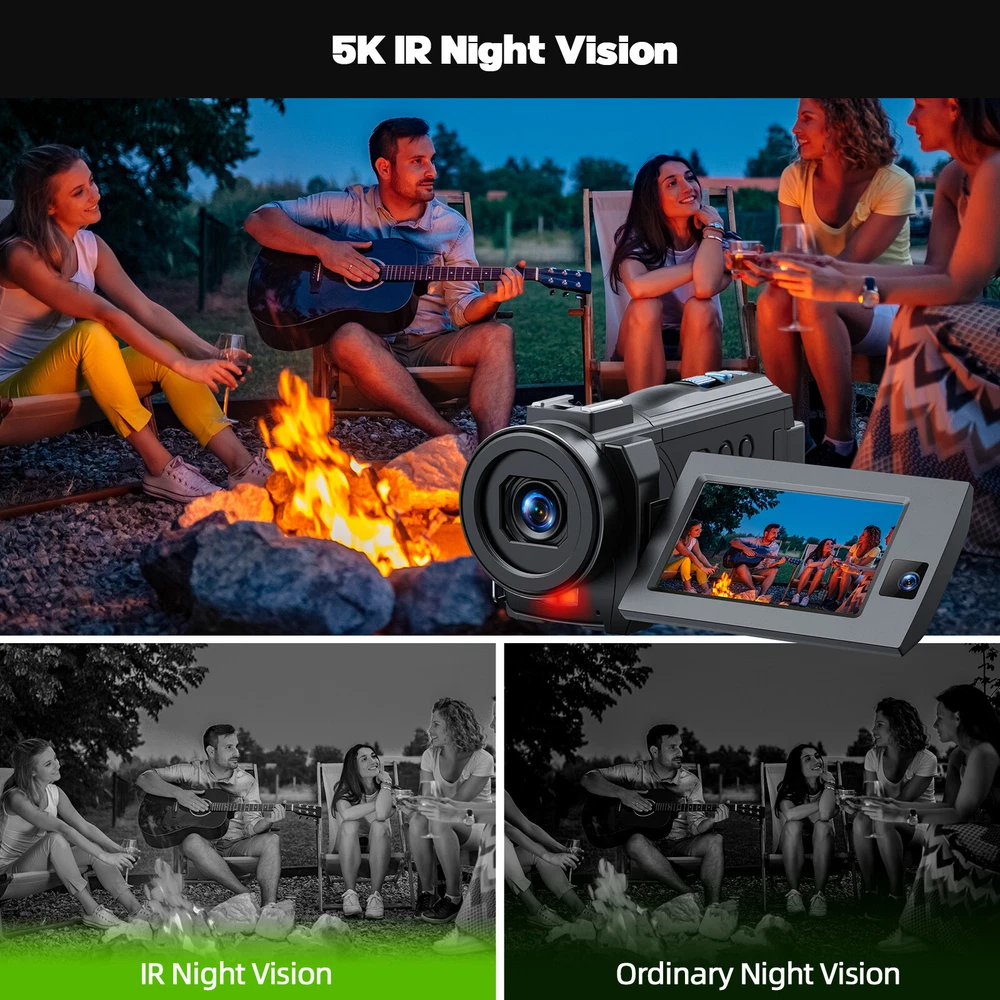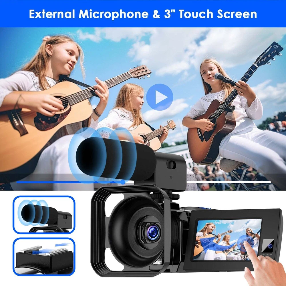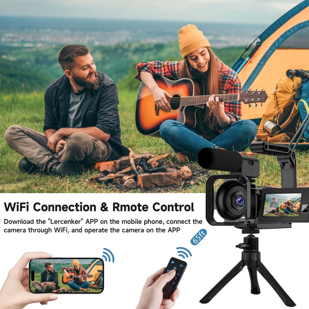 【2024 New upgrade】 US STOCK! Fast delivery, Fast received!!! 5K Video Camera 56MP Dual Lens Camcorder WiFi IR Night Vision Vlogging Camera for YouTube 16X Digital Zoom 3.0" Touchscreen Video Recorder with 2 Batteries, 64G SD Card ,Microphone, Lens Hood, Remote, Tripod 5K UHD Dual Lens Video Camera----Record Your Wonderful Moments 【UHD 5K Camcorder with 64GB SD Card】 This video camera can record UHD front-end 5K videos and 56MP images. Equipped with a unique dual lens that can simultaneously record front-end 4K + 1080P rear-end , allowing you to record yourself while recording your life. This 5K camcorder not only has a 16x digital zoom function, but also comes with a 3.0-inch 270° rotating IPS touch screen, allowing you to easily take photos and record videos at any angle. 【WiFi & IR Night Vision】 Connect this 5K camera via WIFI, you can use the downloaded APP (Lercenker) to wirelessly transfer photos and videos to your mobile phone or tablet, so that you can easily download and share with family and friends anytime, anywhere. The infrared night vision function allows you to take clear black and white photos and videos in dim environments with richer details. This camera is also equipped with a 2.4G 360° wireless remote control for remote control. 【Webcam & HDMI Output】 This vlogging camera can be used as a webcam for online live broadcast and video calls. Just connect this camera to your computer via a USB data cable and select "PC Cam" to enter webcam mode. You can also connect this vlog camera to a TV with an HDMI cable to share your wonderful moments on a big screen. Comes with a 64G SD card to increase storage space 【Lens Hood & Handheld Stabilizer & Tripod】 This YouTube camera comes with complete accessories to meet all your needs. Lens hood, which blocks excess light and protects your video recorder lens from accidental damage. Foldable handheld stabilizer and tripod keep the 5K camera stable while recording, suitable for mobile videos and low-angle images. External microphone is able to reduce noise and receive clear sound, suitable for travel, meetings, weddings. 【Multi-function camera with long battery life】 This video recorder support continuous shooting, Selfie, time-lapse recording, loop recording, slow motion, WDR, dual-lens/single-lens mode switching to meet your different needs. Equipped with 2*1700mAh rechargeable batteries, a fully charged battery can be used continuously for 90 minutes, and supports recording while charging to extend the recording time. If you have any questions about the camera, please contact after-sales in time, we will provide 24-hour online support. What's in the box? 1*64G SD card,2*Lithium battery 1*USB cable,1*HDMI cable 1*Remote control,1*Folding handle, 1*External hood,1*External microphone,1*Gimbal tripod 1*Instruction manual,1*DV bag Warm Tips: 1. Before use, please read the user manual carefully, which contains instructions for using the camera and any problems you may encounter. 2. Contains a 64G SD CARD . Please insert the memory card and format it with the camera before use. 3. Turn off the power before replacing the SD card, otherwise it will damage the memory card or cause data loss. 4. This camera is NOT waterproof. DO NOT let the camera contact with water or other liquids. 5. The Windows system limits a single video to no more than 4G, so your long video will be divided into 3-5 minutes segments. 6. The camera is an 16x fixed focus lens rather than zoom or focus. The recommended optimal shooting distance is greater than 60cm. 7. When using a wireless remote control, please remove obstacles between the camera and the remote control. The optimal remote control distance is NOT more than 6 meters. 8. The camera only supports one-to-one connections and cannot access the Internet. UHD 5K & 56MP Video Camcorder The new dual-recording lens can shoot ultra-high-definition 5K front-end videos, and when the dual lenses are used simultaneously, they can shoot 4K front-end + 1080p rear-end videos , making it possible to show people and scenery at the same time. WiFi Function& External Microphon e Download the APP (Lercenker) on the mobile phone, connect the video camera through WiFi, and operate the blog camera on the APP. You can transfer videos and photos to your phone to share with family and friends. Foldable Handheld Holder The foldable handheld stabilizer is small and portable, saves space, and is easy to install, allowing you to shoot more stable low-angle videos and record your sports moments. 3'' 270° Rotation IPS Touch Screen The YouTube camera is equipped with a 3'' 270° Rotation touchscreen, allowing you to shoot at any angle. You can operate it by tapping the screen, without the trouble of complicated buttons. External Microphone The digital camera is equipped with an external microphone, which can reduce noise, improve audio and video quality, and make the video sound clear and stable. Adjustable Tripod There is a standard 1/4 threaded connector on the bottom of the portable camera. You can mount the HD camera on a standard tripod (included) and place it on the ground or on a table to take group photos. Multifunctional Video Recorder---Meet Your Various Needs Slow Motion ----The camcorders' slow-motion function can capture and display details of dynamic scenes, enhance visual effects, and record more details that the naked eye cannot capture. Time-lapse Recording- ---The time-lapse function can record the beauty of natural scenery and feel the passage of time. It is the best choice for photographing natural scenery. Continuous Shooting ----The continuous shooting function can capture fast-moving objects, which is suitable for recording children's play moments and preserving warm pictures. Self-timer ----The selfie function allows you to record your life while not forgetting to record your own wonderful moments, improving your sense of happiness. Recording While Charging ----allowing you to shoot without 