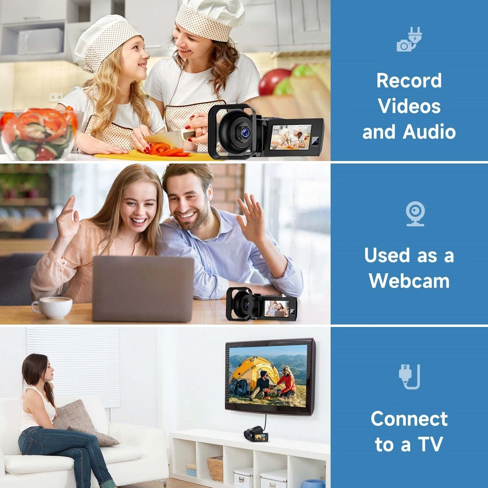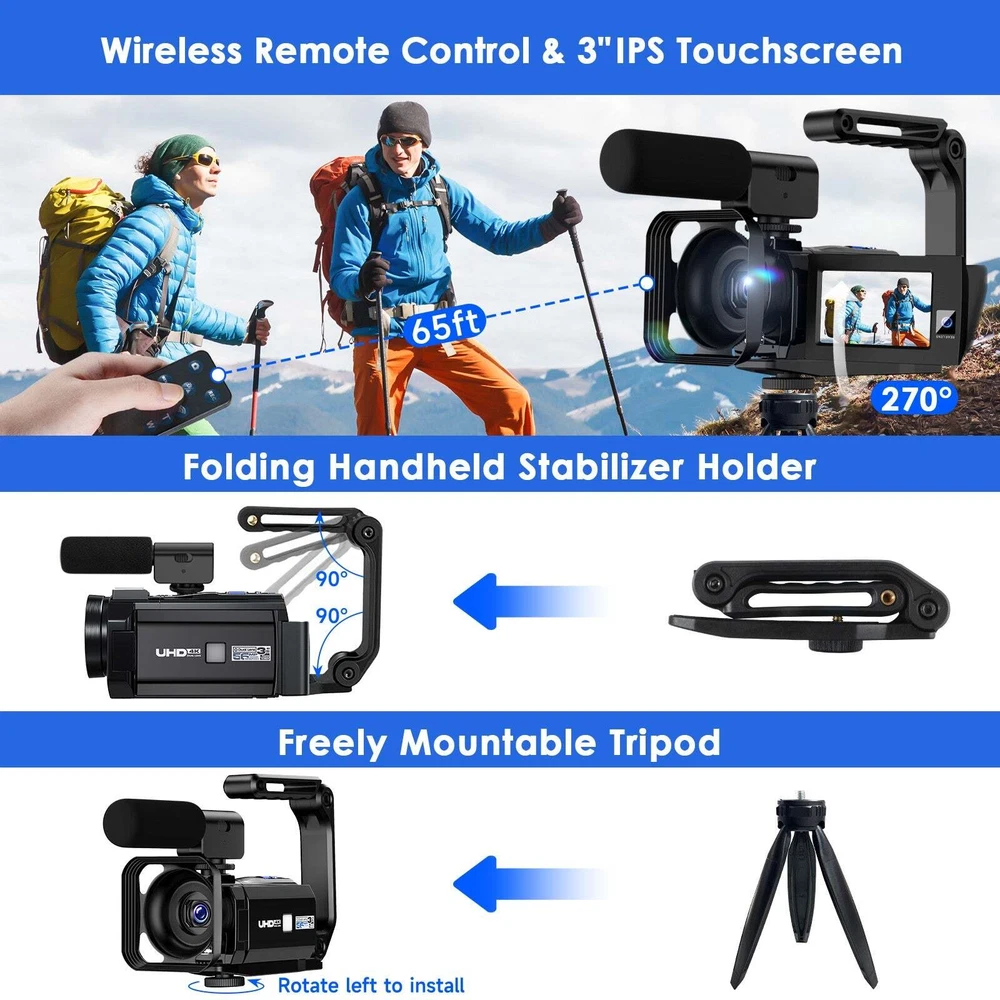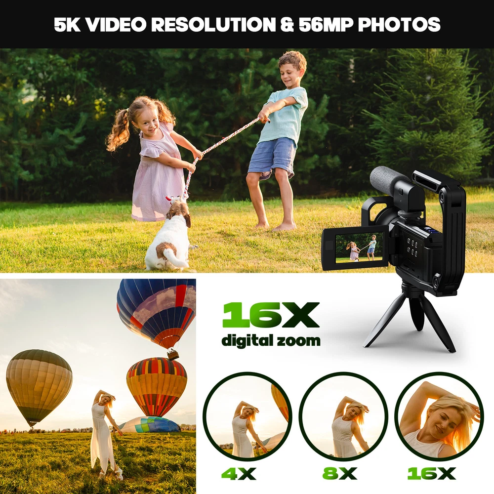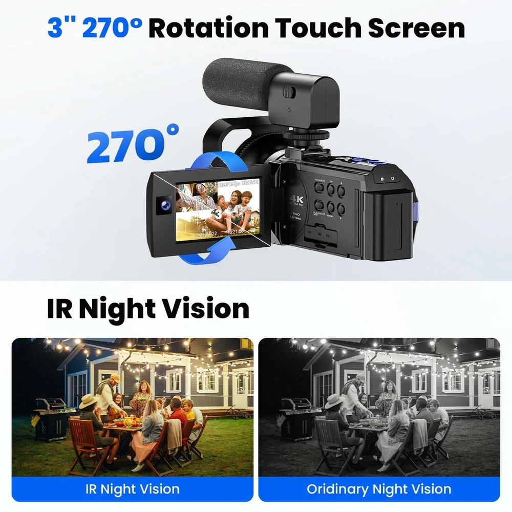 【2024 New upgrade】 US STOCK! Fast delivery, Fast received!!! 5K Video Camera 56MP Dual Lens Camcorder WiFi IR Night Vision Vlogging Camera for YouTube 16X Digital Zoom 3.0" Touchscreen Video Recorder with 2 Batteries, 64G SD Card ,Microphone, Lens Hood, Remote, Tripod 5K UHD Dual Lens Video Camera----Record Your Wonderful Moments 【UHD 5K Camcorder with 64GB SD Card】 This video camera can record UHD front-end 5K videos and 56MP images. Equipped with a unique dual lens that can simultaneously record front-end 4K + 1080P rear-end , allowing you to record yourself while recording your life. This 5K camcorder not only has a 16x digital zoom function, but also comes with a 3.0-inch 270° rotating IPS touch screen, allowing you to easily take photos and record videos at any angle. 【WiFi & IR Night Vision】 Connect this 5K camera via WIFI, you can use the downloaded APP (Lercenker) to wirelessly transfer photos and videos to your mobile phone or tablet, so that you can easily download and share with family and friends anytime, anywhere. The infrared night vision function allows you to take clear black and white photos and videos in dim environments with richer details. This camera is also equipped with a 2.4G 360° wireless remote control for remote control. 【Webcam & HDMI Output】 This vlogging camera can be used as a webcam for online live broadcast and video calls. Just connect this camera to your computer via a USB data cable and select "PC Cam" to enter webcam mode. You can also connect this vlog camera to a TV with an HDMI cable to share your wonderful moments on a big screen. Comes with a 64G SD card to increase storage space 【Lens Hood & Handheld Stabilizer & Tripod】 This YouTube camera comes with complete accessories to meet all your needs. Lens hood, which blocks excess light and protects your video recorder lens from accidental damage. Foldable handheld stabilizer and tripod keep the 5K camera stable while recording, suitable for mobile videos and low-angle images. External microphone is able to reduce noise and receive clear sound, suitable for travel, meetings, weddings. 【Multi-function camera with long battery life】 This video recorder support continuous shooting, Selfie, time-lapse recording, loop recording, slow motion, WDR, dual-lens/single-lens mode switching to meet your different needs. Equipped with 2*1700mAh rechargeable batteries, a fully charged battery can be used continuously for 90 minutes, and supports recording while charging to extend the recording time. If you have any questions about the camera, please contact after-sales in time, we will provide 24-hour online support. What's in the box? 1*64G SD card,2*Lithium battery 1*USB cable,1*HDMI cable 1*Remote control,1*Folding handle, 1*External hood,1*External microphone,1*Gimbal tripod 1*Instruction manual,1*DV bag Warm Tips: 1. Before use, please read the user manual carefully, which contains instructions for using the camera and any problems you may encounter. 2. Contains a 64G SD CARD . Please insert the memory card and format it with the camera before use. 3. Turn off the power before replacing the SD card, otherwise it will damage the memory card or cause data loss. 4. This camera is NOT waterproof. DO NOT let the camera contact with water or other liquids. 5. The Windows system limits a single video to no more than 4G, so your long video will be divided into 3-5 minutes segments. 6. The camera is an 16x fixed focus lens rather than zoom or focus. The recommended optimal shooting distance is greater than 60cm. 7. When using a wireless remote control, please remove obstacles between the camera and the remote control. The optimal remote control distance is NOT more than 6 meters. 8. The camera only supports one-to-one connections and cannot access the Internet. UHD 5K & 56MP Video Camcorder The new dual-recording lens can shoot ultra-high-definition 5K front-end videos, and when the dual lenses are used simultaneously, they can shoot 4K front-end + 1080p rear-end videos , making it possible to show people and scenery at the same time. WiFi Function& External Microphon e Download the APP (Lercenker) on the mobile phone, connect the video camera through WiFi, and operate the blog camera on the APP. You can transfer videos and photos to your phone to share with family and friends. Foldable Handheld Holder The foldable handheld stabilizer is small and portable, saves space, and is easy to install, allowing you to shoot more stable low-angle videos and record your sports moments. 3'' 270° Rotation IPS Touch Screen The YouTube camera is equipped with a 3'' 270° Rotation touchscreen, allowing you to shoot at any angle. You can operate it by tapping the screen, without the trouble of complicated buttons. External Microphone The digital camera is equipped with an external microphone, which can reduce noise, improve audio and video quality, and make the video sound clear and stable. Adjustable Tripod There is a standard 1/4 threaded connector on the bottom of the portable camera. You can mount the HD camera on a standard tripod (included) and place it on the ground or on a table to take group photos. Multifunctional Video Recorder---Meet Your Various Needs Slow Motion ----The camcorders' slow-motion function can capture and display details of dynamic scenes, enhance visual effects, and record more details that the naked eye cannot capture. Time-lapse Recording- ---The time-lapse function can record the beauty of natural scenery and feel the passage of time. It is the best choice for photographing natural scenery. Continuous Shooting ----The continuous shooting function can capture fast-moving objects, which is suitable for recording children's play moments and preserving warm pictures. Self-timer ----The selfie function allows you to record your life while not forgetting to record your own wonderful moments, improving your sense of happiness. Recording While Charging ----allowing you to shoot without 