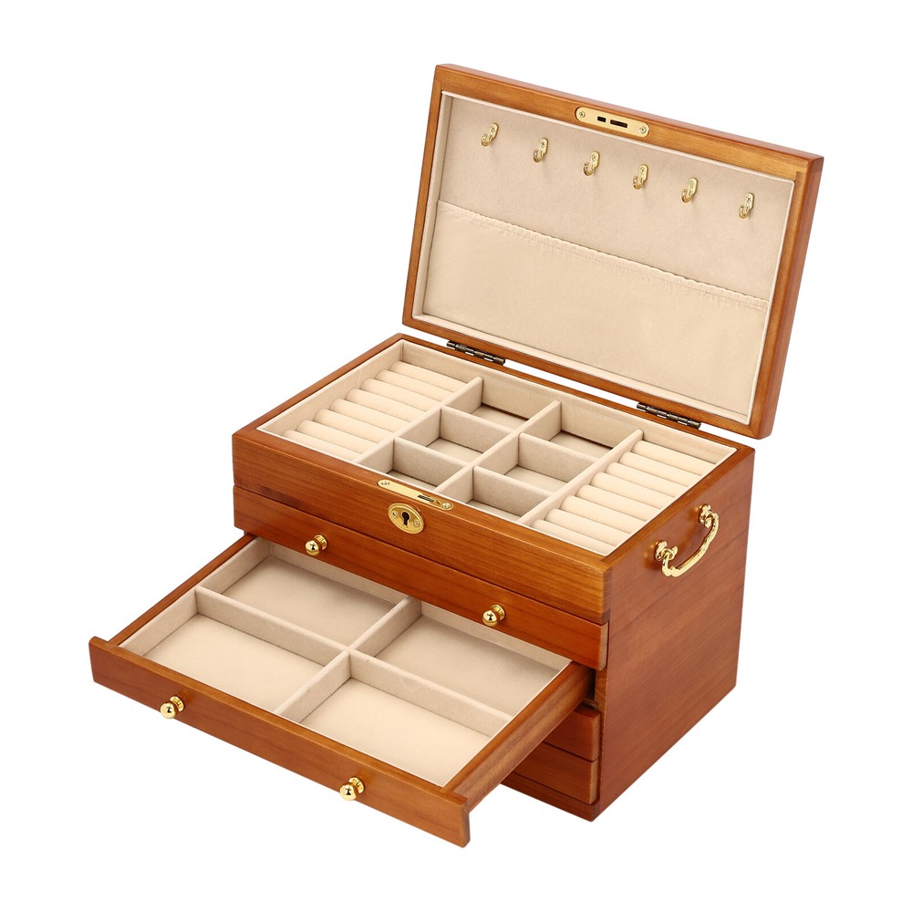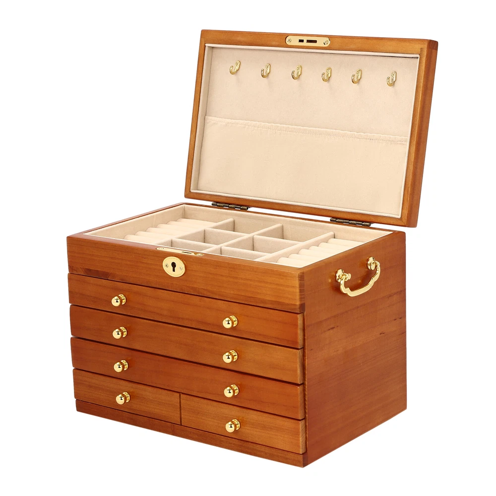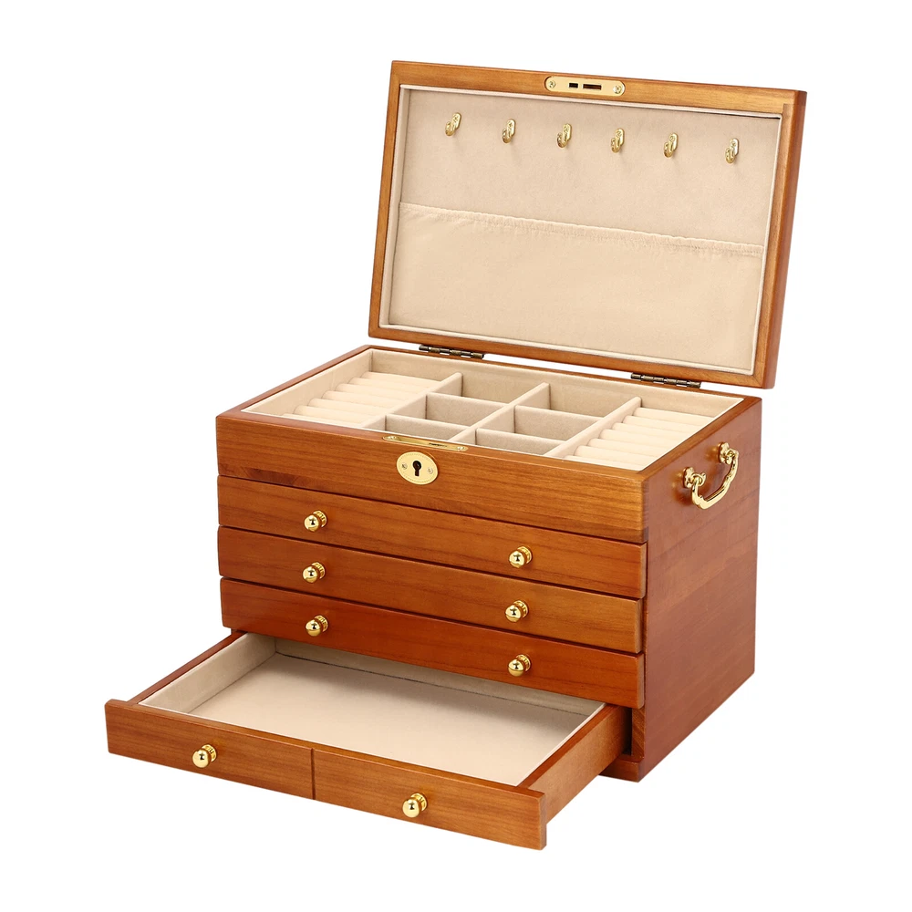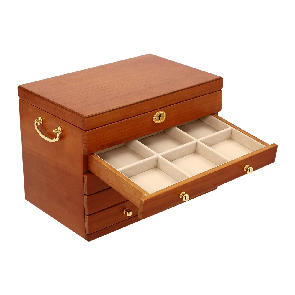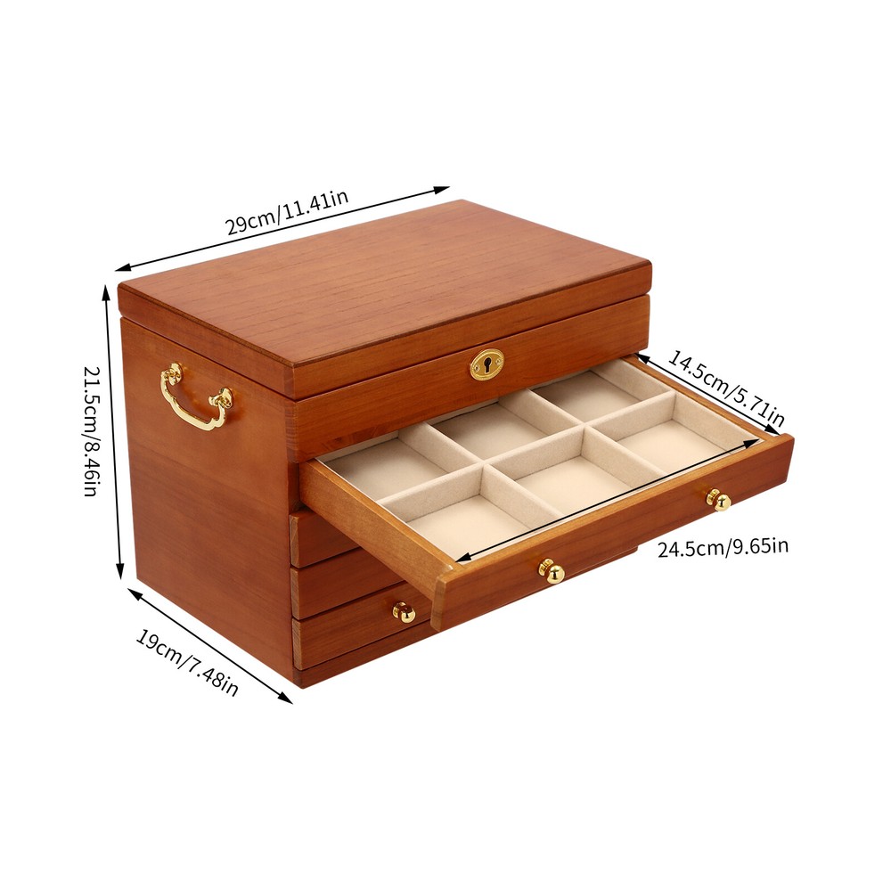 5-Layer Large Wooden Jewelry Storage Box Ring Necklace Organizer with 4 Drawers Jewelry Box Wooden for Wowen Gifts 5-Layer Large Organizer Box with 4 Drawers US ??Description ✨_Is your jewelry often cluttered and impossible to find? Do you have too much jewelry without a large enough storage box? If you answered yes to any of these questions, then this four-tier jewelry box is for you. The four-tier storage design allows you to store many different types and sizes of jewelry. The wood material makes this jewelry box more vintage and elegant, not only to help with storage but also as a decorative piece to keep in your home. ?? Specifications Material: Sycamore Wood + Metal+Flocked Fabric Color: Walnut Color Number of Drawers: 4 Closure Type: Key Lock Handle Placement: Sides Hook Material: Hardware Gross Weight: 3.5kg/7.7lbs Net Weight: 3kg/6.6lbs Package Size: 35*26.5*28cm/13.8*10.4*11inch Product Size: 29*19* 21.5cm/11.42*7.48*8.46inch Package Included 1* Wooden Jewelry Box 1* Key ?? Key Features High-quality Materials: The jewelry box is made of sycamore wood with veneer and lacquer treatment, which is not only very durable but also attractive. The interior has a soft long flocked cloth as a lining to keep your jewelry from being scratched and crushed. Beautiful Appearance: The production process of the jewelry box retains the natural color of the wood, the surface is polished and smooth and the texture is visible. Large Capacity: This jewelry box has 4 drawers. Each of these drawers contains a different number of compartments to store many different types and sizes of jewelry. Full Pull-out Drawer: The drawer of this jewelry box is a full pull-out design, which can display all the jewelry and make it more convenient for you to get it. Safety Latch: The safety latch on the lid is designed to keep this item securely locked. This will protect your rings, earrings, necklaces, watches, and other jewelry accessories. Metal Hooks: This jewelry box has a layer of metal hooks specifically for necklaces, so you can hang your necklaces inside to prevent them from piling up and tying up, and such an intuitive design makes it easy to access. -------------------------- ?? ?? SEE MORE ?? ?? ----------------------- Fine Workmanship : From the smooth surface to the soft inner lining, even the sturdy locks and hooks are finely crafted to give you a better user experience. Reasonable Layout: Each level is divided into compartments of different sizes to facilitate a better display of your jewelry and easy access, especially the first layer has a dedicated area for storing rings, so you can store different types or sizes of jewelry separately. Ideal Gift : This jewelry box has a unique design with a beautiful appearance and a large capacity with practical features. It is an ideal gift for Valentine's Day, Mother's Day, Thanksgiving, Christmas, birthdays, and weddings. ?? Details High-quality Hinges: The hinge is made of high-quality hardware and is strong and durable. It has been tested many times to open and close, so you can use it with no worries. Exquisite Handles: Each compartment has a small and delicate handle for easy pulling out. Flocked Fabric: The lining of this jewelry box is made of soft, high-quality flocked fabric that is comfortable to the touch. It can protect your jewelry well from being crushed and scratched. Storage Pocket: A small pocket underneath the metal hook adds storage space to the jewelry box. You can also put the lower part of the necklace hanging from the hook into the pocket. Side Metal Handles: This jewelry box has polished and smooth metal handles on both sides, making it easy to move the jewelry box. ?? Application It is suitable for organizing various jewelry including sunglasses, watches, hairpins, earrings, rings, bracelets,watches, and necklaces. Notes Please allow the slight color difference caused by the shooting light and 1-3cm error due to manual measurement, and make sure you do not mind before ordering. Notes:2. The drawer of the product is movable. Please manually adjust the placement position of the drawer for neatness and beauty. Payment Delivery details Terms of sales About us Contact us Payment We accept ebay payment 。 Fees such as import duties, taxes are not included in the item price or shipping costs. These charges are the buyer's responsibility. Delivery details Shipping: 2-9 working days to: USA Terms of sales We maintain high standards of excellence and strive for hundred percent customer satisfaction. Feedback is very important to us. We hope that you contact us immediately before you give neutral or negative feedback, so that we can address your concerns. It is impossible to address issues if we do not know about them! About us Your satis faction is our ultimate goal. We work hard to earn your trust and future business. Our certified technicians have tested each item before shipping. The unit comes with 1 year limited warranty on all manufacturing defects. a) If you receive a defective item, you may return it or ask for a discount. Please contact us within 14 days after you receive the package. b) What you returned must be intact and in its original packaging as re? u. Customer is responsible for shipping costs of the returned item. c) We will cover the cost of shipping back t with the shipping rate indicated in the registration page. We will send you a new unit or refund the full payment you paid. Thank you. Contact us Business Hour Business Hour: Monday To Friday: 8:30 AM to 5:00 PM (Beijing China time) Due to time zones, our reply to your questions may not be immediately. But within above working time, we will reply your email within 24 hours. If it's non-workdays, please kindly be patient and wait till Monday. Please contact us with ebay message. Please feel free to contact us if you have any questions. Monday To Friday: 8:30 AM to 5:00 PM (Beijing China time) Due to time zones, our reply to your questions may not be immediately. But within