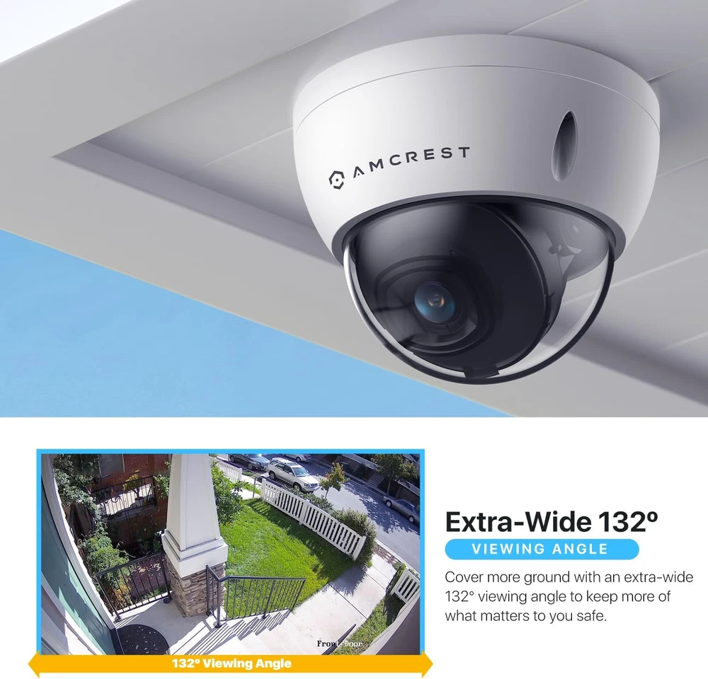 EXPERIENCE ULTRA HD – Stunning low-light 5MP performance with 1/2.7” image sensor and 5MP resolution (2592x1944). Super-wide 132° viewing angle allows you to cover more ground. Power Over Ethernet (POE camera) for easy installation (POE Injector or Switch Required; Not Included, Sold Separately). This is a FIXED IP camera and has ability to Pan/Tilt manually. SMARTER SECURITY & STORAGE OPTIONS – Receive motion alert notifications and review footage via your smartphone with the Amcrest View app. Playback and record professionally on a PC using the Amcrest Surveillance Pro software or third-party software such as Blue Iris. Works with Amcrest Cloud remote video storage, MicroSD Card (up to 256GB), Amcrest NVRs, QNAP NAS, FTP, Edge, Chrome, Mozilla Firefox & Safari. DAY OR NIGHT, RAIN OR SHINE – Built to weather any storm and the darkest of nights, this 5-Megapixel Dome PoE IP Camera features a heavy-duty metal weatherproof IP67 housing & IK10 Vandal Resistant Dome as well as built-in IR LEDs and a 1/2.7” progressive image sensor to achieve unsurpassed low-light capability and night-vision up to 98 feet. Dual H.265/H.246 compression allows for maximum encryption with the latest technology as well as backwards compatibility with legacy platforms. SECURE CLOUD VIDEO BACKUP – The optional Amcrest Cloud remote video storage subscription service allows you to automatically store your videos off-site in a third-party location hosted and secured by Amazon AWS. This way if something happens to your local PC/NVR/SDcard/NAS, the footage will be safely recorded in a secure off-site location and accessible to you through a web-based Flash interface for PC (Chrome/Firefox/Safari/Edge) and AmcrestCloud smartphone app. SIMPLE, RELIABLE, SECURE - At Amcrest, we want to ensure the safety of our customers, their loved ones, homes and businesses. You’ll receive a full 1-year US Warranty and Lifetime Support provided directly from Amcrest. Compatible with the following Amcrest Junction Boxes, ASIN: B0711CPL5Z, B071L2RDK2 & B07195BN8X Product Description 5MP UltraHD Resolution Experience magnificent 5MP UltraHD footage with the latest Starlight 1/2.8" CMOS image sensor and a 98.4° viewing angle. The Amcrest UltraHD camera soaks in the entire scene, dynamically painting all the vivid colors and rich imagery, pixel by pixel, onto your desktop or mobile device in 5MP UltraHD 2592x1944 resolution. Motion Detection Alerts Receive intelligent alerts that send notifications directly to your computer or smartphone via the Amcrest View Pro app anytime motion is detected. Create up to 4 motion detection zones and customize each zone's sensitivity to receive only the alerts that you need. Be notified anytime your smart home camera goes offline. Mobile Viewing & Storage View, record and playback UltraHD footage directly from your smartphone with the Amcrest View Pro or Amcrest Cloud app. Locally record HD footage directly to a 256GB MicroSD card (sold separately). Never worry about losing your footage with Amcrest Cloud optional Cloud storage plans. This product may contain components which are not NDAA compliant. IP67 Weatherproof The 5MP UltraHD PoE Indoor/Outdoor Camera is built to endure even the harshest weather conditions and protect against impacts. The camera is IK10 vandal-resistant and equipped with a heavy-duty IP67 weatherproof design to protect against dust, rain, hurricane level winds and is