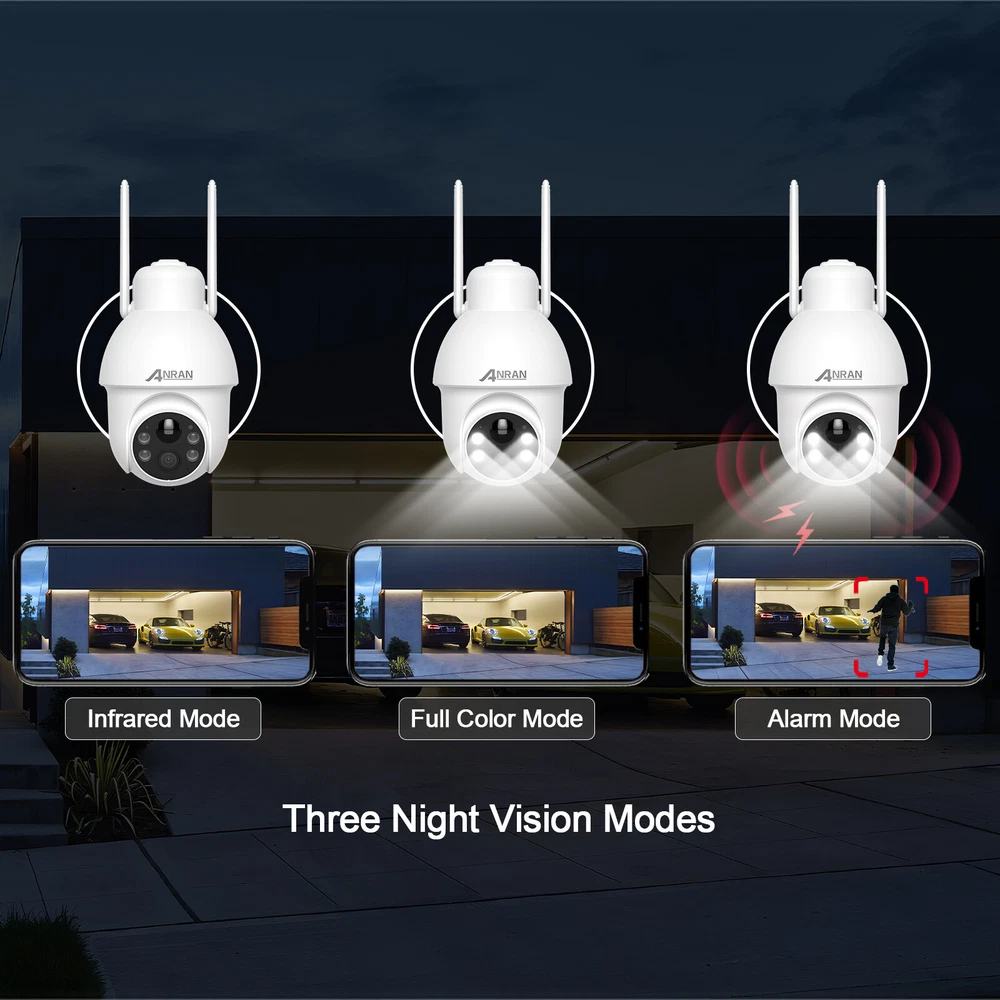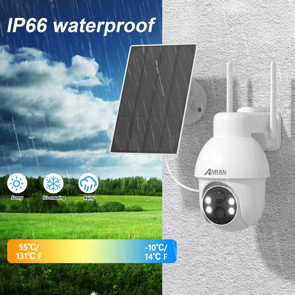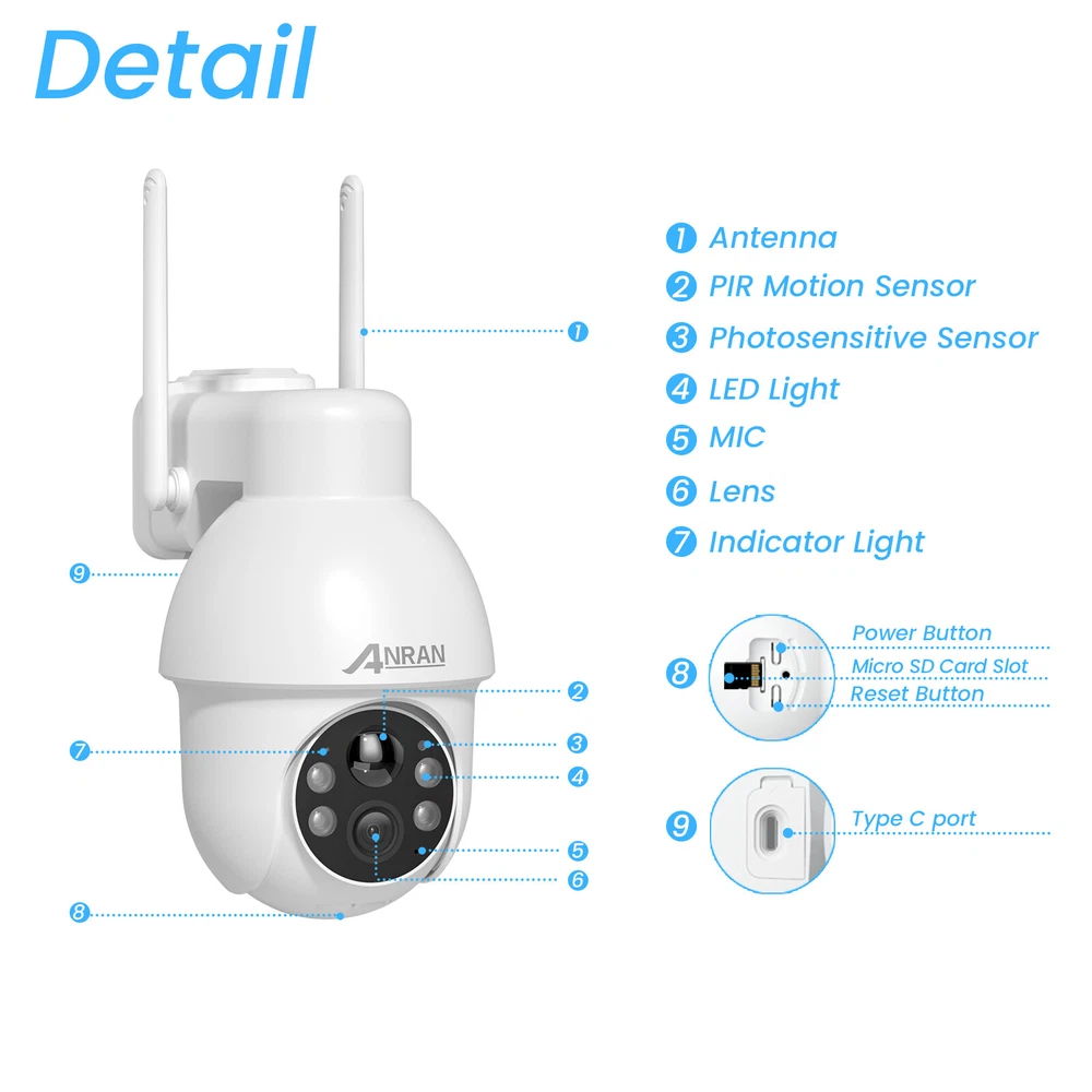 Note:1. The camera only can connect 2.4G wifi, can not work with 5G wifi 2. The camera use ANRAN app, can not work with ARCCTV app 3. Only can use alone, can not add to NVR system Cover Every Corner with pan tilt The security camera is designed with the rotation of a vertical 90 degrees and a horizontal 355 degrees; You can remote control the security camera to monitor all-round without blind spots. Two-way Audio Built-in microphone & speaker, you can see, hear and talk to anyone who appears on the screen of your device even though you are thousands of miles away. PIR Motion Sensor & Real-Time Alert The security camera has PIR human body infrared detection, which can effectively reduce false alarms caused by insect pests, leaves, rain and snow, etc. Smart Light Control This security camera delivers full-color videos or infrared night vision after sundown. You can see more valuable details to identify people, vehicles, and more objects. Clear 5MP FHD Video Ideal for home or business 5MP(2560x1920)Poffers exceptional Full HD resolution and quality enhancing efficiency and monitoring capabilities. Multiple Deterrences If the camera detects humanoid movements, the system will send out an alarm (Show message to APP, Send email, system buzzer). You can know that someone is approaching your home anytime, anywhere. Cloud /SD card Storage Our camera save motion-triggered videos to an SD card up to 128GB (not included). The wifi security camera will wake up within 0.8s after motion detection is triggerd. When the SD card is full, it will automatically cover the old video. IP66 Waterproof The Fully waterproof (IP66-rated) can operate perfectly in freezing or broiling temperatures (-10 °F – 131 °F), Rain or shine, always ready for extreme environments. Camera Details Copyright Alle Rechte vorbehalten. EBay Template Design On Jan 3, 2025 at 09:37:09 PST, seller added the following information:
