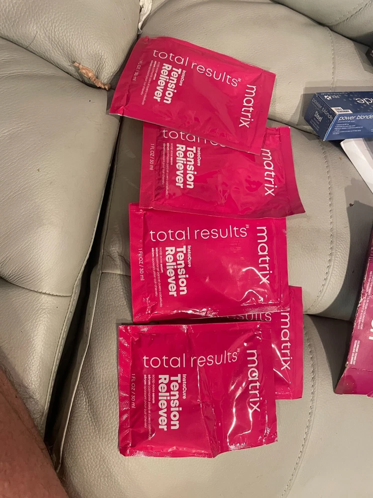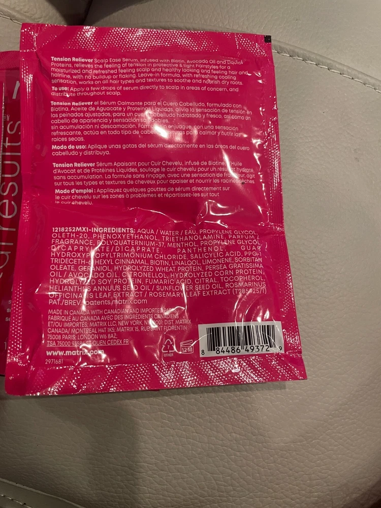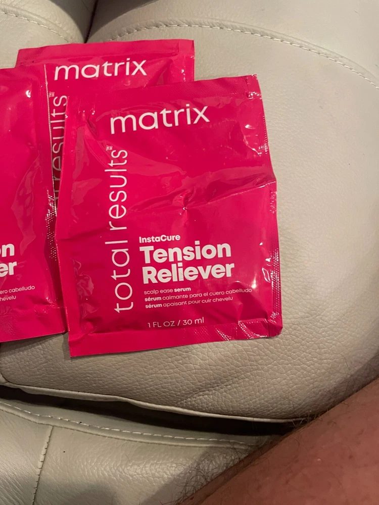 This 5 packet bundle of Matrix total results Tension Reliever serum is for people who have tender scalps. It has Avacado oil in it. The shipping is free. All returns subject to a 20% re stocking fee.