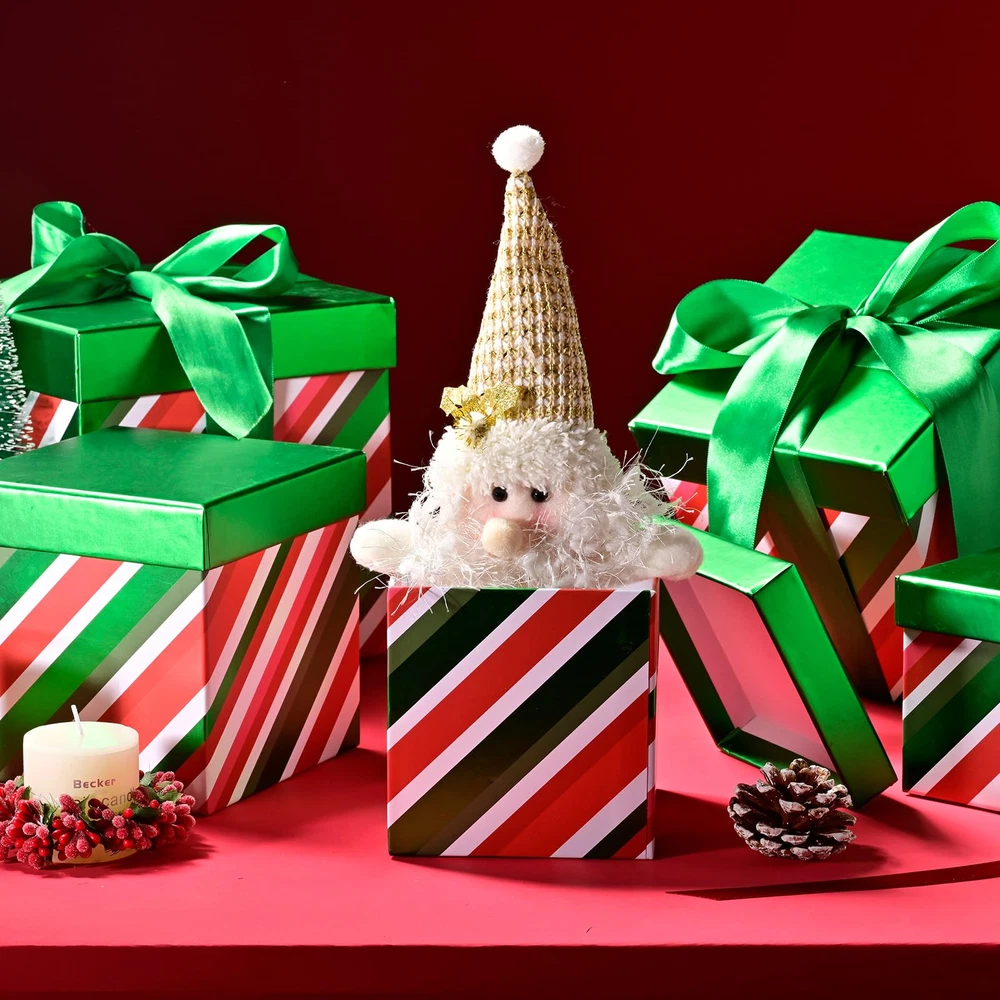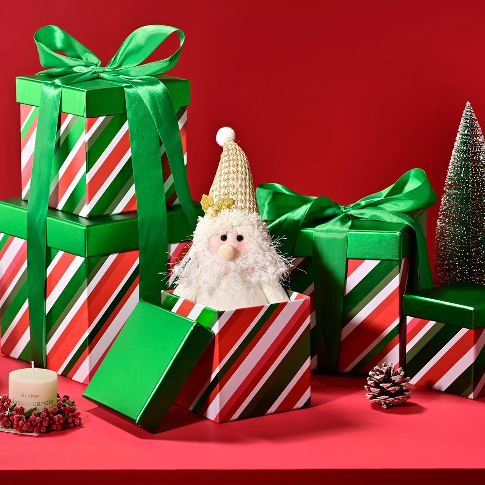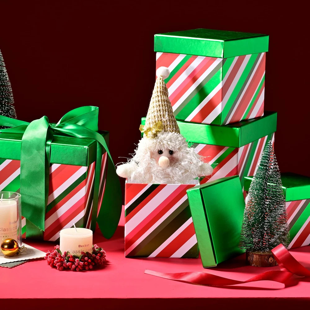 🌟 DECORATIVE HOLIDAY STORAGE ORGANIZER BOXES. Set of 5, Square Shaped, Stackable Gift Box Tower, Five Sizes Range From 7.1'', 6.3'', 5.5'', 4.7'' and 4". Heavy-Duty, 300g Paper Cardstocks, Great to Wrap Any Small to Medium Gifts Like Jewelry, Cosmetics, Books, Small Toys, Home Decors, and Apparels like Scarf, Candles, Candies. Adds Luxurious Seasonal Look. 🎁 READY TO GIFT, NO WRAPPING NEEDED VALUE PACK. No Gift Wapping Needed, Rigid Lid Durable Reusable. Just Put your Gifts Into These Lovely Boxes, Get Ready to Wow Your Loved Ones. Every Part of the Box is Well-Made, Sturdy, and Reliable for Every Packing Needs for Events and Parties Protect Your Gifts and Party Goodies. Ideal for DIY lovers and Artists Alike. 🎅 READY TO USE, RIBBON INCLUDED SET. Multifunctional premium gift packaging. Make your gift wrapping effortless to wow loved ones. Durable and reusable paper box set is excellent for elevating events and parties like thanksgiving, weddings, bridal showers, baby showers, birthdays, Christmas, Valentine's day, Hanukkah, Easter, mother's day, anniversaries, graduation, housewarming, and more. 🎄 LOW CARBON IMPACT MATERIAL. Green choice gift packaging for small businesses, store owners, party planners, hosts, designers, DIY lovers, crafters, homemakers, and artists. Use paper gift boxes for easy and minimal gift wrapping and home or party decorations. Our virgin pulp paper stock is reusable, non-toxic, chlorine-free, and bleach-free, safe for the environment and family. 🐱 JOY IN GIFTING. emerges from her sister brand UNIQOOO in LA. With premium gift wrapping and delicate seasonal decorations made from high-quality, non-toxic, recyclable, low-carbon impact paper, wood, and fabrics, is proud to make each gifting experience unforgettable.