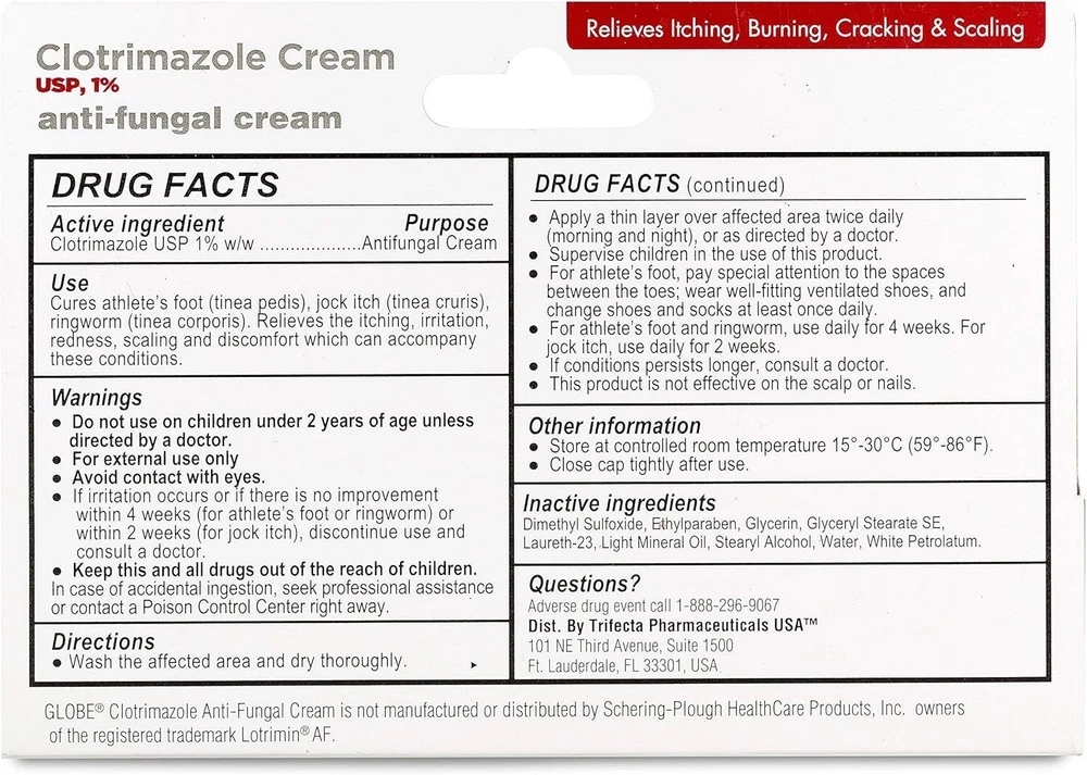 Free eBay listing template designed by dewiso.com Globe Clotrimazole Antifungal Cream 1% USP, 1 oz (5 Pack), Anti Fungal Treatment, Relieves Itching, Burning, Cracking and Scaling Associated Athletes Foot, Jock Itch, Ringworm and More EFFECTIVE TREATMENT: Combat athletes foot, jock itch, and ringworm with our clotrimazole antifungal cream. This proven formula effectively treats common fungal infections, making it a trusted solution for relief and recovery. RELIEVING FORMULA: Experience fast relief from itching, burning, cracking, and scaling with our antifungal cream for skin. Compare it to the Leading Name Brand, and enjoy the soothing power of clotrimazole 1% for effective healing. FRESH PRODUCT GUARANTEE: Receive a pharmacist-recommended, fresh clotrimazole antifungal cream every time you order. Trusted in the U.S., this fungal cream for skin is a go-to for treating foot fungus and jock itch effectively. PROVEN TO CURE: Globe clotrimazole cream delivers proven results against tinea cruris and tinea corporis. This powerful anti-fungal cream for skin offers a reliable solution for curing jock itch, ringworm, and other stubborn fungal infections. VERSATILE ANTIFUNGAL SOLUTION: Designed for a wide range of fungal infections, our clotrimazole antifungal cream 1% is ideal for treating athlete’s foot, jock itch, and ringworm. This anti fungal cream for skin delivers fast, effective relief for feet, body, and more. QUALITY: Manufactured in accordance with the highest pharmaceutical manufacturing processes and contains a NDC for 100% confidence. Trifecta Pharmaceuticals USA is located in Fort Lauderdale, Florida. All Globe Health Products are Manufactured at Audited Facilities. Contact us We can be contacted at any time through eBay messages if you have any questions, comments or product requests. We will respond to you within 24 hours and do our best to help you out! We encourage our customers to contact us with any questions or concerns! We'd like to be sure you are completely satisfied with your purchase. HAVE A NICE SHOPPING