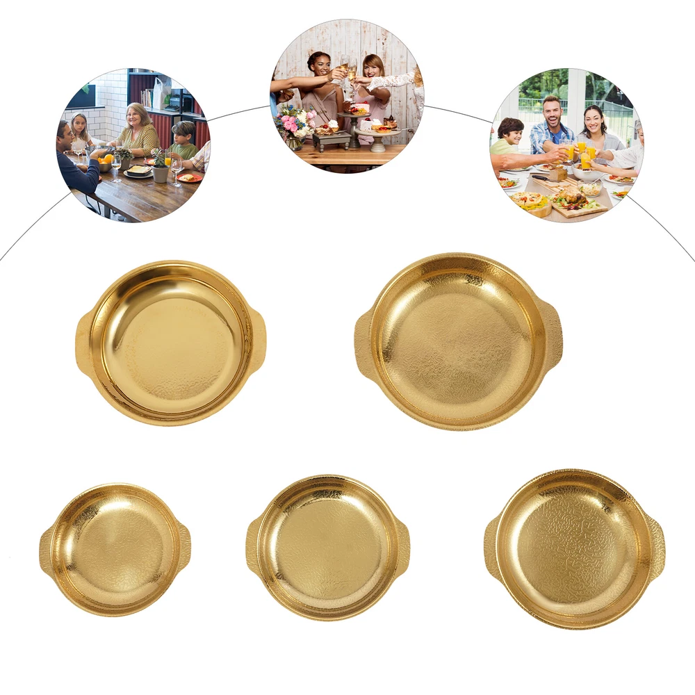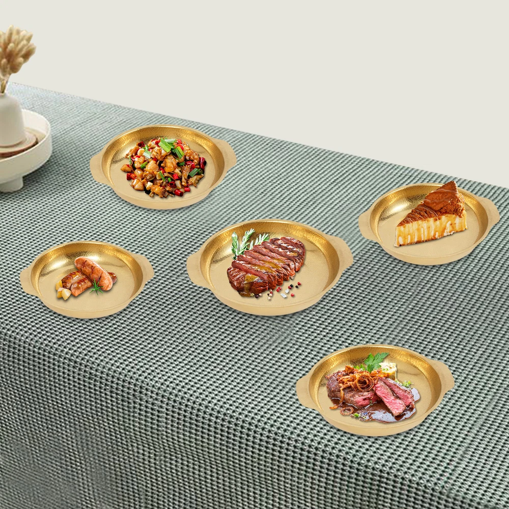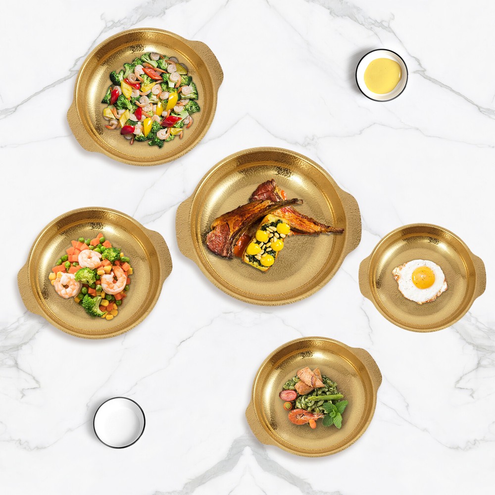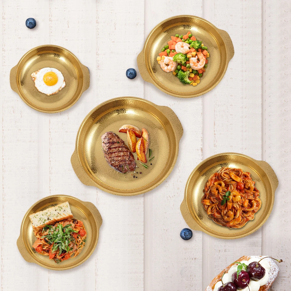 5Pcs Gold Paella Pans Food Serving Pan Seafood Pans Cookware Seafood Pan US Description Meticulously crafted from premium 410 stainless steel, this food serving pan set is not only corrosion-resistant and easy to clean, but also adds a touch of brilliance to your table with its unique shiny appearance. Whether it's a family gathering or a holiday celebration, it can be the ideal choice for showcasing your food and taste, turning every meal into a feast for both the eyes and the tastebuds. Key Features Made to Last: Made of 410 stainless steel with the gold plating process, the products are resistant to corrosion and rust and boast high hardness and a long service life. 5pcs a Set: The five pans in different sizes(7.09in, 7.87in, 8.66in, 9.45in, 10.24in) can meet your daily uses. You can also use them to set different dishes to brighten up your table. Good Appearance: The luxurious shine of gold color and unique texture make this set your unique tableware, bringing a sense of beauty and elegance to your table. Clean with Ease: Thanks to the stainless steel surface and simple structure, you can clean this product with rinse water and a damp cloth easily. Easy to Store: The five pans in different sizes allow you to stack them and store them in your cabinets, which is a great space saver. Ready to Use: Without assembly requirements, you can start to use them directly after receiving them and cleaning them. Ideal Gift: With good appearance and practical function, this set of products is an ideal gift for your friends, families, and colleagues. Buy with Confidence: We stand behind all our guests and look forward to assisting you with your purchase. It is our pleasure to answer your confusion and questions. The end of the story between us is not "we sell and you buy". Details Raised Edges: They can prevent the soup and food from spilling. In addition, these burr-free edges can protect your hands from getting scratched during daily use. Handle Design: Each product comes with convenient ear handles that allow you to easily serve the food with them. Application The product is suitable for banquets, restaurants, home kitchens, indoor and outdoor activities such as parties, garden events, camping, catering, or even a romantic dinner at home for serving pancakes, meats, vegetables, salads, seafood recipes, steaks, noodles, spaghetti, pasta, and various other foods. Specifications Color: Gold Material: 410 Stainless Steel Process: Gold Plating Mount Type: Free Standing, Tabletop Product Diameter: 18cm/7.09in, 20cm/7.87in, 22cm/8.66in, 24cm/9.45in, 26cm/10.24in Package Size: 32*32*15cm/12.6*12.6*5.91in Gross Weight: 3.5kg/7.72lbs Net Weight: 3kg/6.61lbs Package Included 5* Food Serving Pans Notes 1. Please check the size carefully before ordering. 2. Please allow the slight color difference caused by the shooting light and 1-3cm error due to manual measurement, and make sure you do not mind before you order. StartPrice 83.21544 Brand Does not apply Material 410 Stainless Steel Stove Type Compatibility Does not apply Process Gold Plating Mount Type Free Standing, Tabletop Gross Weight 3.5kg/7.72lbs