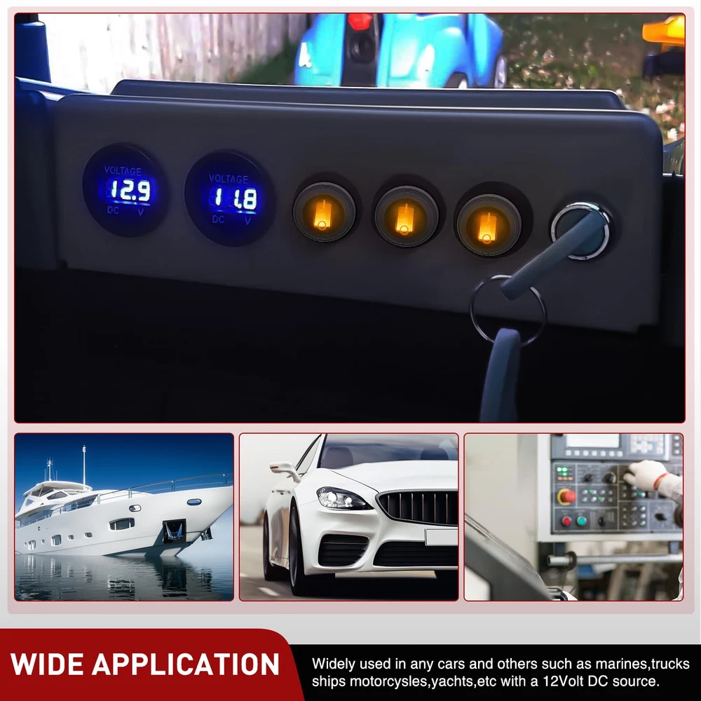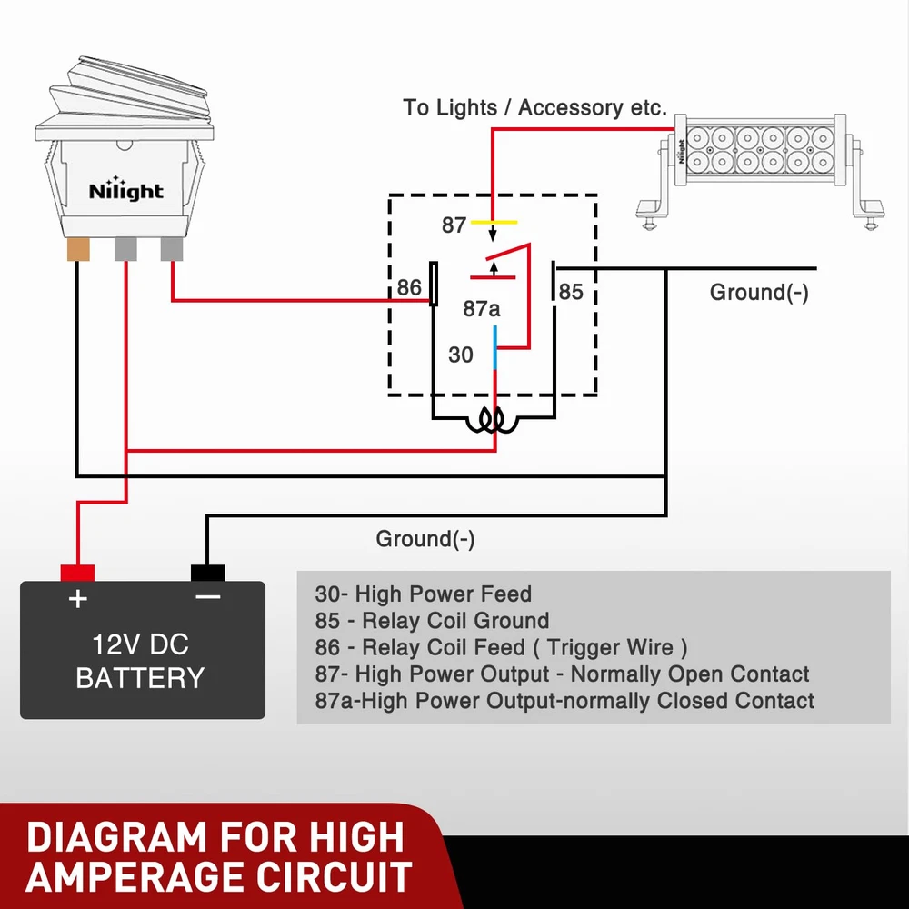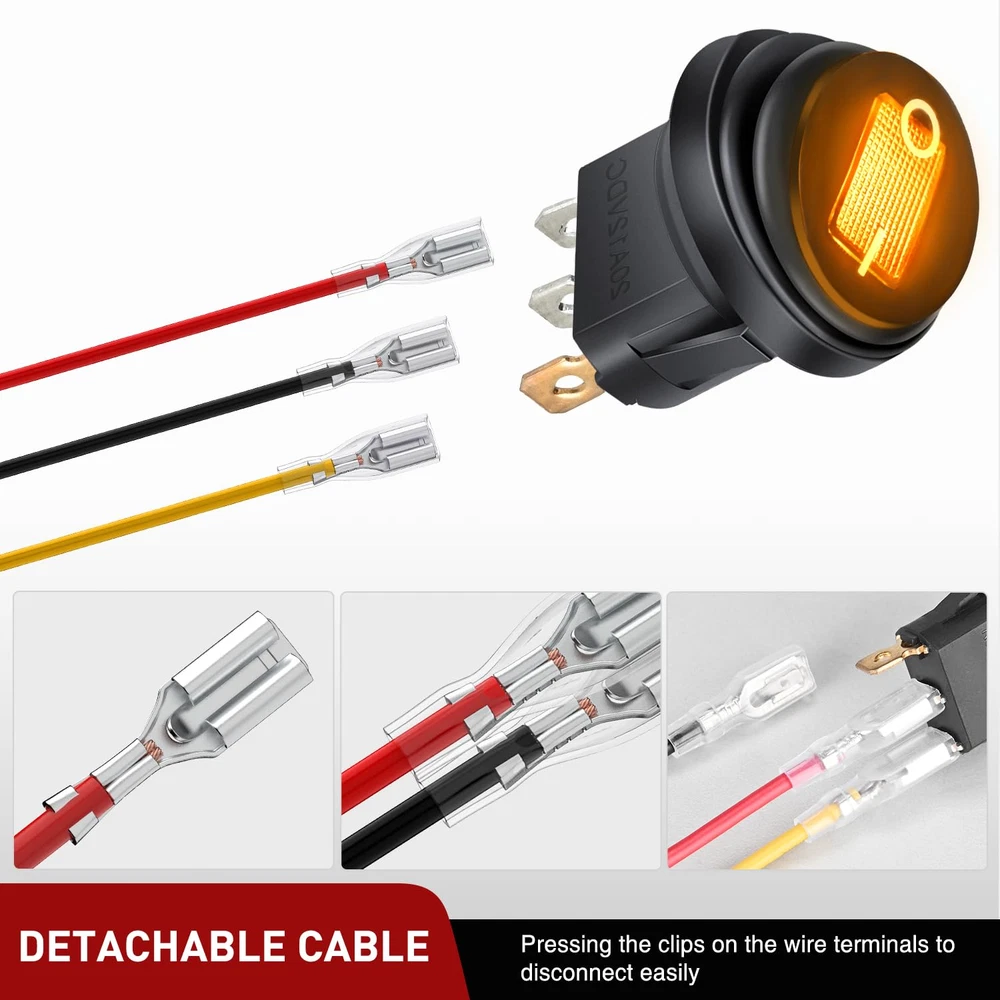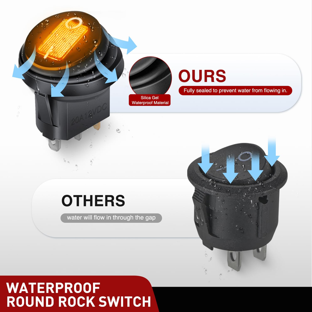 LED Indicator Light: This round toggle switch comes with 12 volt Yellow LED light, so when you turn the rocker switch 12V on, the LED light also lights up at the same time, which could indicates the working status of the device Snap-in Design:The round switch adopts a snap-in design for easy installation,and it have 3 terminals :silver plated brass,longer service life Waterproof: With a rubber cover can be safely used in moist environment, IP65 waterproof performance, so that it can be widely applied to marine, boats, ships, automotive, cars, RVs, trucks, off road vehicles, ATVs, and any others that use a 12V power source Material: The round rocker switches are made of high-quality plastic and good brass conductive pins, The switch has passed our quality inspection. Switching Life: 50000 times Application:This round led rocker switch rated at 12V 20A, which can hold most types of circuits, suitable for Car,Truck, Marine boat, UTVs, ATVs etc Product Description Nilight 12V Yellow LED Round Waterproof Rocker Switch 12V LED Round Waterproof Rocker Switch Specification Polarity: SPST; Type: 3 PINS with Yellow LED; Switch Operation: ON/OFF Switch Rating: 12VDC Hole Diameter:20mm/0.8’’ Material: Plastic, Metal Package includes: 5 Pcs Toggle Swithes with Jumper Wires Features ON-OFF LED Round Switch SPST 3 Prong ON-OFF lighted round rocker switch with 20A 12VDC Rating. LED Indicatior will light up when is turned ON. IP65 Waterproof Rating This waterproof switch can be used in a wet environment, no worry about rain or water anymore, which can be used outdoor and rainy day. Snap-in Design Snap in Design make the switch easy to install. Extruding the plastic part, then Push in to the Panel. Silver-plated Terminals Thickened silver-plated terminals make the switch operate stably under 20A 12VDC. Easy Installation Step 1 Drill a 20mm diameter hole. Step 2 Use the wire connect between the device and switch. Step 3 Insert the switch into the hole. Step 4 Installed successfully. 1 Low Amp Circuit Diagram 2 High Amp Circuit Diagram Wide Application Greatly suitable for most DC 12V-24V cars, UTV/ATV, trucks, trailer, RV, caravan, bus, marine boat, yacht, airplane, etc. Related Prouducts Add to Cart Add to Cart Add to Cart Add to Cart Add to Cart Add to Cart Add to Cart Customer Reviews 4.6 out of 5 stars 549 4.6 out of 5 stars 1,226 4.6 out of 5 stars 4,149 4.6 out of 5 stars 1,226 4.6 out of 5 stars 4,149 4.6 out of 5 stars 1,226 4.6 out of 5 stars 1,226 Price $12.09 $ 12 . 09 $20.25 $ 20 . 25 $8.09 $ 8 . 09 $8.99 $ 8 . 99 $8.09 $ 8 . 09 $10.37 $ 10 . 37 $7.93 $ 7 . 93 Switch Type ON-OFF ON-OFF ON-OFF (ON)-OFF ON-OFF ON-OFF ON-OFF Rated Current 20A 12V DC 5A 12-24V DC 20A 12V DC 2A 12V DC /5A 24VDC 20A 12V DC 20A 12V DC 20A 12V DC Mounting Hole Size 20mm 16mm 20mm 16mm 28.8mm 12mm 20mm Jumper Wires ✔ ✔ ✔ ✔ ✔ ✔ ✔ Rating 12V DC 12-24V DC 12V DC 12-24V DC 12V DC 12V DC 12V DC