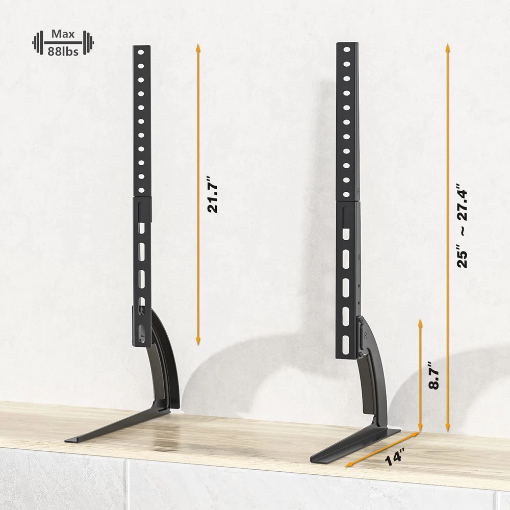 ▶ Brand:5Rcom Universal TV Legs ▶ Specification Data ➊ Suitable for TVs: 22 to 65 inch. ➋VESA pattern:200x100mm/200x200mm/300x200mm/300x300mm/400x200mm/400x300mm/400x400mm/600x400mm/800x500mm(WxH) ➌Maximum Load Capacity: 88 LBS ➍Height Adjustable: 25" to 27.4" ➎This TV feet provide enough space between the bracket feet for audio, DVD players, streaming devices, game consoles and more. ▶ Functional Design ✅This pedestal tv stand is made from heavy duty steel. It is suitable for most brands of TV such as Samsung LG Electronics Sony Sharp Panasonic Philips Vizomax Cello Bush Blaupunkt JVC Hitachi Hisense Goodmans Finlux Toshiba and many others ✅This element tv stand can adjust the TV view height in two steps. First by chosen the different VESA pattern holes at the back of your TV . Second through the three sets holes on the bracket ✅Elevate your electronics in five minutes or less, this stand is easy and quick to assemble.It can replace wall-mounted TV bracket (No need to drill holes in the wall to install) !!Please confirm the TV VESA, Weight, Size specification of your TV before purchasing(see product details images) ! 🍃【COMPATIBILITY】 --This table top tv stand fits most 22 27 32 37 40 42 46 47 50 55 60 65 LCD LED Plasma flat panel TV screens or monitors, compatible with VESA mounting holes on the back of your TV from 200x100mm(8”x4”) up to 800x500mm(31.5”x19.7”). Please check your TV's mounting holes to ensure compatibility before purchasing. 🍃【HEIGHT ADJUSTABLE】--This tv base stand has 3 levels height adjustments from 25" to 27.4" to make your TV always at eye level for better view. Middle section unscrews to form a perfect solution for small TV. 🍃【NO SCRATCH & ANTI-SLIP】-- It's great that the tv replacement stand comes with soft pad on the bottom to protect the furniture from being scratched and protect your TV from slipping. 🍃【EASY TO ASSEMBLE】-- Simple construction allows easy installation with easy to follow manual and all of the required hardware provided. 🍃【STRONG & STABLE】--Heavy Duty Sturdy steel design make the universal tv legs load capacity up to 40 kg (88 lbs). Should you have any concerns, our friendly customer support team will be happy to help you and reply you within 12 hours.