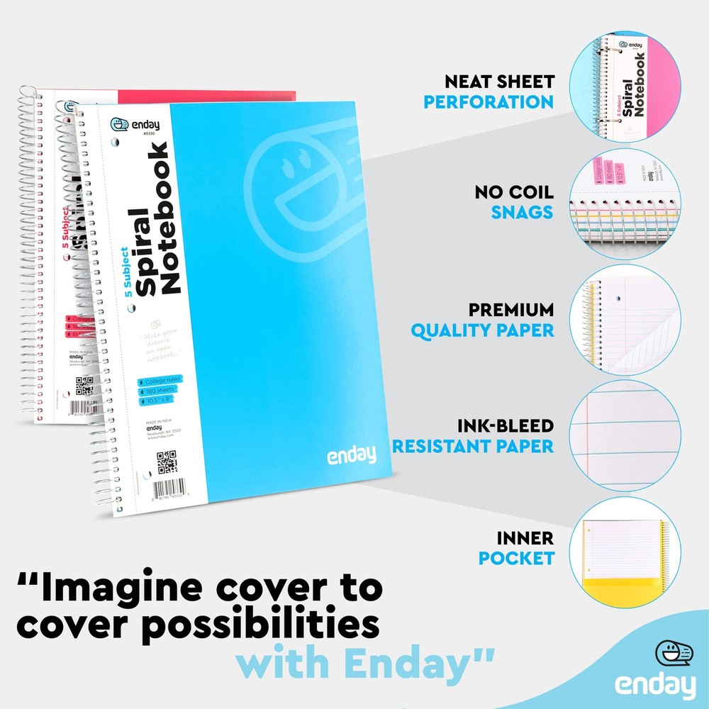 5 Subject Notebook Spiral w/ 180 Sheets of College Ruled White Paper (4/Pack) The Problem: You need to take notes in your class and for effectively , you need to have a good quality notebook with you. But , you do have one with you which is creating a lot of problems for you and your work is stuck. You have a notebook with you but the binding is not good at all and there are chances that the pages of the notebook can come off. This is the reason as to why the product is not a suitable one for use. Our Solution: Our spiral notebook college ruled 5 subject is the ideal thing you need in this situation for the purpose of taking notes in your class. Now, when you have a good quality notebook, you would not face any kinds of problems to complete your work. Our spiral notebook College Ruled is spiral bound which binds the sheets of pages appropriately so that they do come out thereby making the product perfectly suitable for the users. Pack of 4 The 5 subject notebook spiral is available in a pack of4. Contains 180 Sheets The spiral notebook College Ruled comes with 180 sheets in total. Being available w/ 180 sheets in each of the notebooks, it provides a lot of writing space and eliminates the need of frequent buying. Size of the Notebook Suits the Requirements The size of the spiral notebook College Ruled is 10.5 " x 8 " which is just ideally suited for the intended purpose of use Spiral Bound The notebooks are spirally bound. Being spirally bound, the pages do not come off easily and hence, a preferred choice of every user. College Ruled Being college ruled, it becomes easy to use. Multipurpose Use The spiral notebook college ruled 5 subject is readily used at schools, colleges, offices and a number of other similar places. ✓ The 5 Subject Notebook Spiral with 180 Sheets of College Ruled White Paper - Set Includes: Red, Black, Purple, Blue Covers (4 Pack) is a great product for the purpose writing all important notes, assignments, information, and other similar things. Most importantly, the spiral notebook is college ruled and thus is great for writing purposes which is quite helpful for the users. ✓ SPECS: Our 5 subject notebook spiral comes with the appropriate size of 10.5 inches in length and 8 inches in width. The perfect size makes the product ideally suited for the intended purpose of use thereby making it even more convenient for the users. The notebook is spirally bound and hence the pages stay in place. ✓ QUALITY: Our 5 Subject Notebook Spiral is of the premium quality which does not give any of the users even a single chance to complain. In an addition to this, the quality of sheets of paper of the notebook is also great and offers enough space for writing. ✓ DESIGN: The manufacturers have given the spiral notebook college ruled 5 subject the perfect design so as to make the product ideal for the intended purpose of use. The design necessarily meets all the requirements of the users at its best. ✓ USES: The spiral notebook College Ruled is readily used at colleges, offices, schools and a number of other places where there is a need of writing.