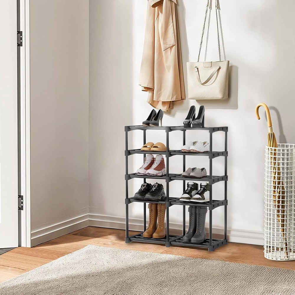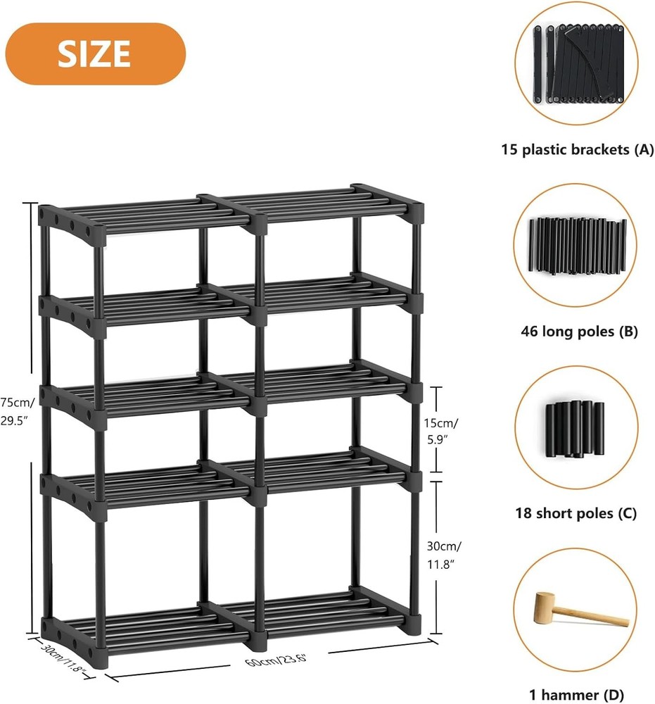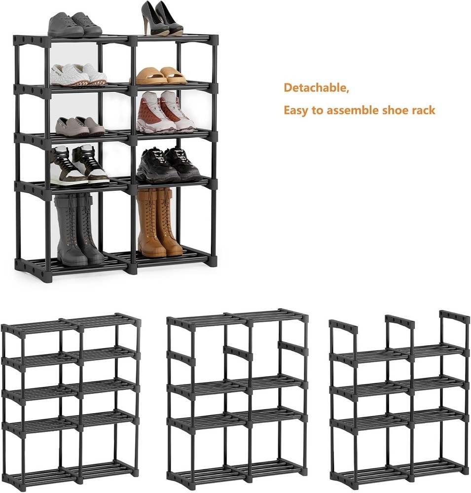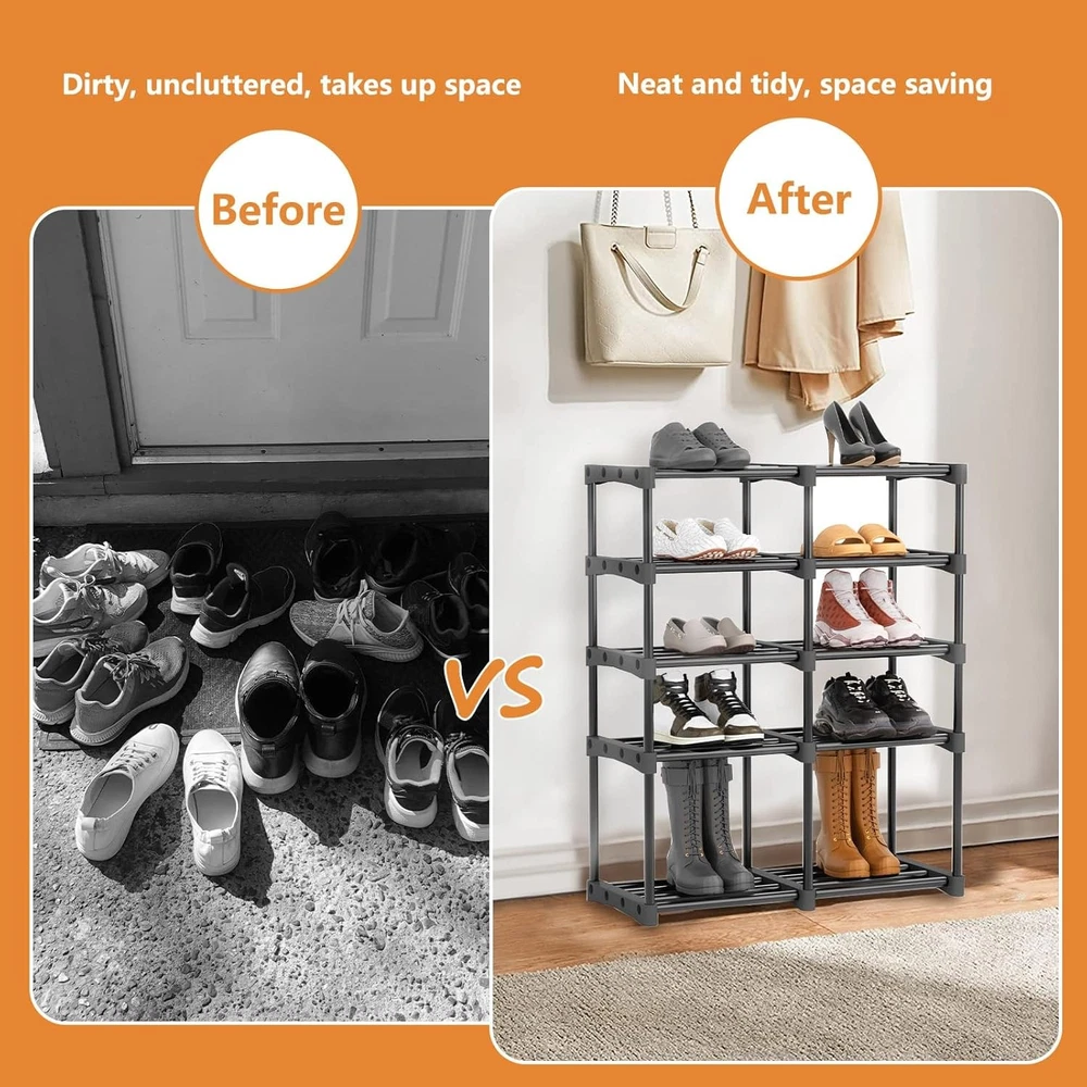 This shoe rack is a game-changer for keeping my entryway tidy! The sturdy metal frame holds all my shoes without wobbling, and the five tiers easily fit everything from sneakers to boots. The black finish looks sleek and doesn’t show wear. Love how much space it saves—perfect for small closets or tight corners. Highly recommend for anyone needing durable, spacious shoe storage!