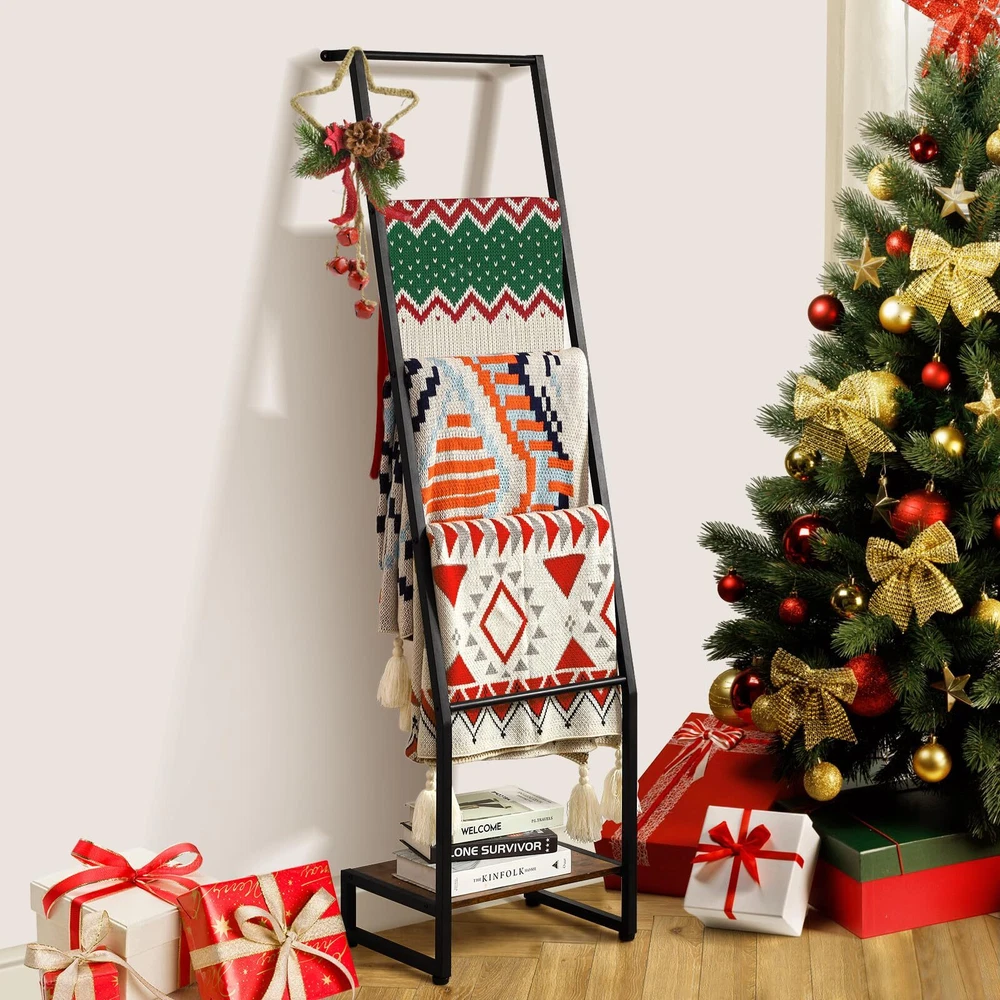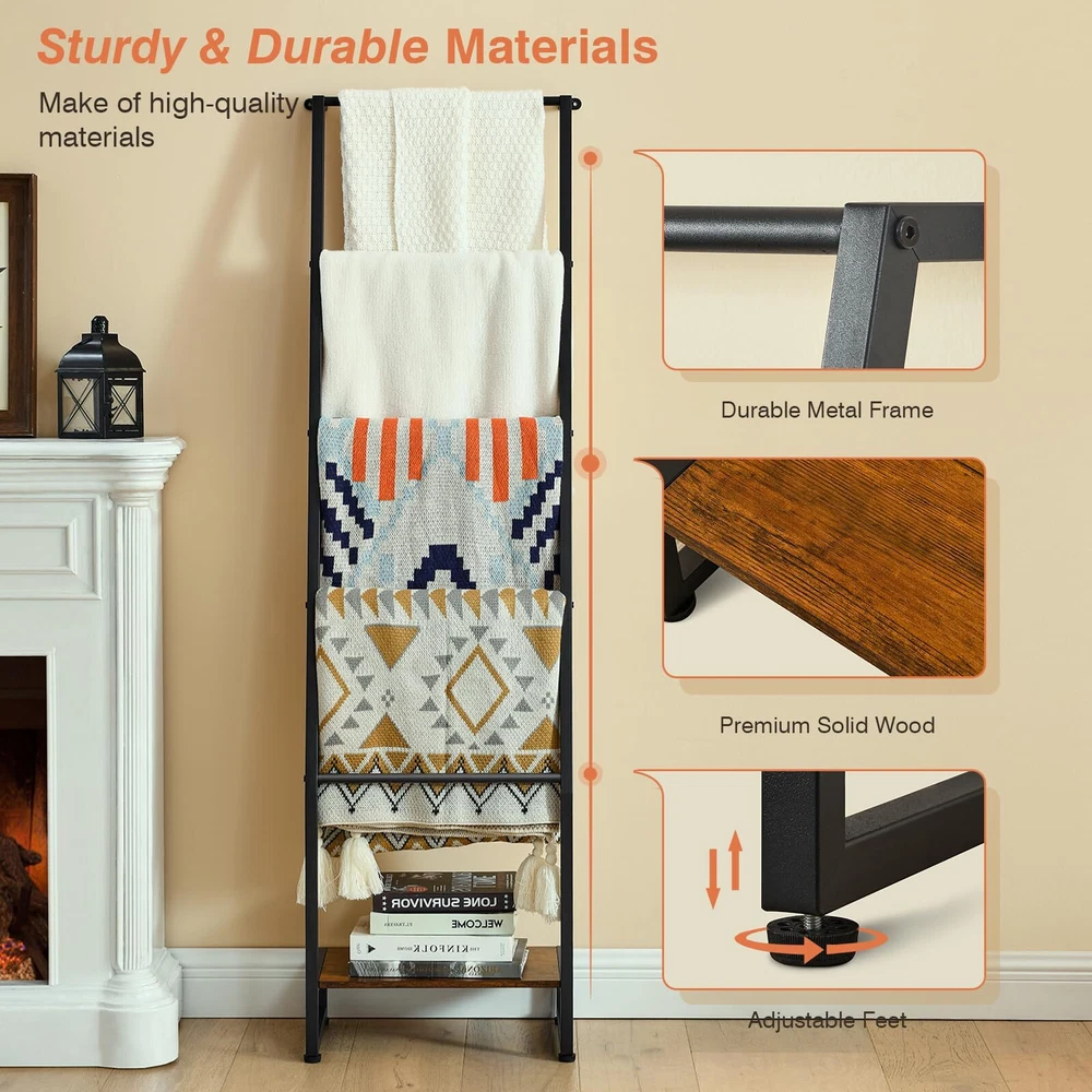 5-Tier Blanket Ladder: Wooden Storage Rack, Rustic Brown & Black, Living Room