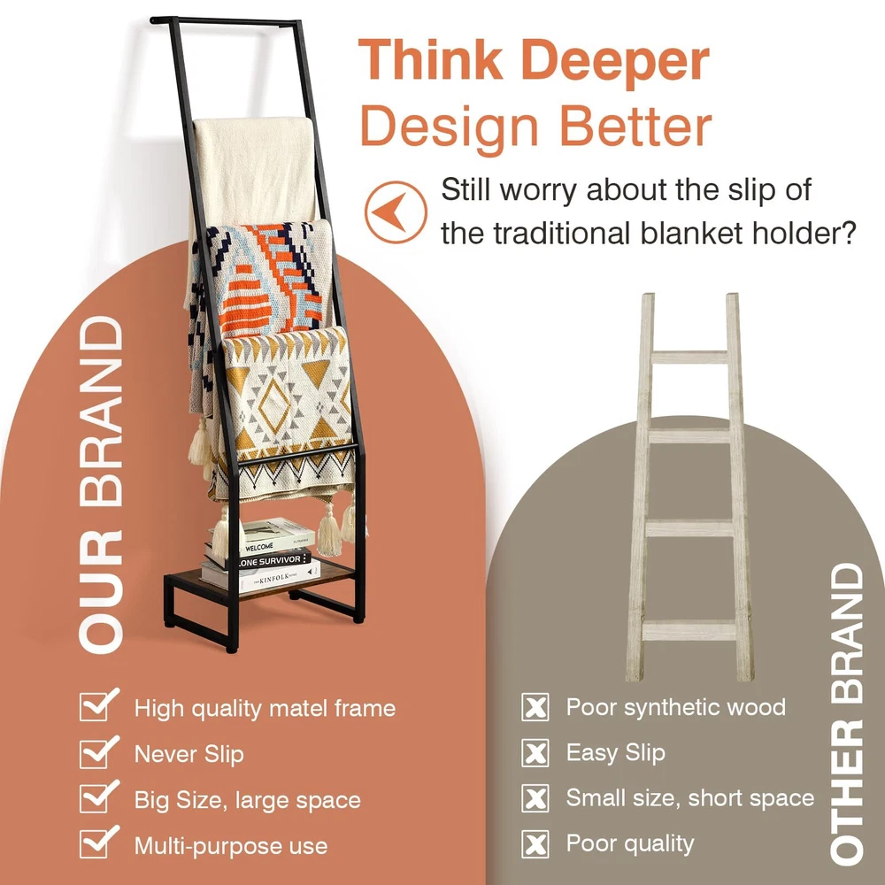 【Maximizing Space】DGWJSU blanket ladder size is 63" high and 17.7" wide. Suitable for placing at any corner of your room which will not take too much floor space. Large capacity with 5 tiers ladder shelf is the perfect choice for storage in your living room, bathroom, or bedroom 【Think Deeper, Design Better】Still worry about the slip of the traditional blanket holder? Our ladder blanket holder is made of high-quality metal and a rustic wood base. The top of the towel ladder can also be screwed to the wall and has a sturdy structure. The wooden base maintains the stability of the rack, and the metal shelves can hold the weight better without worrying about splintering 【Easy to Assemble】DGWJSU blanket ladders for the living room come pre-drilled including installation and the tools are in the blanket rack package. Every shelf is drilled, also with easy-to-follow instructions, you can easily put this blanket holder together without much effort 【Aesthetics & Utility Home Decor】Not only is a ladder shelf for storage blankets, but also suitable for towels and quilts without taking up too much floor space. The blanket holder is great for living room blanket storage and bathroom decor, it can serve as a decorative item while also being practical, and suitable for various scenarios such as bedrooms, balconies, etc 【Ideal Gift】 This ladder blanket holder makes an ideal gift for special occasions such as housewarming parties or weddings, or as a thoughtful gift to your family. If you have any issue with DGWJSU blanket ladder, feel free to contact us at any time