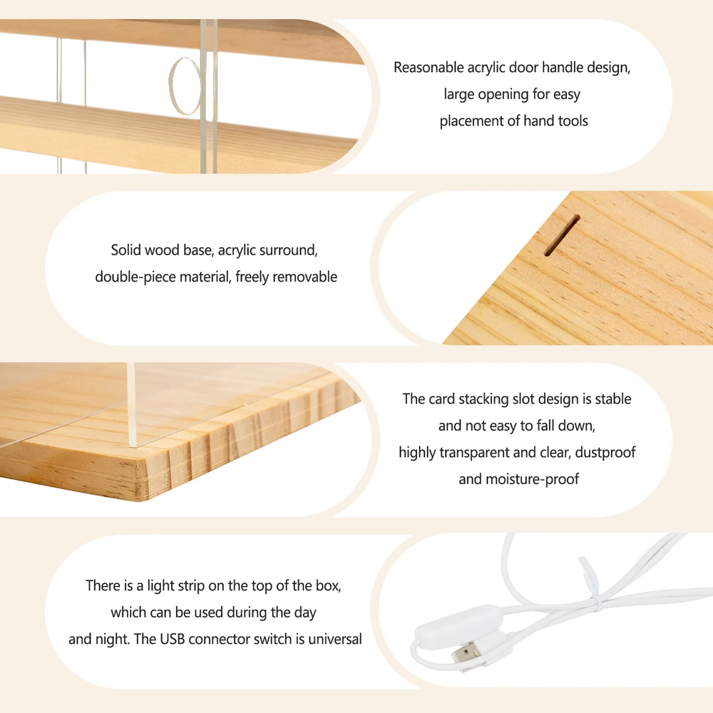 Key Features Sturdy and Durable: It is mainly made of high-quality acrylic and solid wood, the surface is treated with a polishing process, which is rust-resistant, scratch-resistant, sturdy, and durable, ensuring a long service life. Upgraded Atmosphere: The warm LED strip not only provides a soft lighting effect at night but also creates a warm and comfortable atmosphere, making the garage kit more vivid and charming in the light. Storage Assistant: The large-capacity display box(12.6*12.6*12.68in) can store five layers of small items, and the sealed design can effectively prevent dust, providing a comfortable home for your small figurines while keeping your desktop tidy. Humanized Design: The stepped shelves allow you to dismantle and reassemble as needed, so you can not only use it 5-Tier Clear Acrylic Display Case Display Box 12.6*12.6*12.68in w/ LED Light Welcome to our store~ Description A high-quality display box not only provides great display effects but also enhances your home style. The high transmittance acrylic cover with gentle warm light creates a warm and comfortable atmosphere, making your figurines more vivid and charming. The detachable partitions make it more flexible to use. You can create different display effects according to your needs! Key Features Sturdy and Durable: It is mainly made of high-quality acrylic and solid wood, the surface is treated with a polishing process, which is rust-resistant, scratch-resistant , sturdy, and durable, ensuring a long service life. Upgraded Atmosphere: The warm LED strip not only provides a soft lighting effect at night but also creates a warm and comfortable atmosphere, making the garage kit more vivid and charming in the light. Storage Assistant: The large-capacity display box(12.6*12.6*12.68in) can store five layers of small items, and the sealed design can effectively prevent dust, providing a comfortable home for your small figurines while keeping your desktop tidy. Humanized Design: The stepped shelves allow you to dismantle and reassemble as needed, so you can not only use it to display small collections, but can also remove the shelves to provide spacious display space for larger collections. Moreover, a round hole makes opening doors more convenient and efficient. Aesthetic Appearance: The simple and fashionable design not only allows it to clearly display your collection but also serves as a part of home decoration, enhancing the taste and style of the living space. It is an ideal accent for your study, living room, or bedroom. Simple Installation: The simple product structure and comprehensive installation parts make the product quick to install in just a few steps. Easy to Clean: The removable design and smooth surface make the product easy to clean with a damp rag. Ideal Gift: This product combines practicality and aesthetics, making it an ideal gift for friends, relatives, or colleagues who enjoy collecting during holidays or birthdays. Protective Package: To prevent the product from being damaged and bumped during transportation, we packed it with foam and cartons to protect your products to the maximum extent possible. Customer Service: Communication is the best way to solve problems. If you have any problems, please feel free to contact us. We will reply and solve the problem for you as soon as possible. Details Smooth Edges: The smooth edges can help you avoid scratches during use, thus providing you with a higher level of safety. Convenient Switch: The light switch is controlled by the button, and it will light up when you press the buttom lightly. You can turn it off during the day to save power. USB Cable: The 4.27ft long cable can provide you with more usage positions and make it more convenient for display. Large Opening: It is convenient for you to place figures models, blind box ,collectibles, dolls, or crafts. Application It can be used in homes, shopping malls, exhibition halls, offices, etc. It is suitable for placing on desks, office desks, dressing tables or bedside tables to display and organize small statues, character models, lipstick, dolls, jewelry, collectibles, handicrafts, etc. Specification Material: Acrylic, Solid Wood Color: Clear Process: Polish Style: Modern Light Type: LED Light Color: Warm Number of Stepped Shelves: 5 Assembly Required: Yes USB Cable Length: 1.3m/4.27ft Product Size: 32*32*32.2cm/12.6*12.6*12.68in Package Size: 32*29*26cm/12.6*11.42*10.24in Gross Weight: 2kg/4.41 lbs Net Weight: 1.9kg/4.19 lbs Package Included 1 * 5-tier Display Box Notes We sincerely recommend that you use it to store non-heavy items. Please note that the display items are not included. Before use, remember to remove the protective film on both sides of the acrylic panels to ensure your exhibits are clearly visible in this display box. Please allow the slight color difference caused by the shooting light and the 1-3 cm error due to manual measurement, and make sure you do not mind before ordering. Payment Delivery details Terms of sales About us Contact us Payment We accept ebay payment 。 Fees such as import duties, taxes are not included in the item price or shipping costs. These charges are the buyer's responsibility. Delivery details Shipping: 2-9 working days to: USA Terms of sales We maintain high standards of excellence and strive for hundred percent customer satisfaction. Feedback is very important to us. We hope that you contact us immediately before you give neutral or negative feedback, so that we can address your concerns. It is impossible to address issues if we do not know about them! About us Your satis faction is our ultimate goal. We work hard to earn your trust and future business. Our certified technicians have tested each item before shipping. The unit comes with 1 year limited warranty on all manufacturing defects. a) If you receive a defective item, you may return it or ask for a discount. Please contact us within 14 days after you receive the package. b) What you returned mu