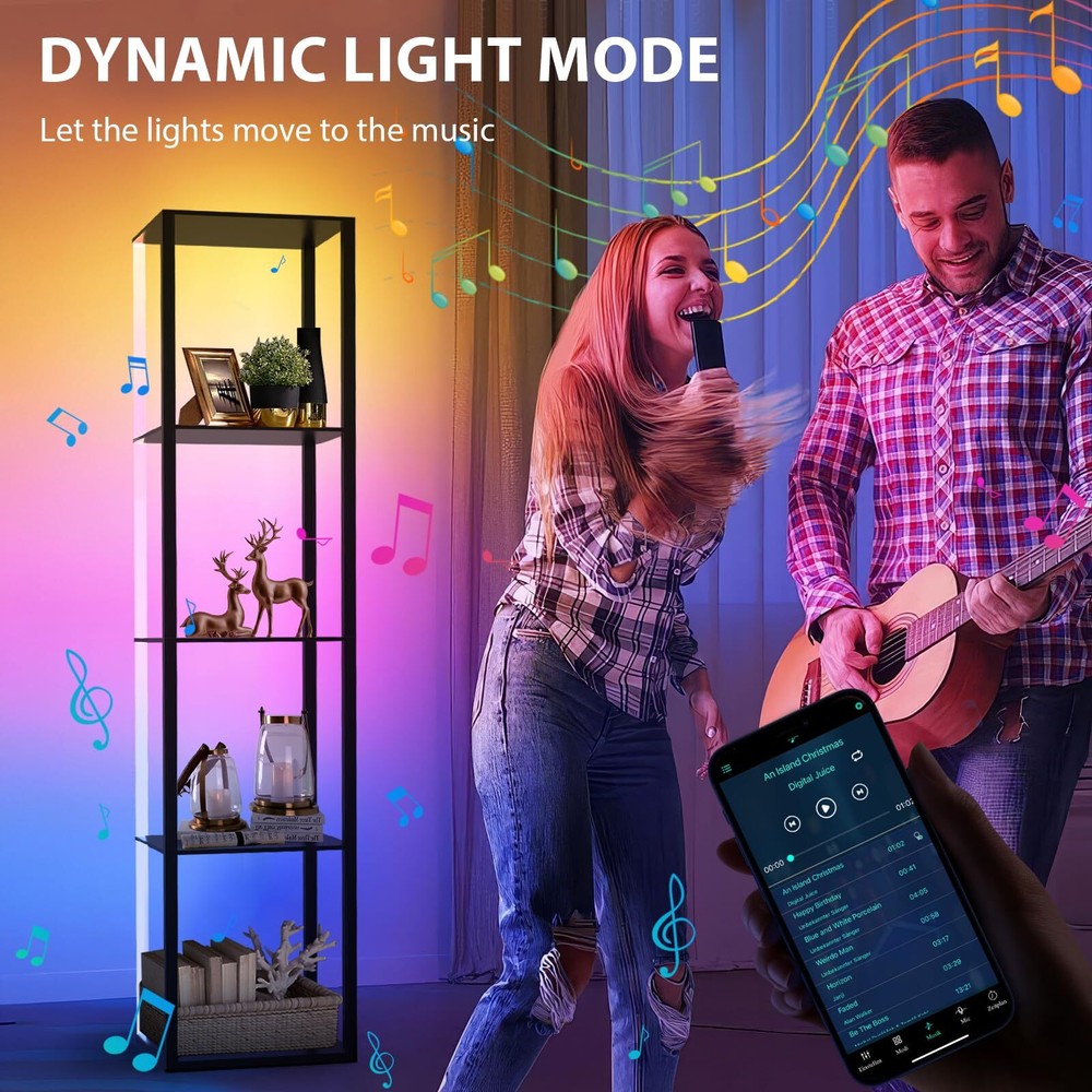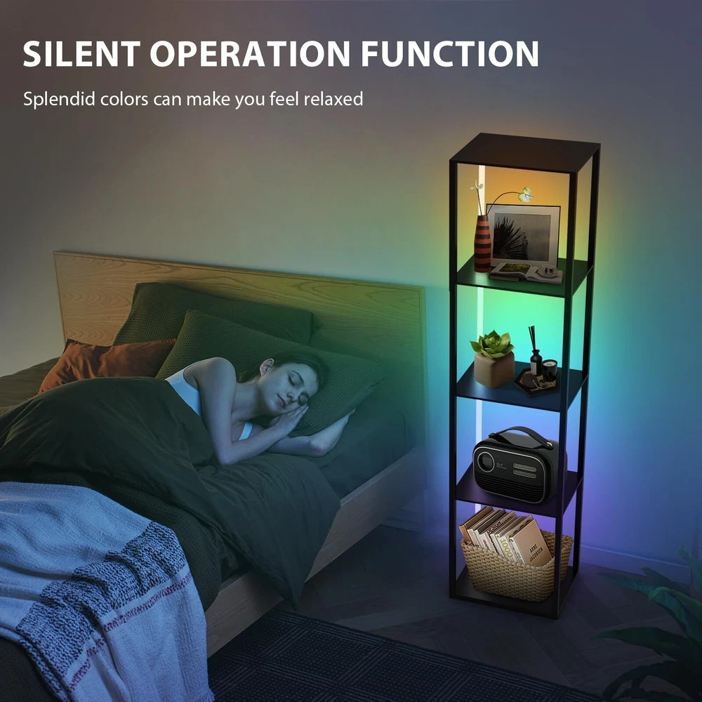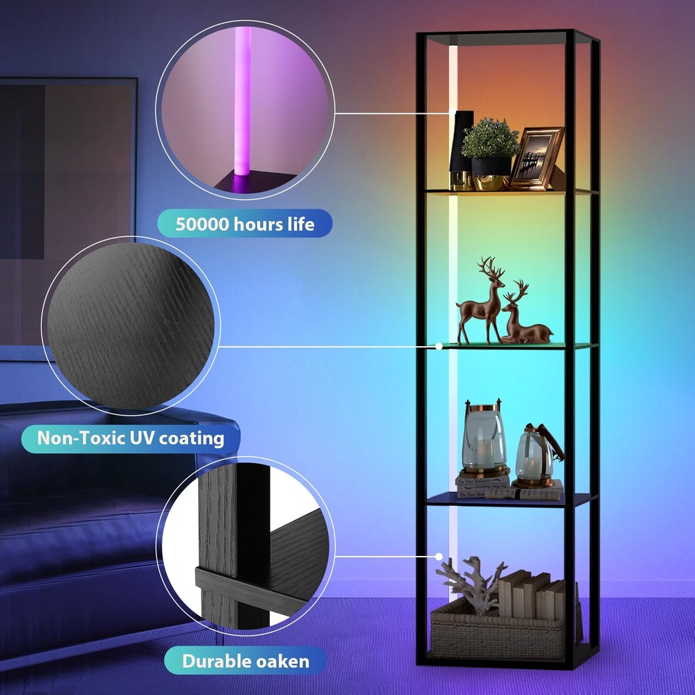 1 3 in 1 Floor Lamp with Corner Shelves:Cleverly integrates color-changing lighting, storage, display.Our display shelf with lights has 60000 RGB multi-color lighting color .5-Tier corner bookshelf with lights can be used as a display rack for statues,memorabilia,plants, books, collectibles, decorations etc,Decorating your bedroom , living room,playroom Remote Control & APP Control LED Light: Offering built in music mode and microphone on APP, the light colors change and flash in sync with the rhythm of music.Turn on/off/timer through it effortlessly, adjust the color and temperature Stability&Storage Corner Shelf Display:It can hold up to 65lbs.The corner display shelf's rectangle upgraded design allows the corner stand to stand smoothly free or flush against the wall,fitting seamlessly into random nooks and crannies. It comes with anti-toppling fittings to anchor it to the wall for safe use.Dimensions of this corner shelf are 15.74" x11.81" x 63.77" when fully assembled Safe and easy to assemble:The surface of lighted display case is coated by advanced UV treatment---odorless and safe which friendly to your children and pets Customer Service & No Worry Purchase:The floor lamp will last 50,000 hours life. If you encounter any problems for using this corner shelf lamp, please directly contact us,'s mission is to be responsible for you to the end