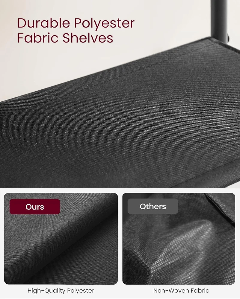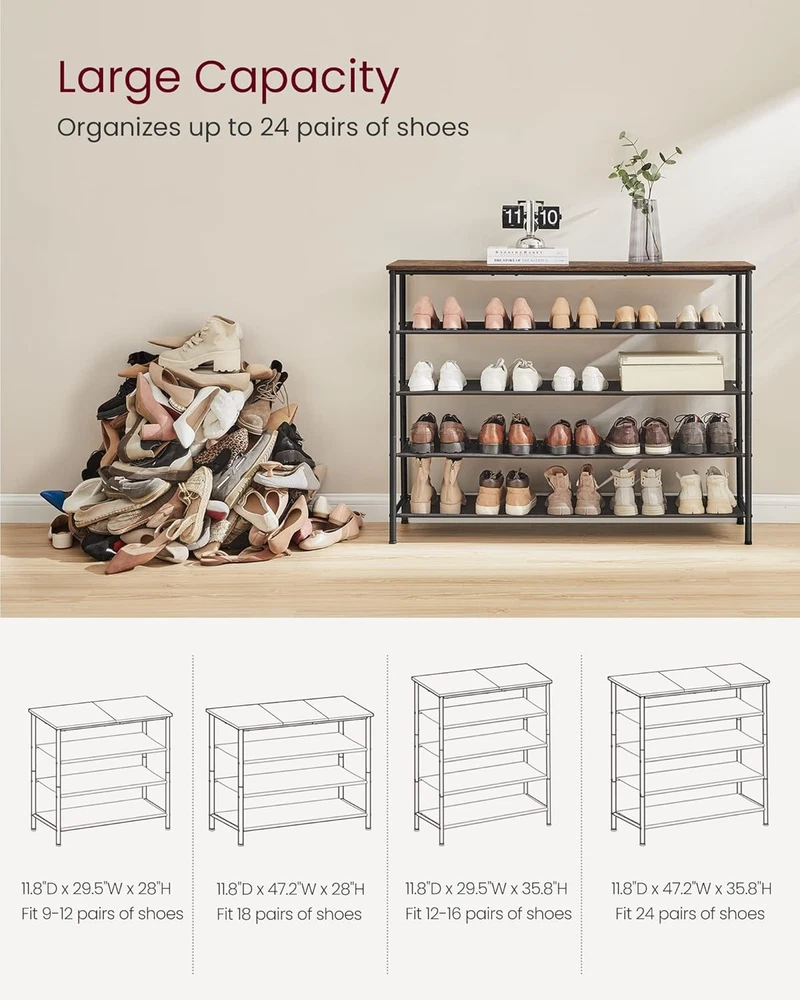 [Large Capacity] This 11.8"D x 47.2"W x 35.8"H shoe rack can hold up to 20 pairs of men's shoes or 24 pairs of women's shoes. The distance between each of the 4 polyester fabric shelves is 7.9" to fit heels and high tops on the shelves [Versatile Storage Shelves] Put this shoe shelf wherever you need extra storage space. In the entryway? In the dressing room? In the bedroom? All no problem! It is also suitable for apartments and dormitories. A real all-rounder! [Sturdy and Stable] A sturdy steel frame, alongside adjustable feet, keeps the shoe rack balanced on uneven floors. The Max load ability of the top is 66 lb with each shelf bearing up to 22 lb. The included anti-tip kit secures it to the wall for added safety [Easy to Assemble] Thanks to detailed instructions and clearly marked parts, you can assemble this shoe rack for entryway in no time and the great "shoe clean-up" can begin! [What You Get] A shoe organizer with 4 fabric shelves, illustrated instructions, an assembly bag, and an attractive industrial design to add more charm to your entryway