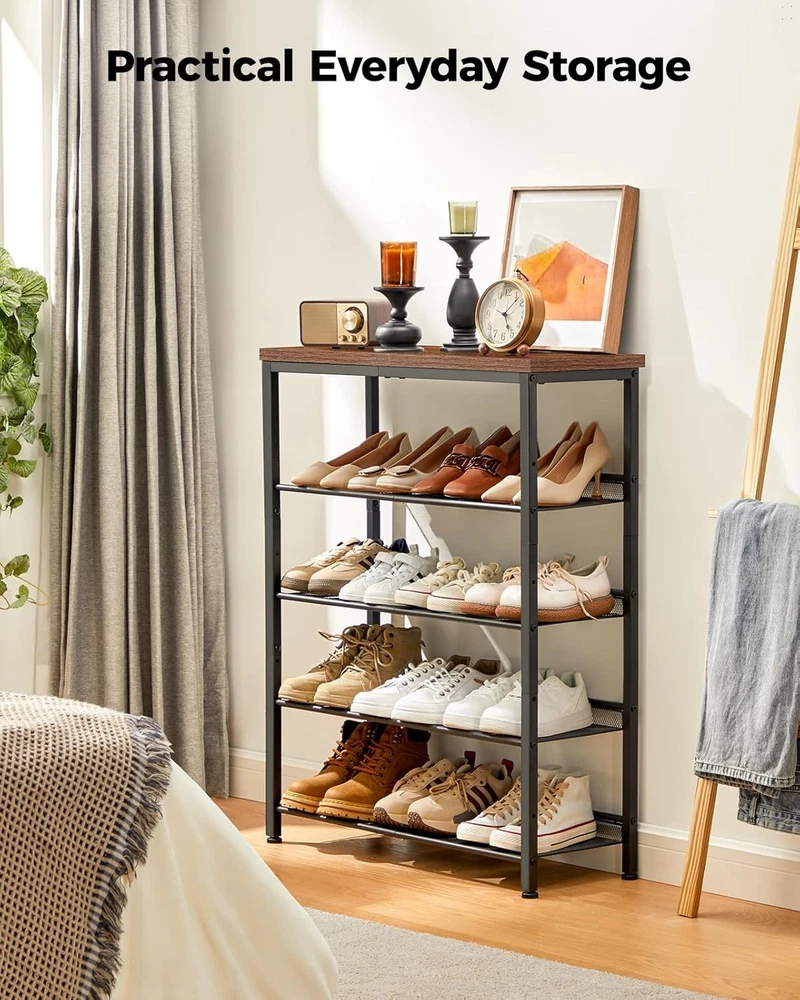 Love this shoe rack—sleek, sturdy, and perfect for small spaces! Holds all my shoes neatly, and the wooden top adds a stylish touch. The 2-in-1 design is so versatile—I use it for bags and books too. Fits perfectly by my front door without taking up much room. Super easy to assemble and looks way more expensive than it is. Highly recommend for anyone needing extra storage!