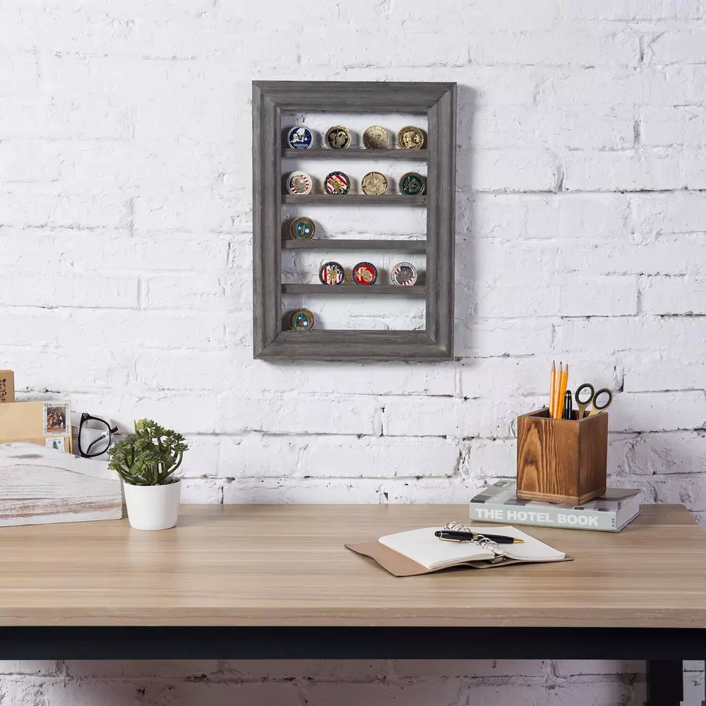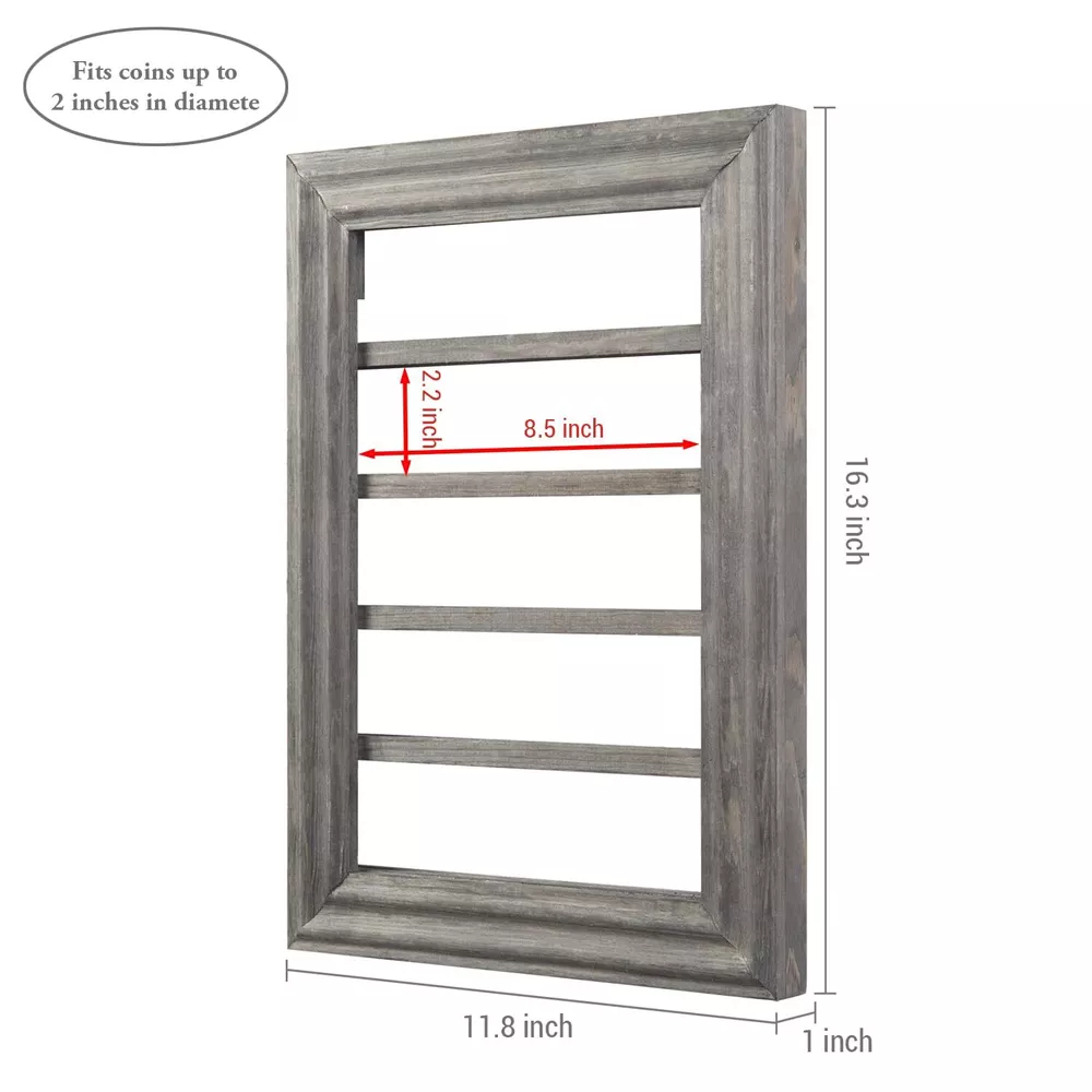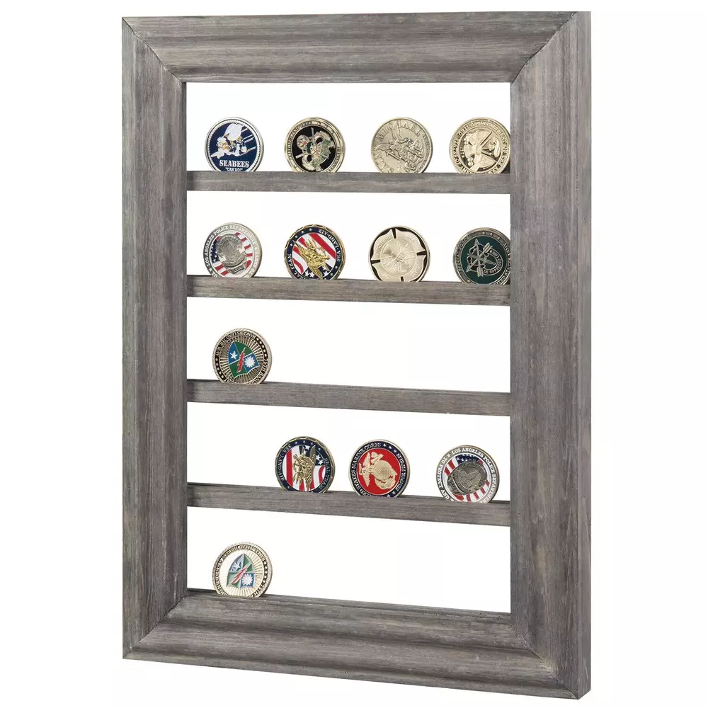 5-Tier Wall-Mounted Challenge Coin Holder Display Rack in Vintage Gray Pine Wood Wall-mounted 5-tiered wooden display shelf for showcasing casino antique medallions, chips, challenge, and collectible coins **Coins not included** Perfect for use as a decorative display in your home entryway, foyer, hallway, living room, or bedroom Pinewood construction with a vintage gray finish complements any decor Two keyhole brackets allow you to easily mount to most wall surfaces with proper mounting hardware (not included) Approximate Dimensions: Overall - 11.75 W x 1.0 D x 16.25 H; Between Shelves - 2.25 H (in inches) Shipping We offer FREE shipping on all orders! We ship within Three business days of payment, usually sooner. We use a selection of shipping services such as UPS, FedEx, USPS etc. We only ship to the lower 48 states, no APO/FPO addresses or PO Boxes allowed. Local pickups and combined shipping options are not provided at this time. Return You can return a product for up to 30 days from the date you purchased it. Any product you return must be in the same condition you received it and in the original packaging. Please keep the receipt. Payment We accept payment by any of the following methods: PayPal Please pay as soon as possible after winning an auction, as that will allow us to post your item to you sooner! Feedback Customer satisfaction is very important to us. If you have any problem with your order, please contact us and we will do our best to make you satisfied. Contact Us If you have any queries, please contact us via ebay. We usually respond within 24 hours on weekdays. Please visit our eBay store to check out other items for sale! Thank you for shopping at our store.